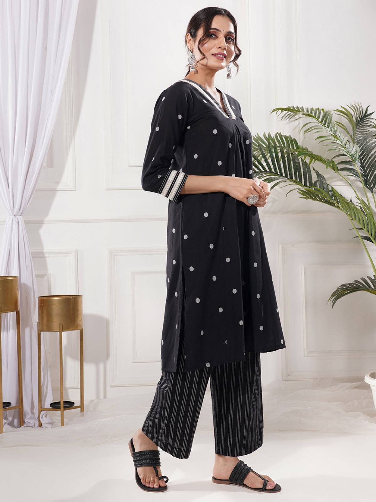Elegance meets effortless comfort in our Rajni black cotton kurta from Saanjh collection. Designed with a graceful A-line silhouette, this kurta flatters every body type. The delicate lace detailing adds a soft, feminine charm, making it perfect for festive evenings, intimate gatherings, corporate wear or elevated everyday styling. The thoughtfully designed V-neckline. 3/4th sleeves give it a refined, timeless appeal. Made using premium cotton, which keeps you cool from dawn to dusk, whether paired with palazzos, straight pants or denim, this kurta is the versatile black essential every woman must own.