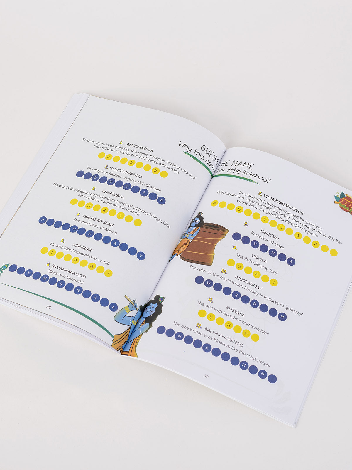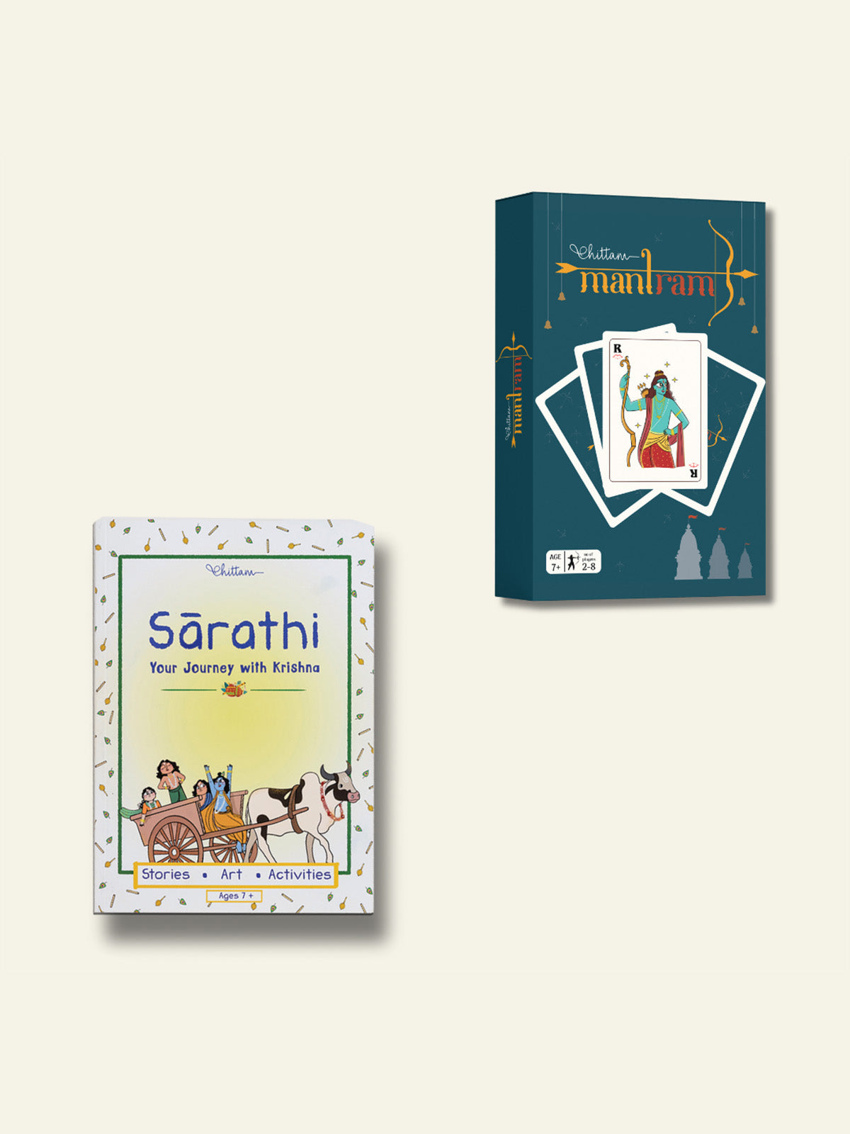 Experience the divine journey with the "Hare Rama Hare Krishna" combo, featuring two engaging products. Sarathi is an interactive activity book that immerses children and adults in the world of Lord Krishna through captivating stories, puzzles, and artwork. Complementing this is Mantram, a fast-paced card game designed to make shloka-learning enjoyable, sharpening memory and cognition while fostering a deep appreciation for our rich heritage. Together, these products offer a fun and educational experience for both children and adults.