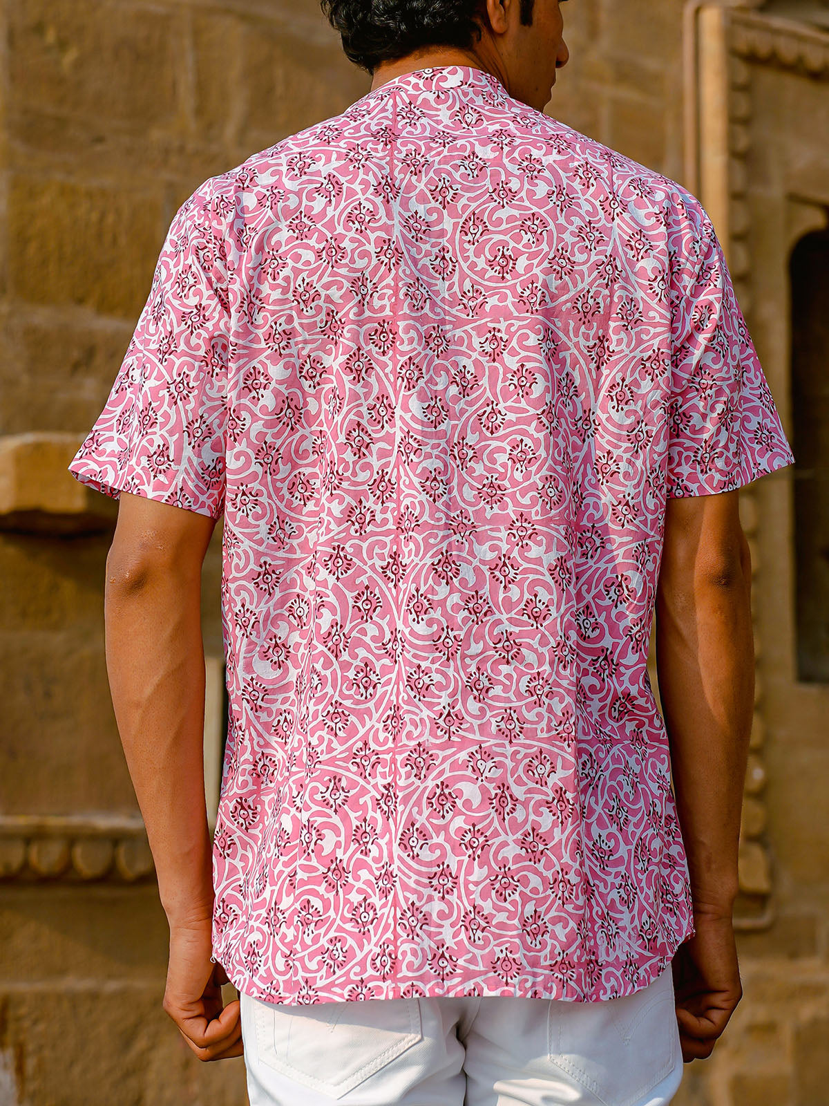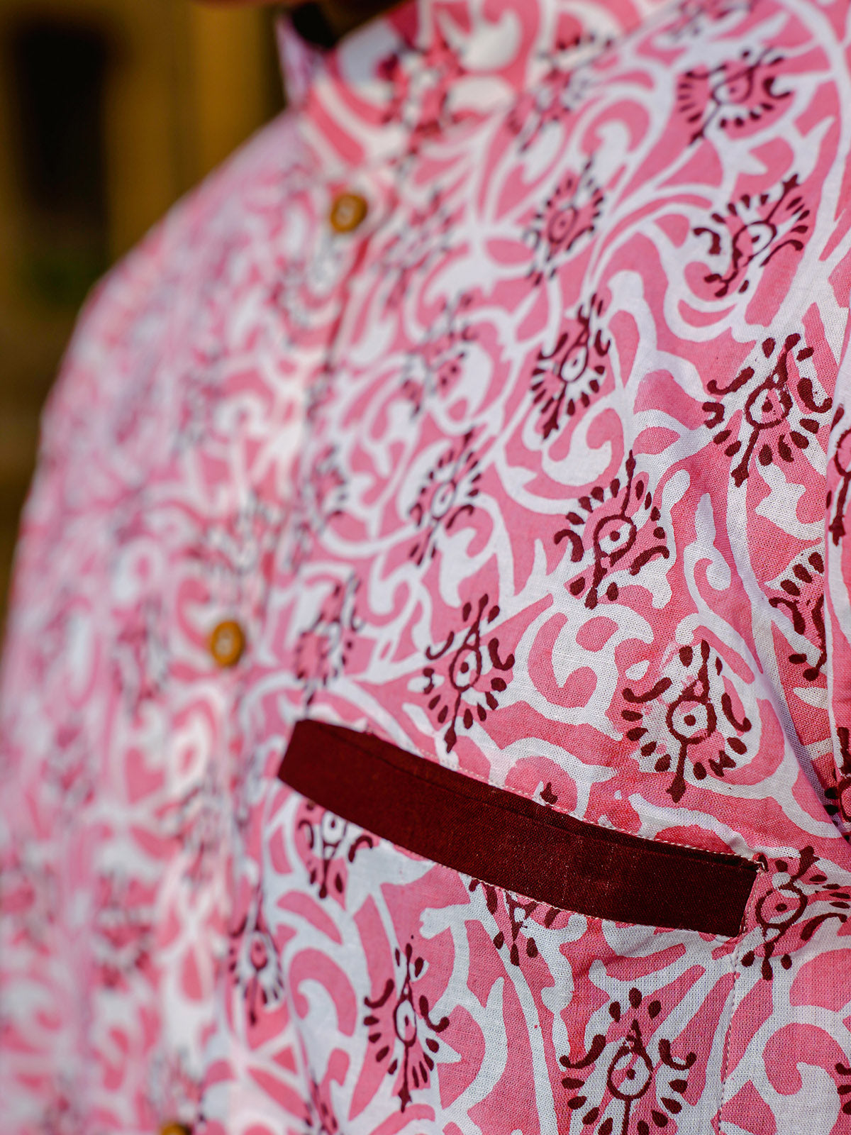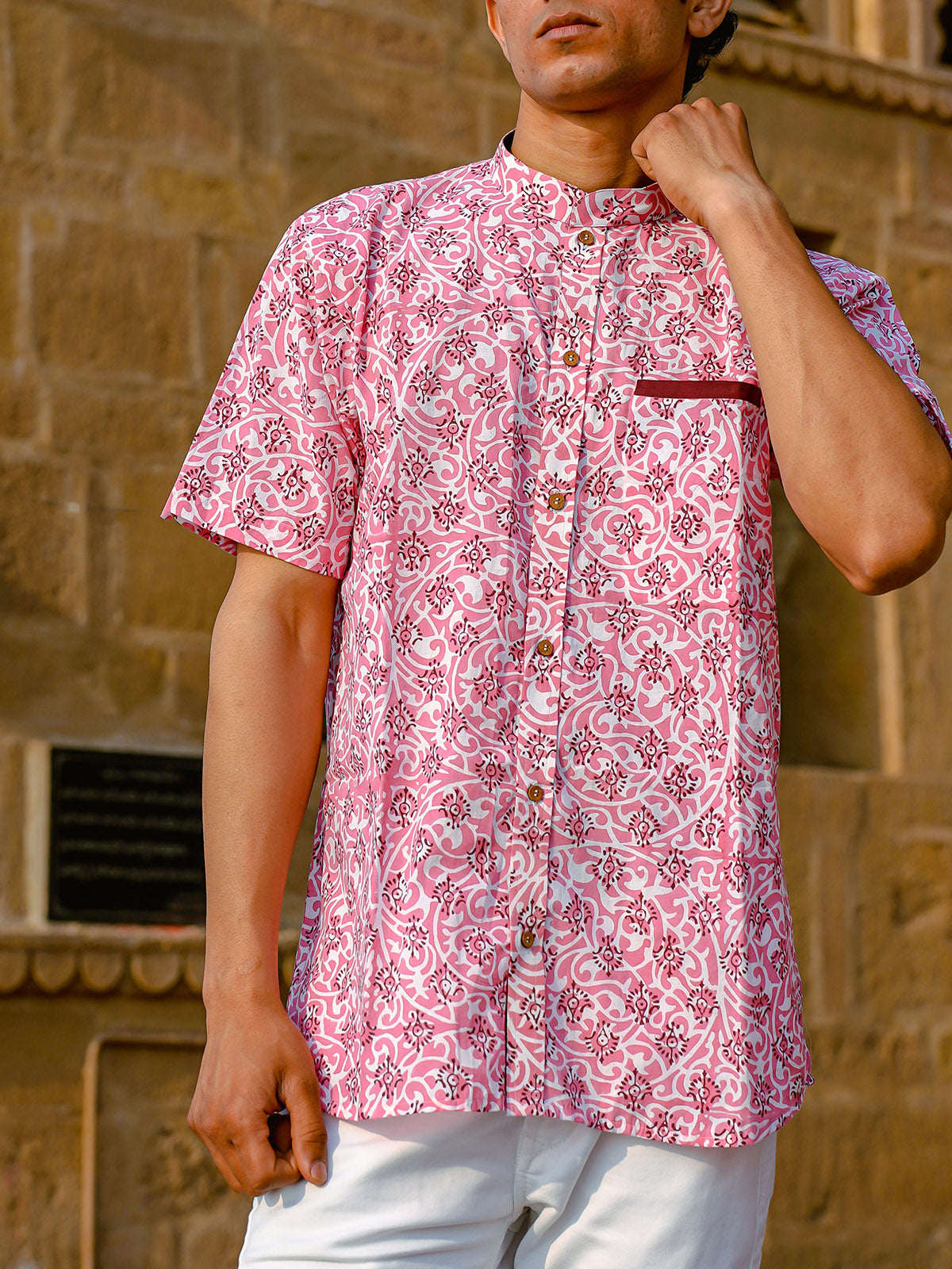 Embrace breezy elegance with the handcrafted Palmette Handblock Shirt. Made in India from eco-friendly materials, this relaxed-fit shirt features soft cotton adorned with traditional Rajasthani hand block prints. Delicate palmette motifs add timeless charm, while the classic band collar, welt pocket, and half sleeves provide effortless style for warm Working Days. Pair it with crisp white or dark denim for a sophisticated and sustainable look. Support artisanal traditions with this unique piece that embodies slow fashion.