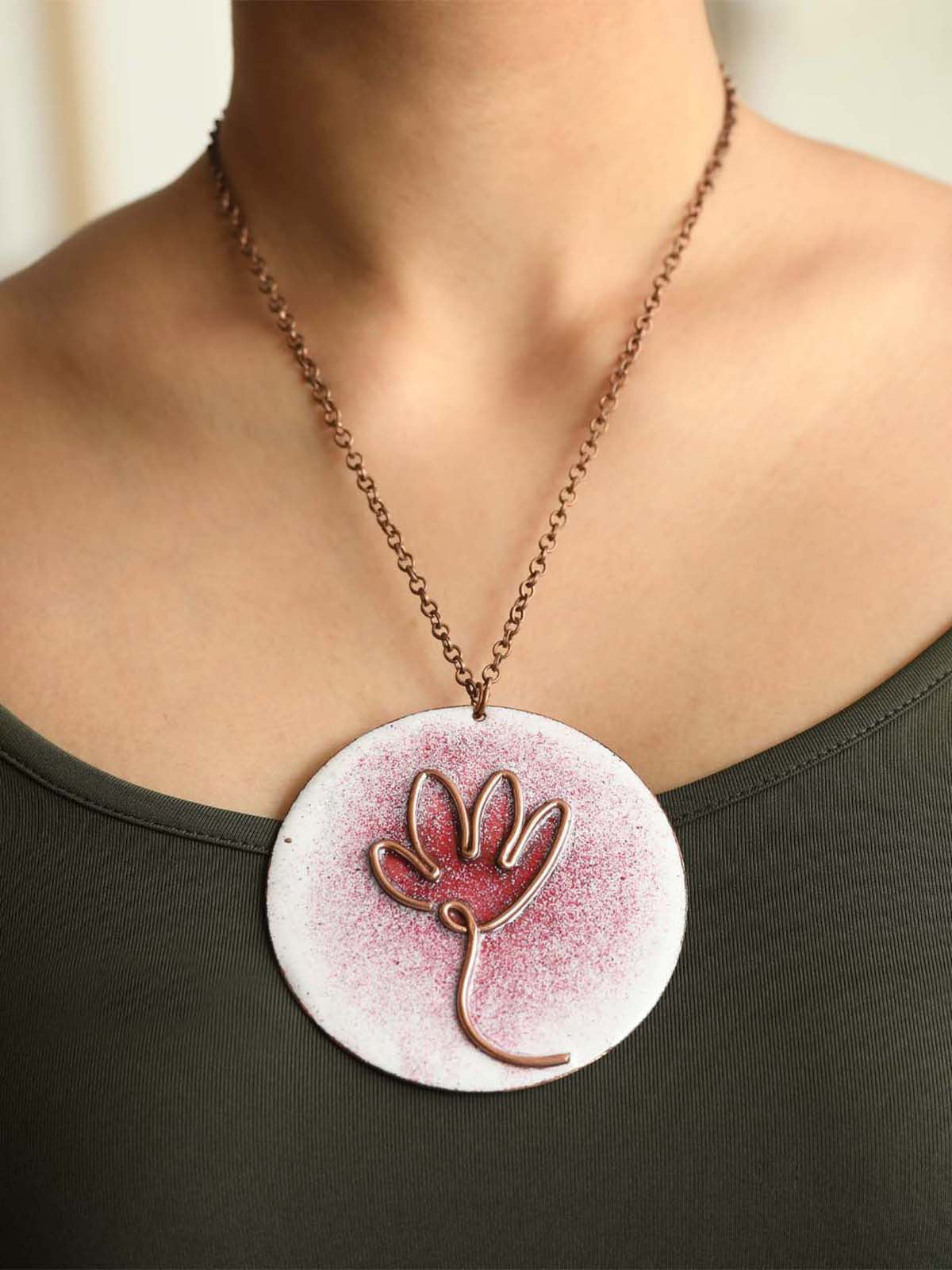 This statement necklace is designed by Akshita for EkiBeki and is inspired by the elements of nature. It is handcrafted in Copper Enamel. This glass enamelling not only lends its vibrant colors to the copper surface, but also prevents it from oxidising, thereby rendering it more usable.