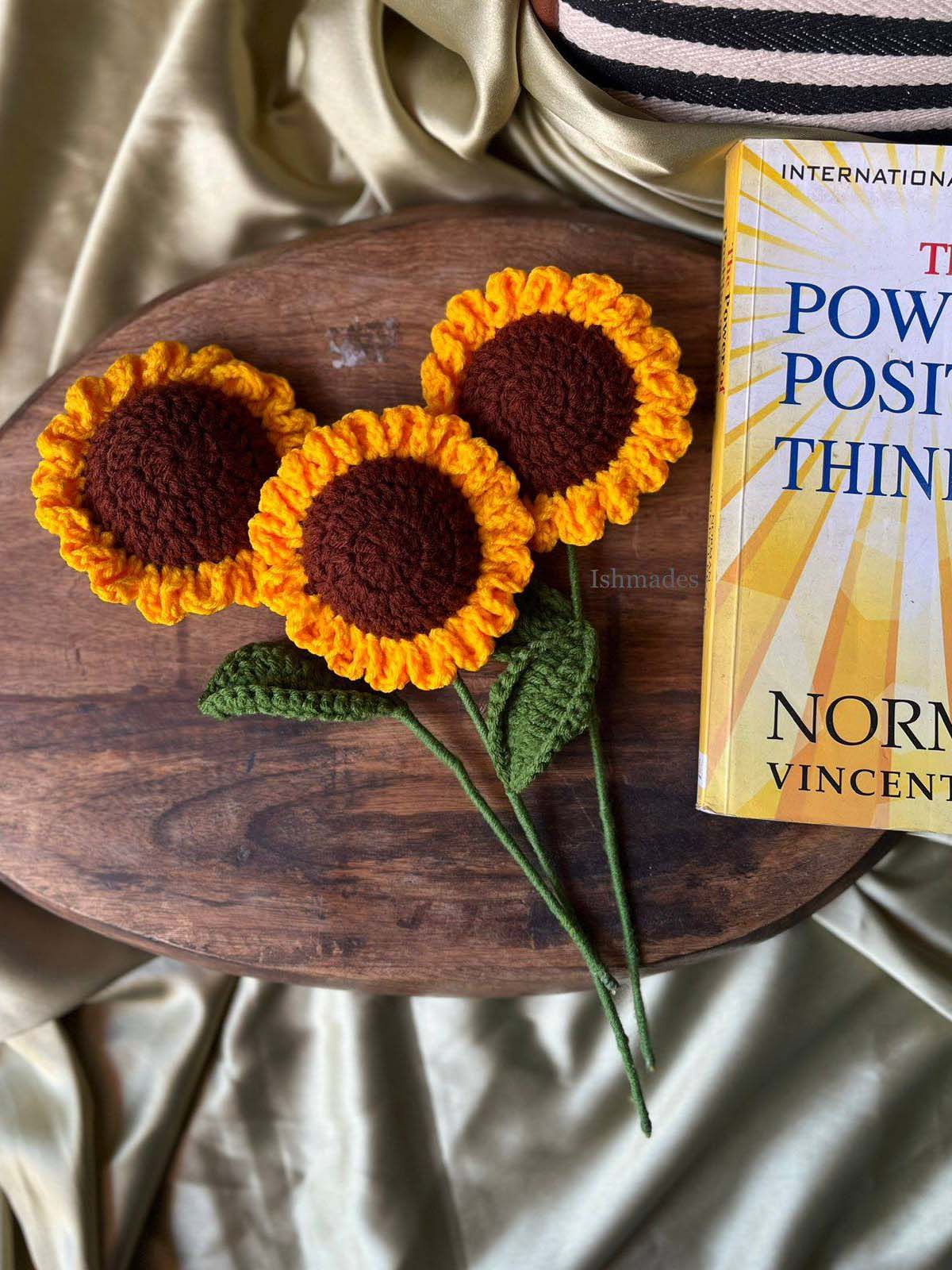 - Sunflower is often seen as a symbol of faith and devotion, radiating positivity and hope. Introducing our Crochet Sunflower, a charming piece of handcrafted beauty to brighten up your space with a touch of rustic elegance. Each petal of this sunflower is lovingly crocheted by skilled artisans, creating a warm and inviting atmosphere wherever it's placed. Its vibrant yellow hues and textured details bring the essence of a sunny garden indoors, adding a cheerful pop of color to any room. Perfect for adorning your living room, bedroom, or workspace, this crochet sunflower adds a cozy and whimsical touch to your decor. Whether displayed on its own or as part of a bouquet, it's sure to bring a smile to your face and a sense of nature's beauty into your home. - length- 10 inches - home washable