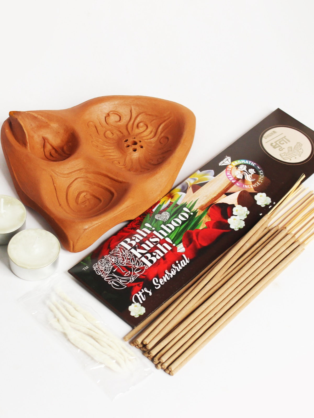 A designer‑textured version of our three‑in‑one puja tray: candle holder, ash‑catching incense stand, and integrated diya. Thoughtfully engineered to keep surfaces clean while honoring tradition—complete with wicks, tealights, and aromatic incense.