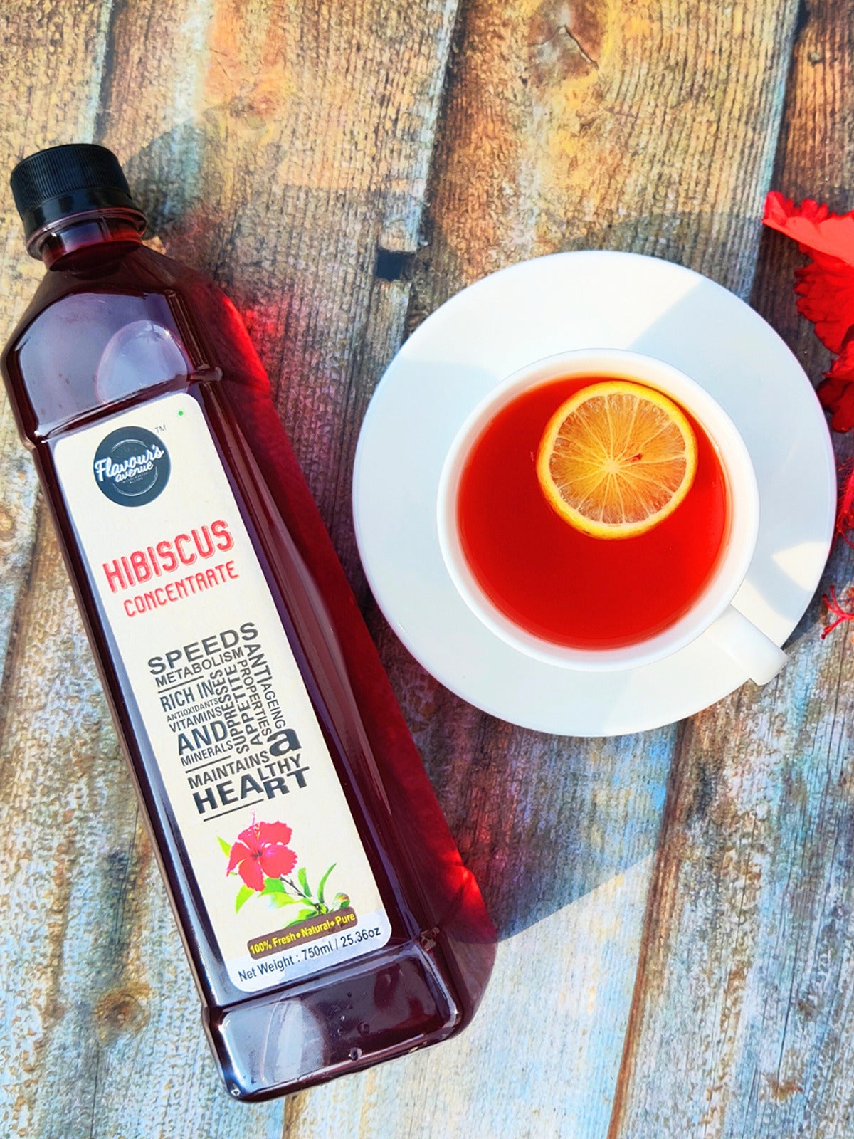 Know what improves blood flow to the heart and keeps bad cholesterol under control? It’s this ruby red , Anti – oxidant rich elixir we call Hibiscus Juice!