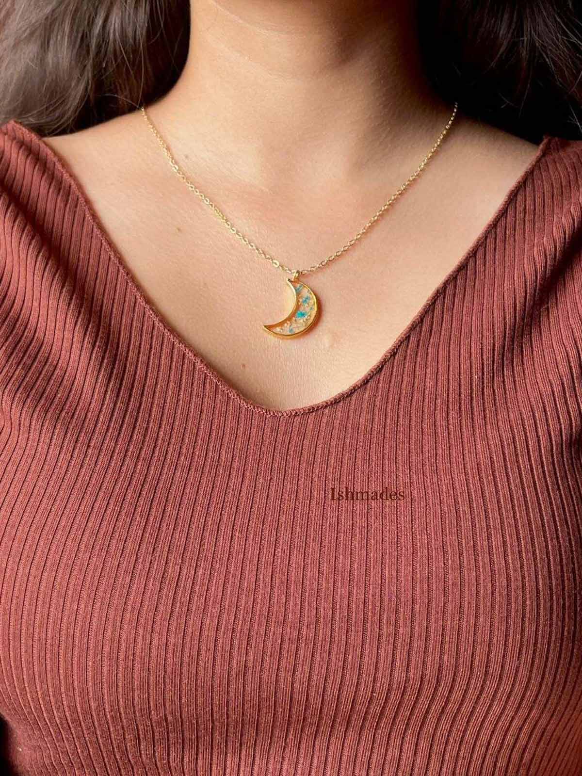 Each petal of the Anne's Lace flower is meticulously preserved to capture its timeless allure, creating a mesmerizing centerpiece for this pendant. The delicate lace-like patterns of the flower contrast beautifully with the smooth curves of the crescent moon, adding a touch of femininity and grace to any ensemble. This pendant is more than just a piece of jewelry; it's a symbol of natural beauty and celestial wonder. Whether worn as a statement piece or as a subtle accent, the Pendant of Crescent Moon is sure to evoke admiration and awe wherever it goes. Handcrafted with the finest materials and attention to detail, this pendant is a testament to quality craftsmanship and timeless style. Elevate your look and connect with the beauty of nature with our Pendant of Crescent Moon. Comes with a golden chain The size of the pendant is 2x0.5=5 cm
