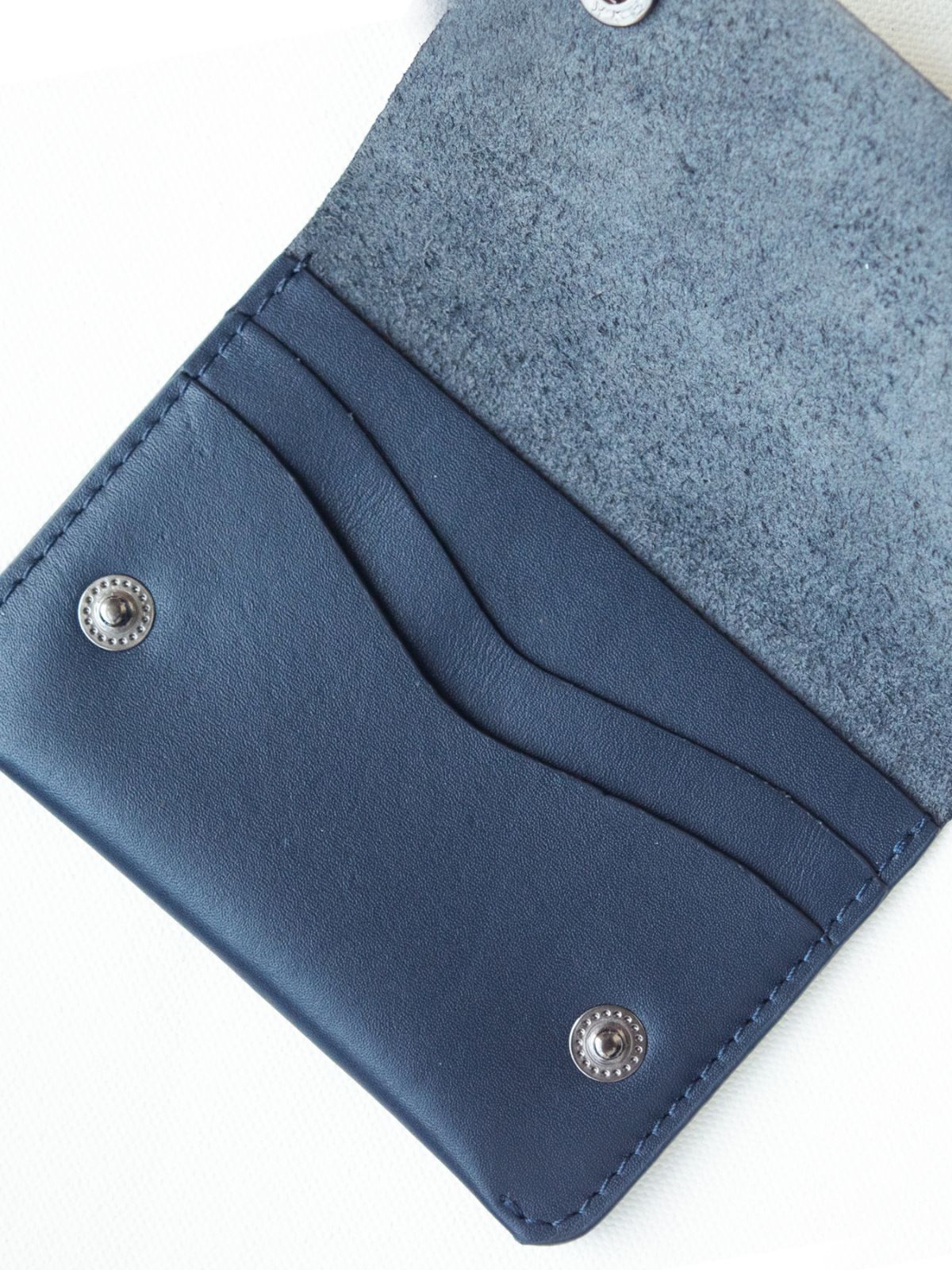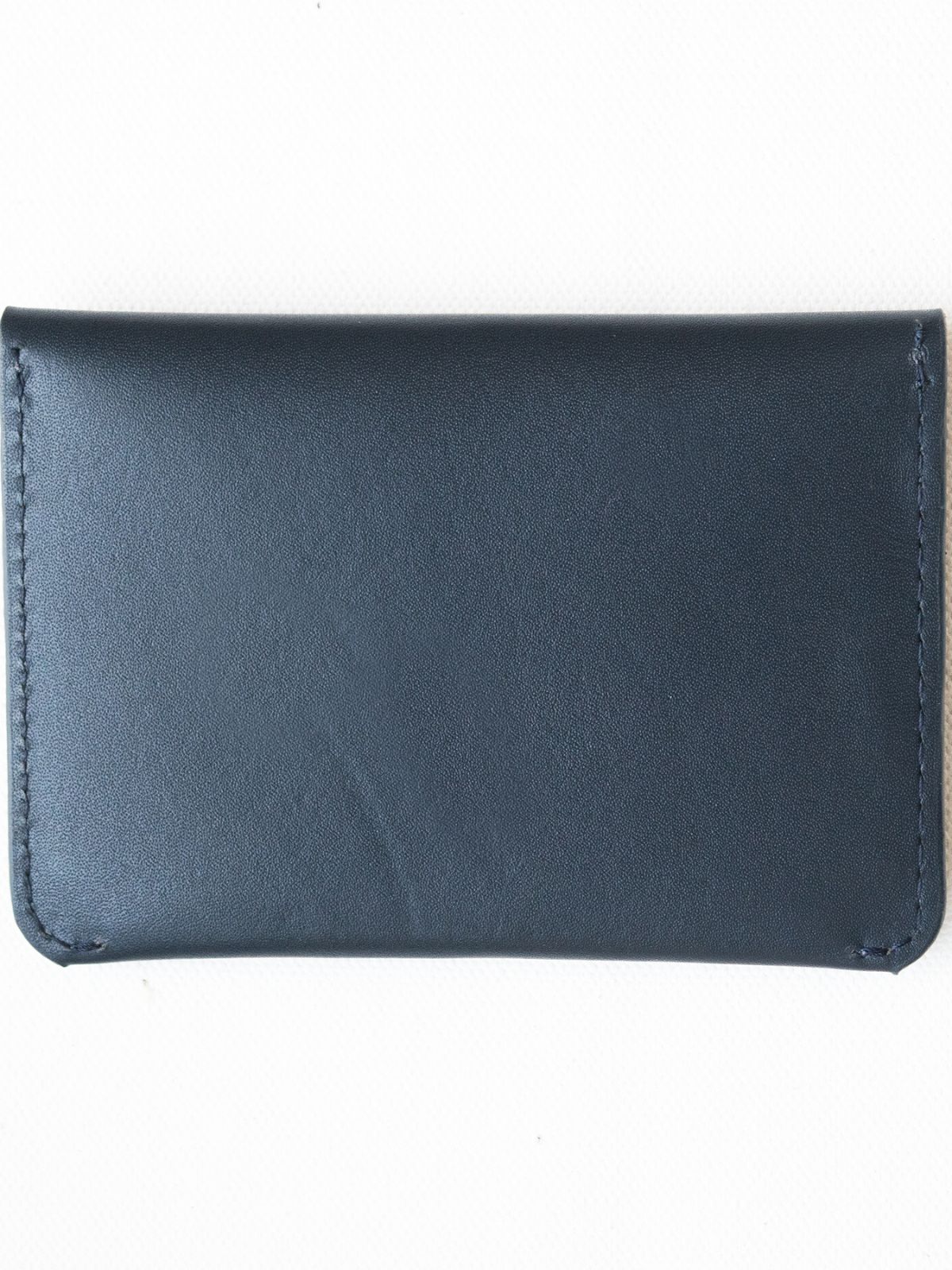 Navy flap wallet handcrafted in top-grain leather with metallic rivets for a sophisticated touch. Includes 2 card slots and a main compartment to hold 4–5 cards, cash, ID, and coins. Compact yet functional, it balances durability with premium style, making it an essential accessory for organized, modern everyday use.