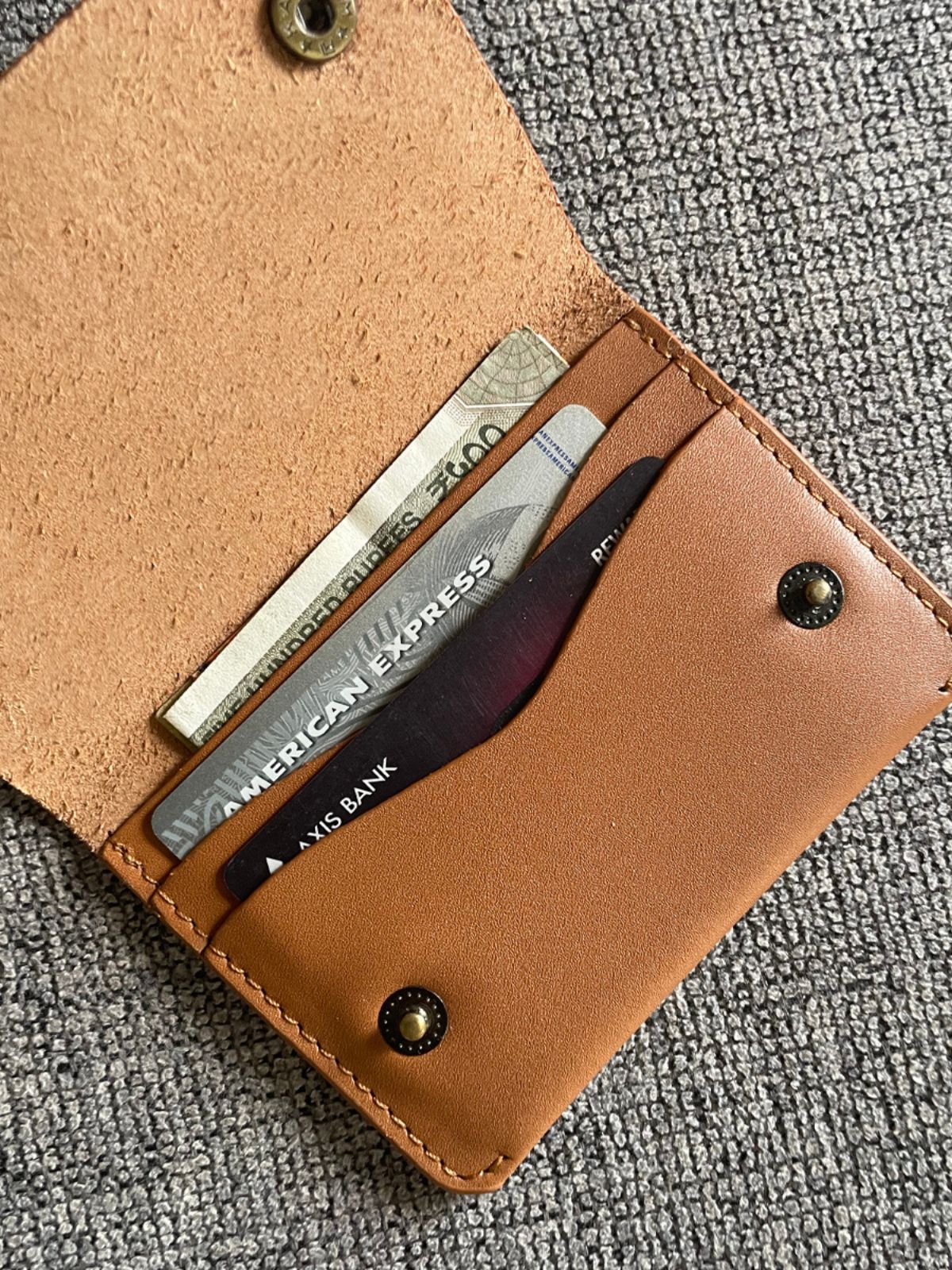 Crafted from top-grain leather, this Tan flap wallet combines style and practicality. Features metallic rivets, 2 dedicated card slots, and a main compartment accommodating 4–5 cards, cash, IDs, and coins. Slim and elegant, it’s perfect for everyday use, offering functional organization while maintaining a premium, durable, and refined appearance.