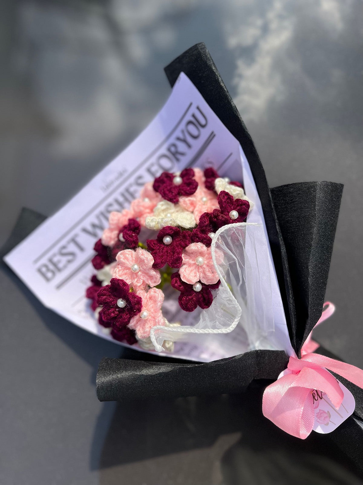 Send a heartfelt message that lasts forever with this enchanting bouquet of 30 handcrafted forget-me-not crochet flowers. Intricately made and arranged with love, these delicate blooms are wrapped in an elegant black sheet and soft organza mesh roll, topped with a charming “Best Wishes For You” newspaper-style sheet – a perfect blend of vintage and thoughtful. Forget-Me-Nots: Universally cherished as a symbol of true love, lasting memories, and good luck. They're often gifted to show appreciation, loyalty, and sincere well-wishes.