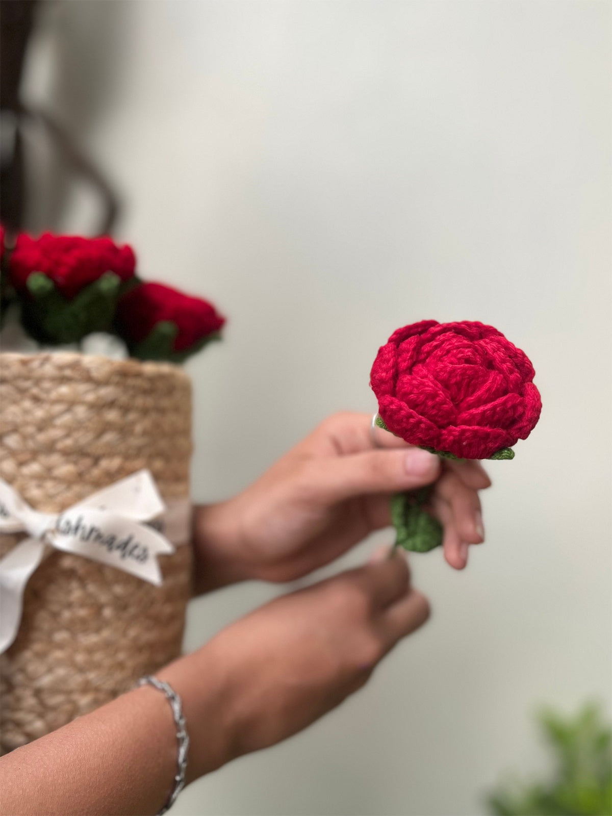 Introducing our beautifully handcrafted crochet red rose, a timeless symbol of love and passion. Measuring 10 inches in circumference, this exquisite piece is meticulously crafted from premium yarn, ensuring a lifelike and enduring bloom that never wilts. Perfect for gifting, this red rose embodies heartfelt emotions, making it an ideal present for anniversaries, Valentine's Day, or any special occasion. Its vibrant color and intricate details add a touch of elegance to any decor, be it a romantic dinner setting or a cozy living room. This crochet rose not only conveys deep sentiments but also serves as a lasting reminder of cherished moments, making it a gift that speaks volumes.