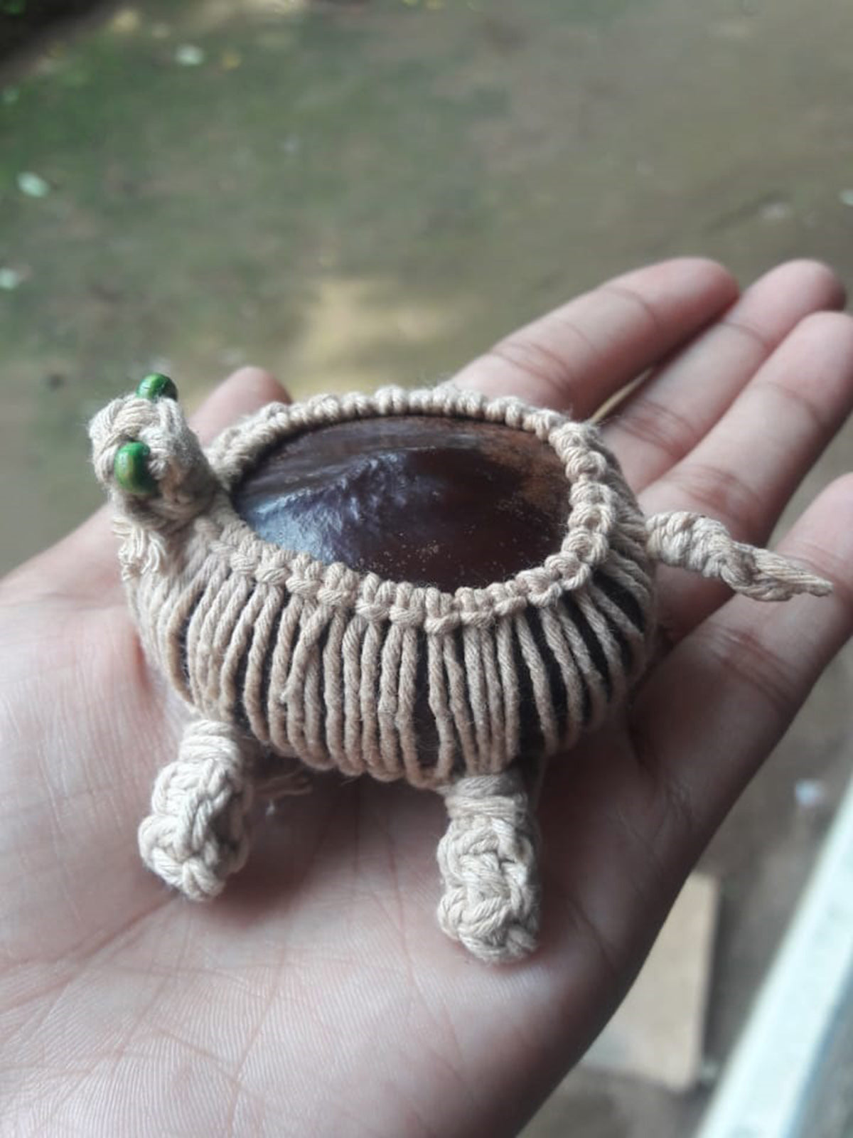 Embrace coastal charm with our Macramé Turtle, intricately crafted from Seabean seeds by skilled artisans in India. Ideal as a desk or bookshelf mascot, it pays homage to the Travancore Cane Turtle. Handmade with sustainable Entada seeds and soft cotton crochet thread, it blends eco-consciousness with artisanal finesse.