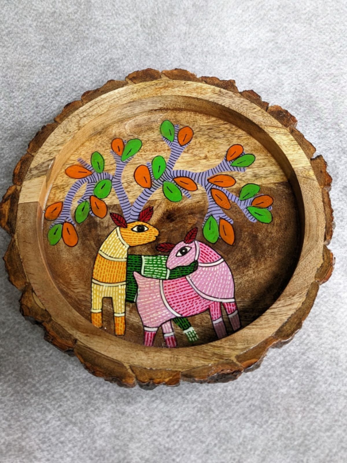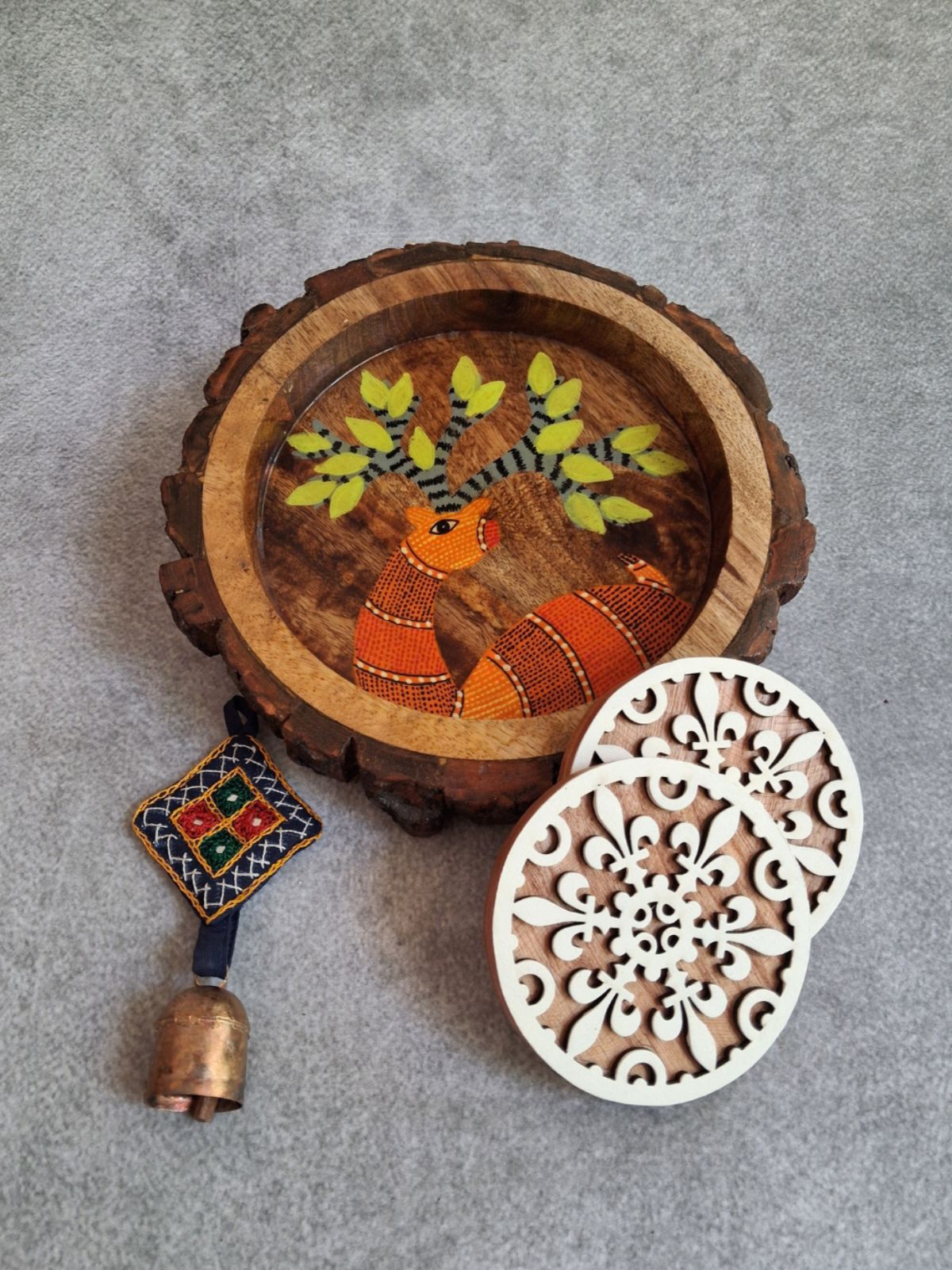 Manvaar Wood Wall Decor combines traditional craftsmanship with functional artistry. Each piece begins with sustainably sourced wood, carefully shaped and sanded to perfection. Skilled artisans apply intricate Gond-style hand-painted motifs using precision brushwork, creating distinctive patterns unique to every item. A durable protective varnish enhances both the visual appeal and longevity of the wood. Complementary copper elements are individually hand-cut and shaped, then polished to a refined finish. Coordinating wooden coasters feature matching hand-carved designs that echo the primary piece's aesthetic. Every component undergoes meticulous finishing to deliver a cohesive, gallery-quality collection that celebrates authentic Indian artisanal techniques.
