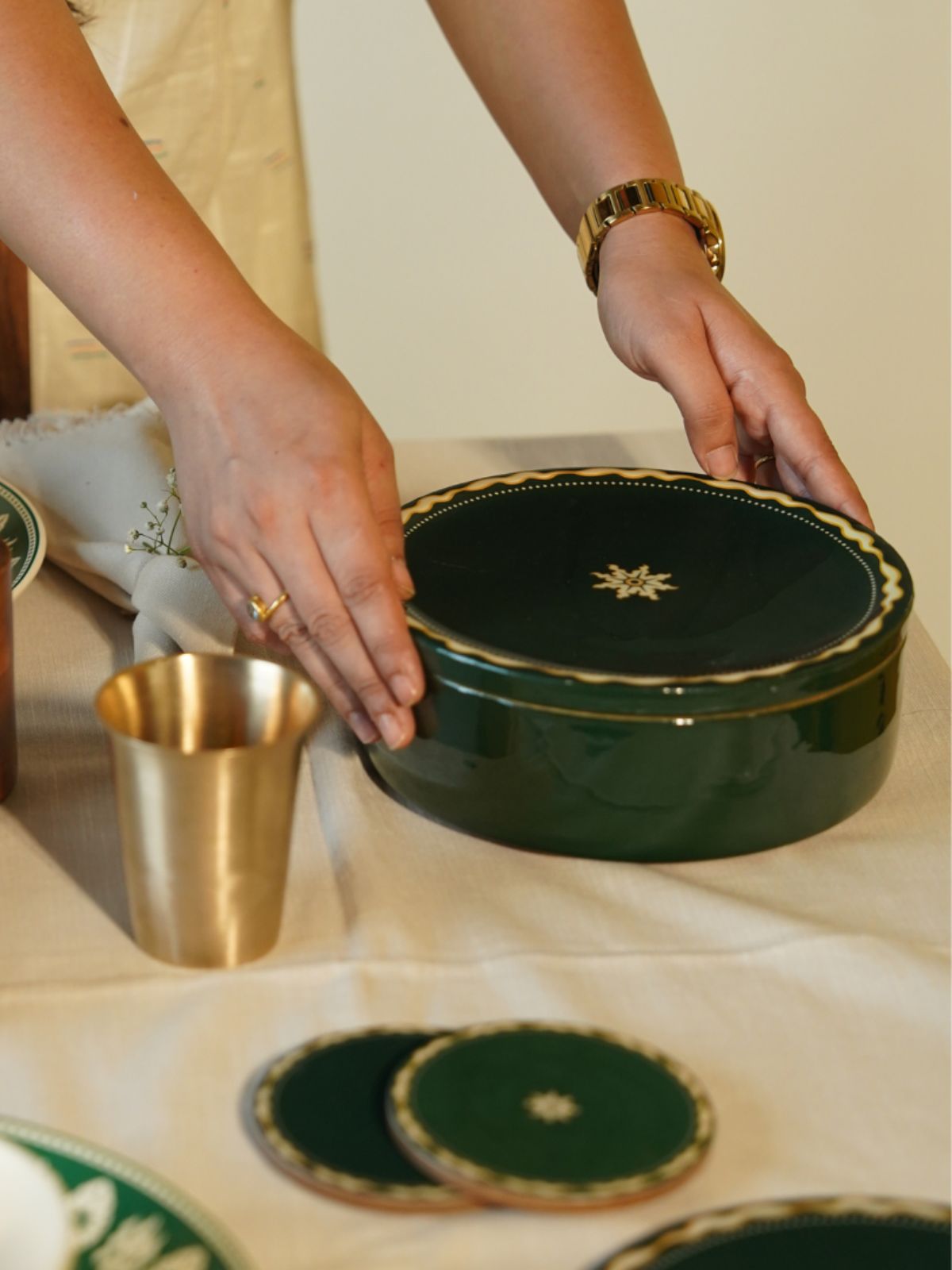 This Emerald Green Lacquered roti box can be a conversation starter in your dining area. Uniquely designed piece can also be used as center table or decor accent in your space. Pairs well with Tarangan Dinnerware and Serving Tray. This masterpiece made from solid mango wood has excellent finish and is an epitome of great craftsmanship pursued by Indian hands.