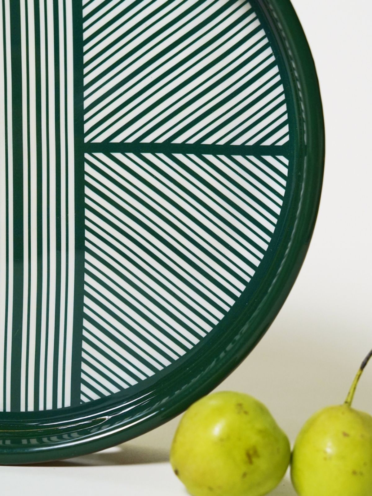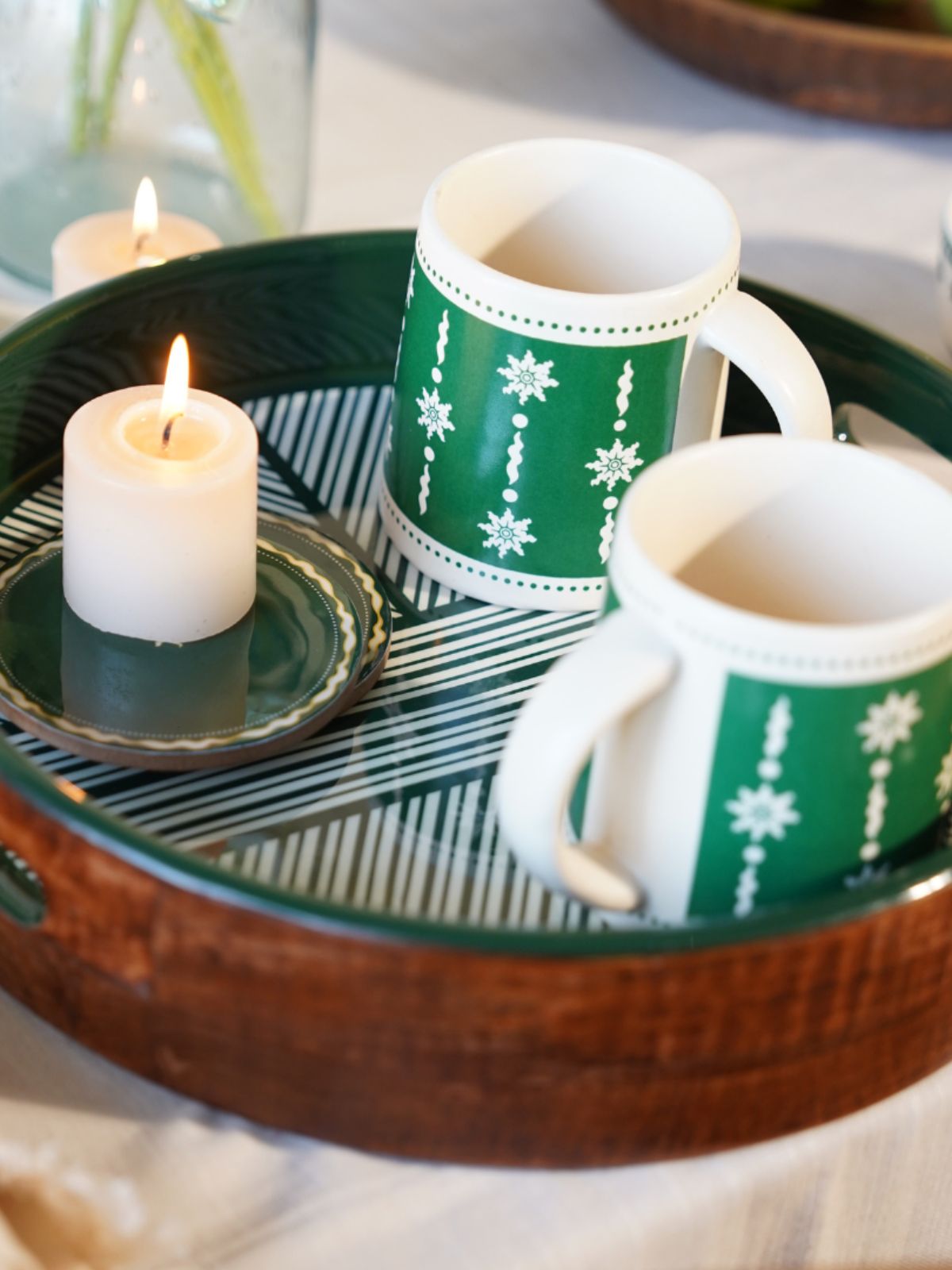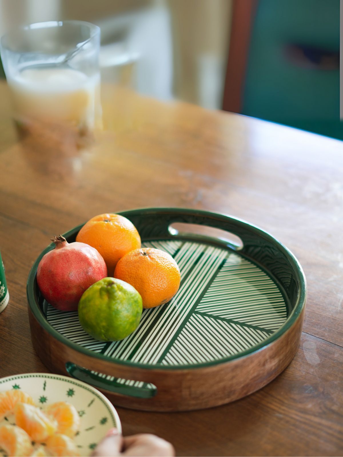 Trendy striped enamel printed tray would be a masterpiece in your kitchen wardrobe. This sturdy large tray is made from solid mango wood, can be used for serving or center table tray. Also pairs well with Tarangan Dinnerware. Made from Well seasoned wood, food-safe, Premium quality wood.