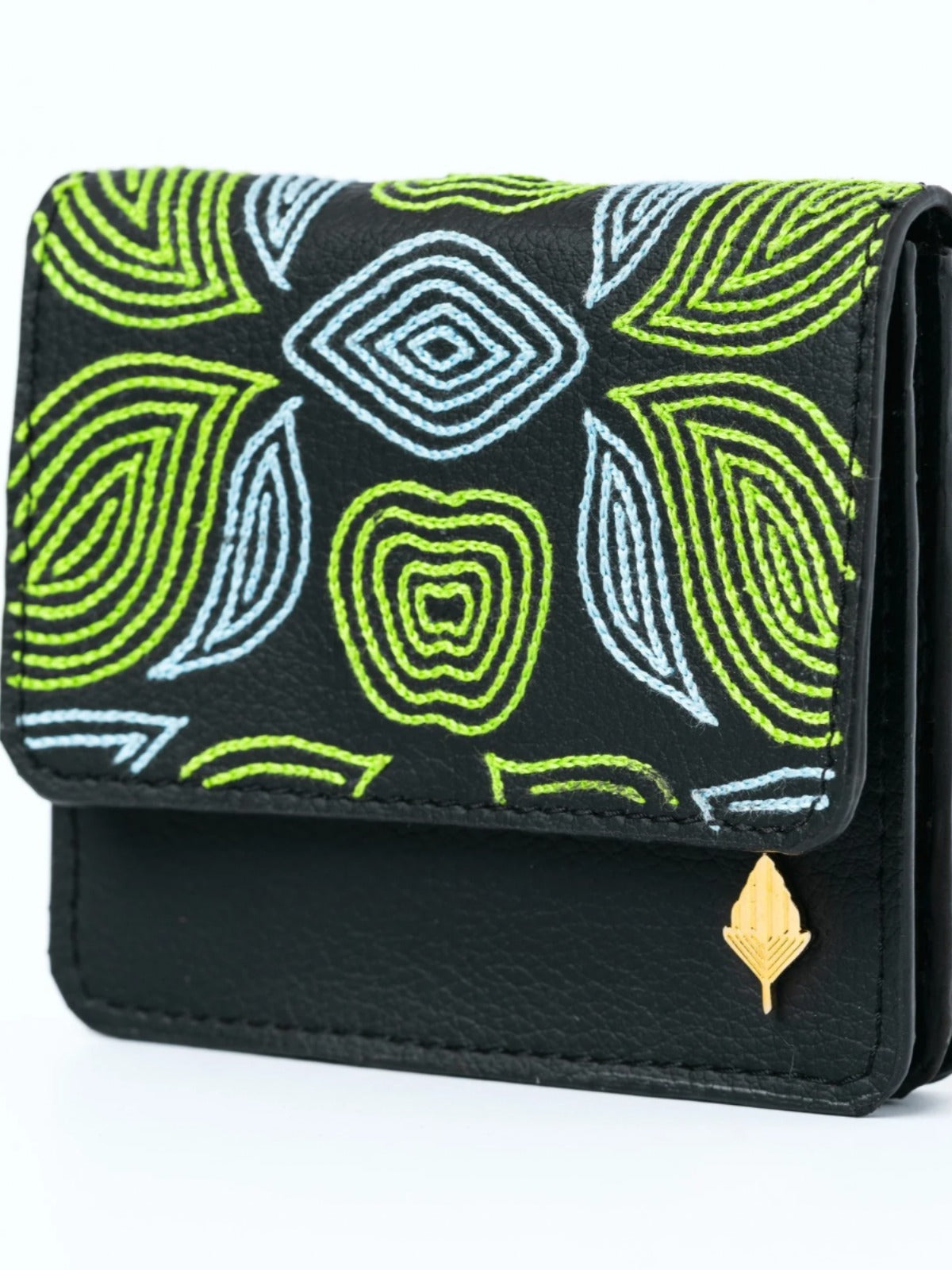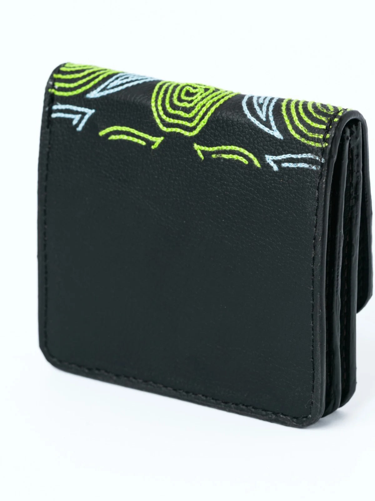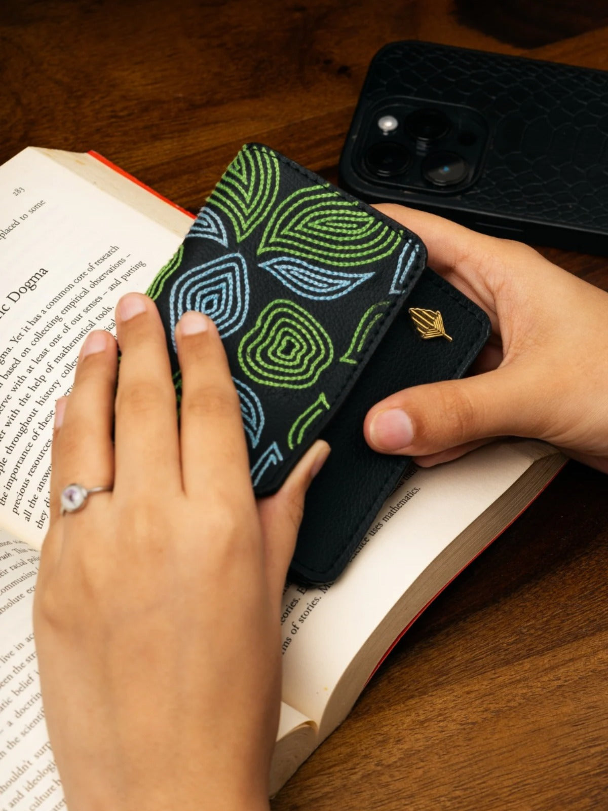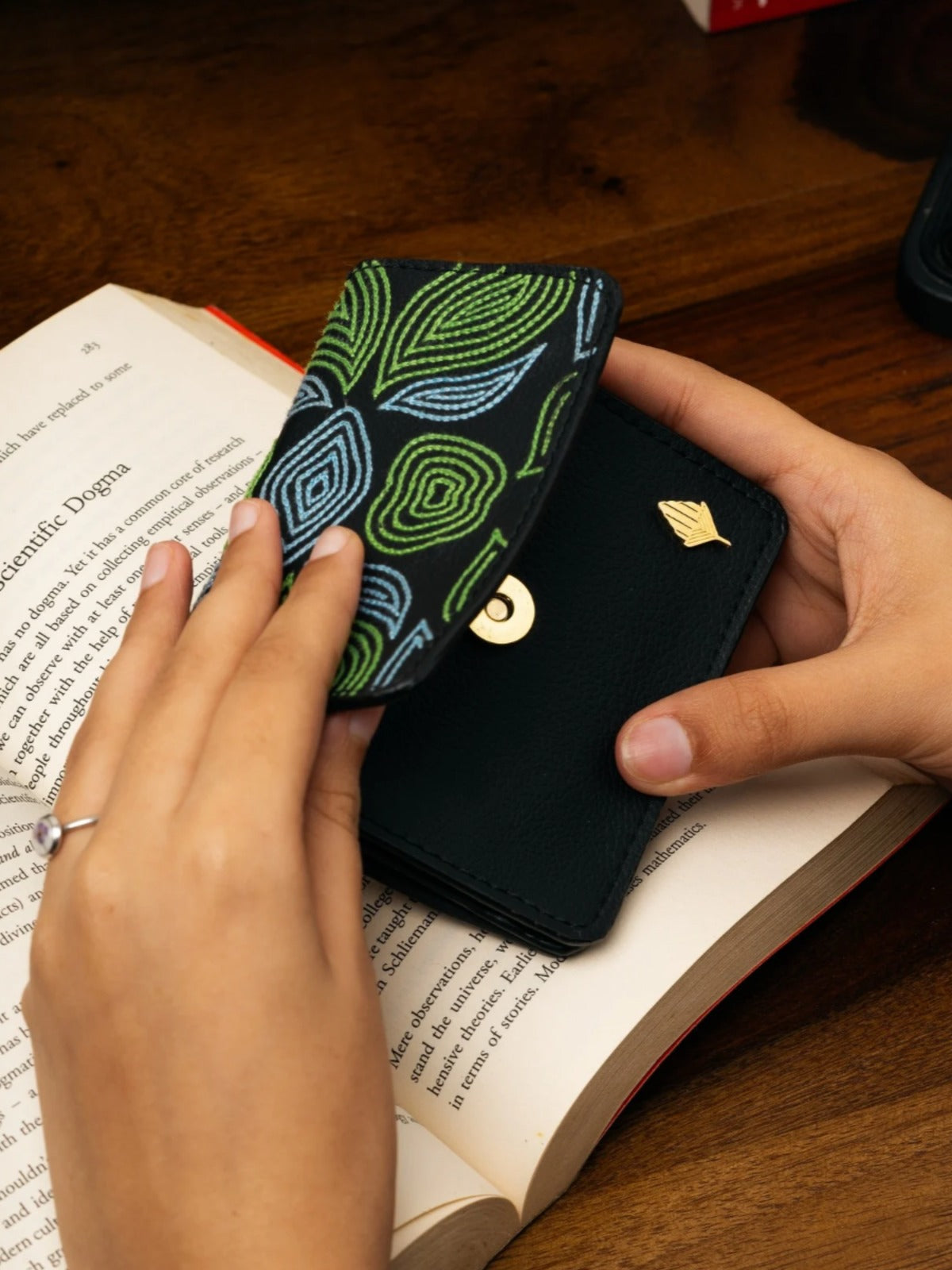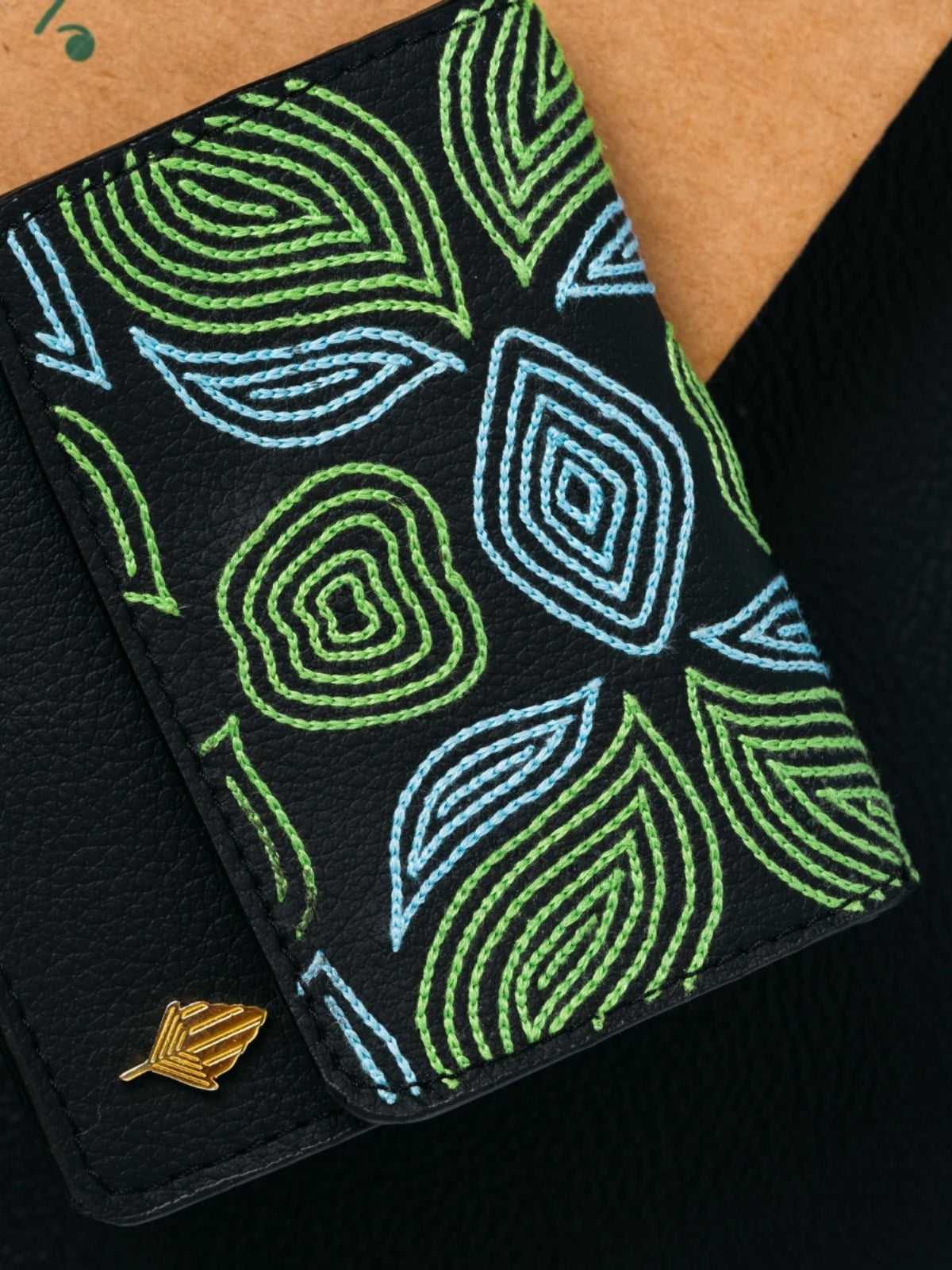 The Lana Cardholder in black redefines compact luxury. Crafted from plant-based leather with subtle embroidery, it offers multiple slots for cash, coins, and cards. Its expandable design and magnetic flap closure ensure both style and practicality, while the option to convert into a sling makes it effortlessly versatile.