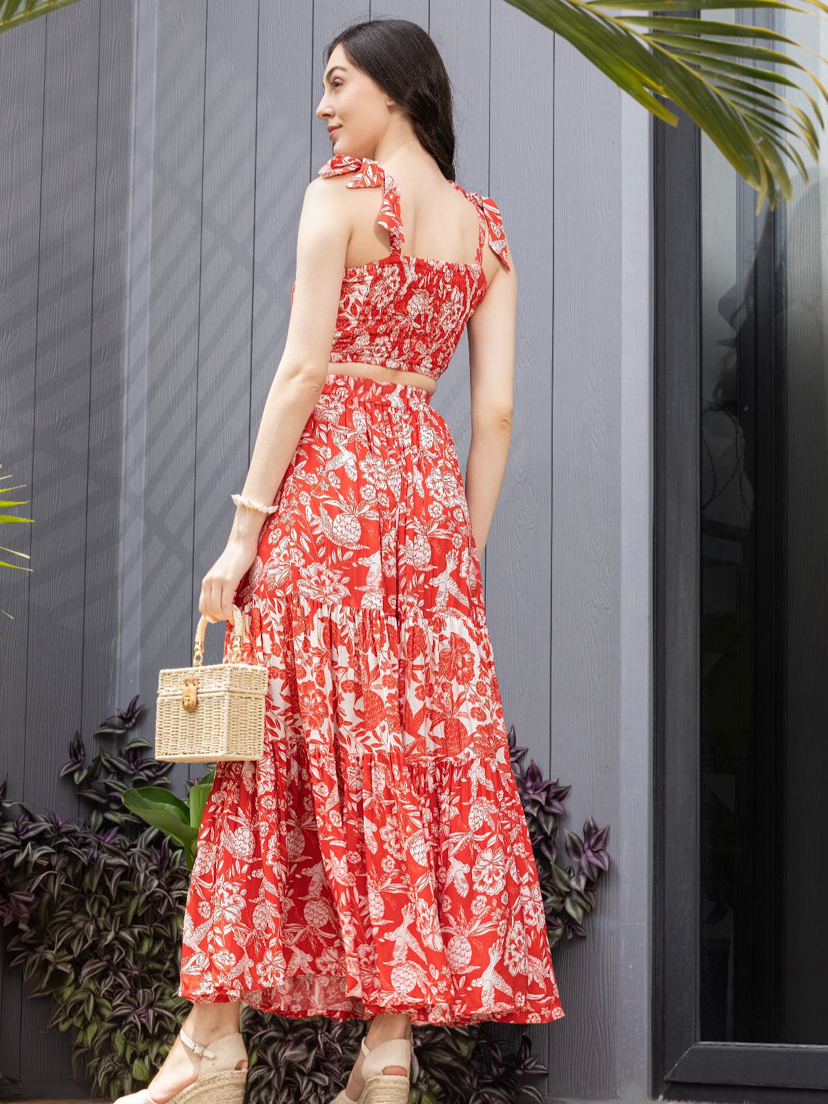 Crimson Whirl Smocked Crop Top & Maxi Skirt Co-Ord Set
