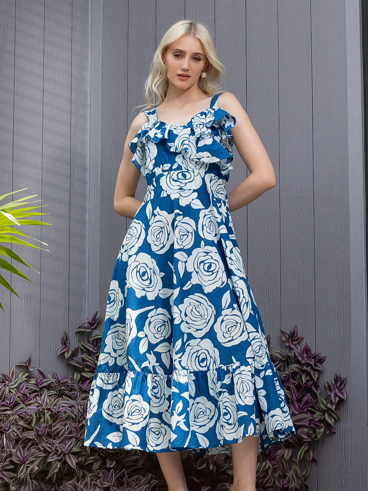 Step into effortless elegance with the House of Abeena Blue & White Hand-block Rose Printed Sweetheart Neck Sleeveless Ruffled Detail Midi Dress. Crafted from luxurious cambric cotton, this stunning piece combines comfort and style flawlessly. The structure emphasizes a gathered fit and flare design, while the charming hand-block rose print adds a touch of artisanal beauty to your wardrobe. With its sweetheart neckline and flared hemline, it gracefully celebrates femininity for any casual occasion.