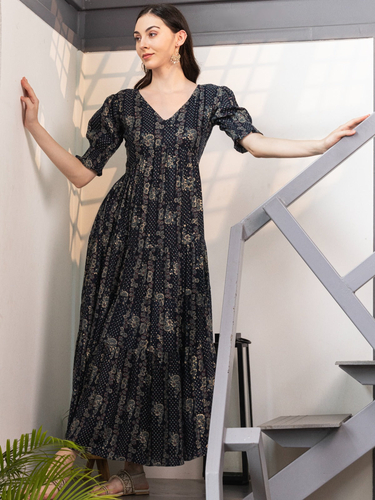 Step into effortless elegance with the Navy Blue Foil Floral Printed V-Neck Smocked Puff Sleeves Maxi Dress by House of Abeena. Crafted from luxurious cambric cotton, this dress offers a breathable and comfortable fit that's perfect for casual outings. The intricate foil floral print adds a touch of sophistication, while the smocked detailing and gathered surface styling create flattering contoursideal for showcasing your silhouette. The V-neckline and short puff sleeves lend an air of playfulness to its maxi length, ensuring you feel both chic and confident.
