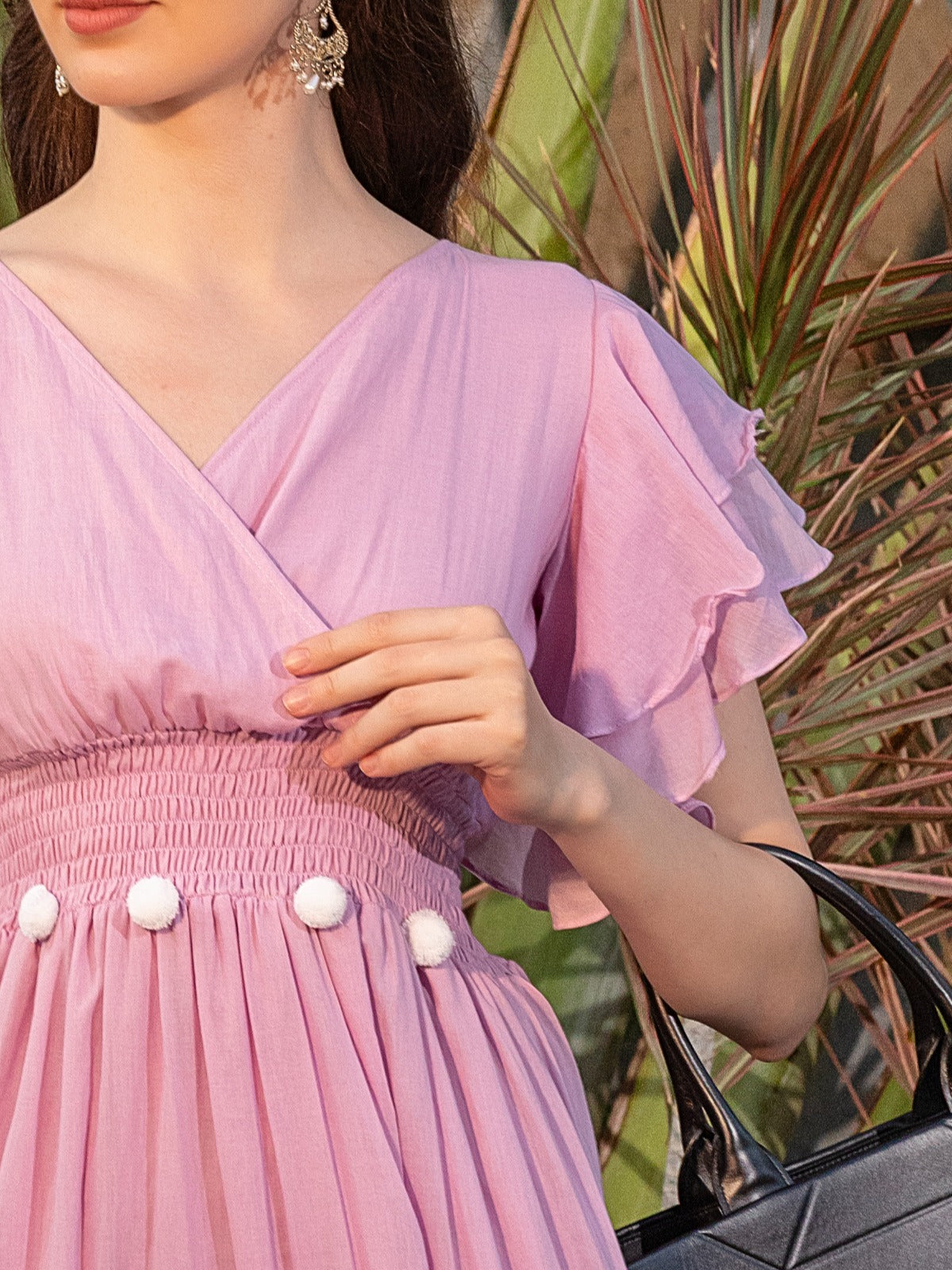 Elevate your casual wardrobe with the exquisite Solid Lavender V-Neck Butterfly Sleeves Pom-Pom Detail Smocked Waist Gathered Fit & Flare Midi Dress from House of Abeena. Crafted from soft mul cotton, this dress combines comfort and breathability for all-day wear. Its charming fit-and-flare silhouette features a smocked waist that flatters every body type, while the whimsical butterfly sleeves add a touch of playfulness to its elegant design.