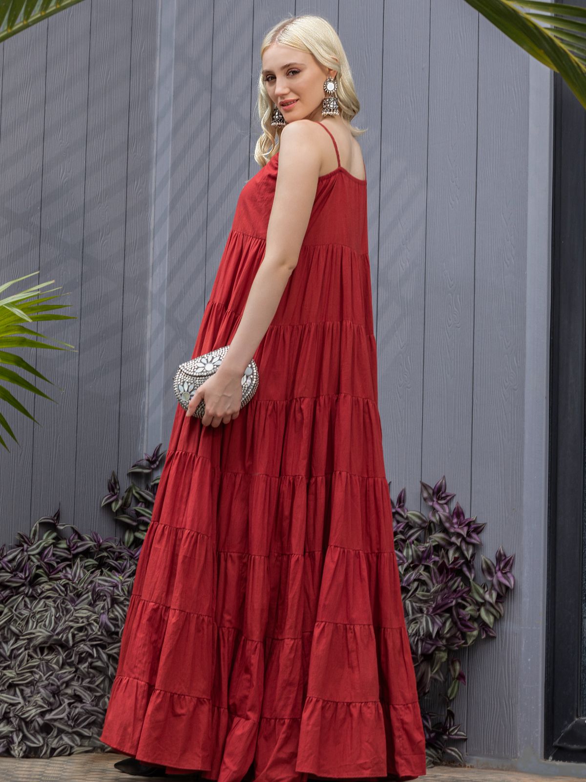 Step into elegance with the House of Abeena Solid Maroon Round Neck Sleeveless Tiered Detail Maxi Dress. Crafted from luxurious cambric cotton, this maxi dress promises all-day comfort while exuding sophistication. Its round neckline and sleeveless design add a modern touch, perfect for those festive parties where you want to shine bright. The unique gathered detailing combined with a flared hemline adds playful flair to your silhouette, while the deep maroon hue enhances your natural beauty. Opaque and beautifully woven, it ensures confidence in every movement. For an effortlessly chic look, pair it with strappy heels and statement earrings for that head-turning entrance! Embrace party season in style!