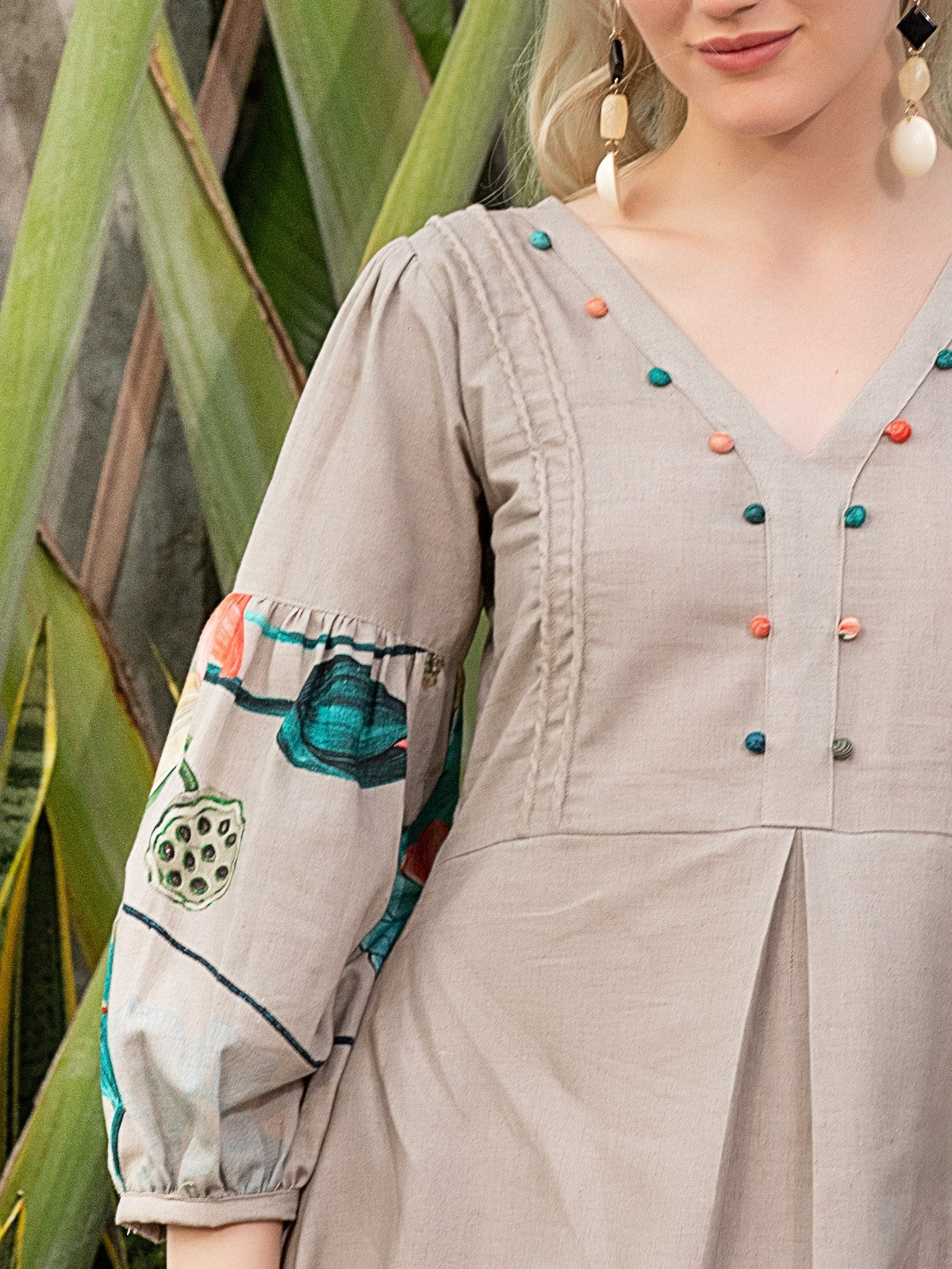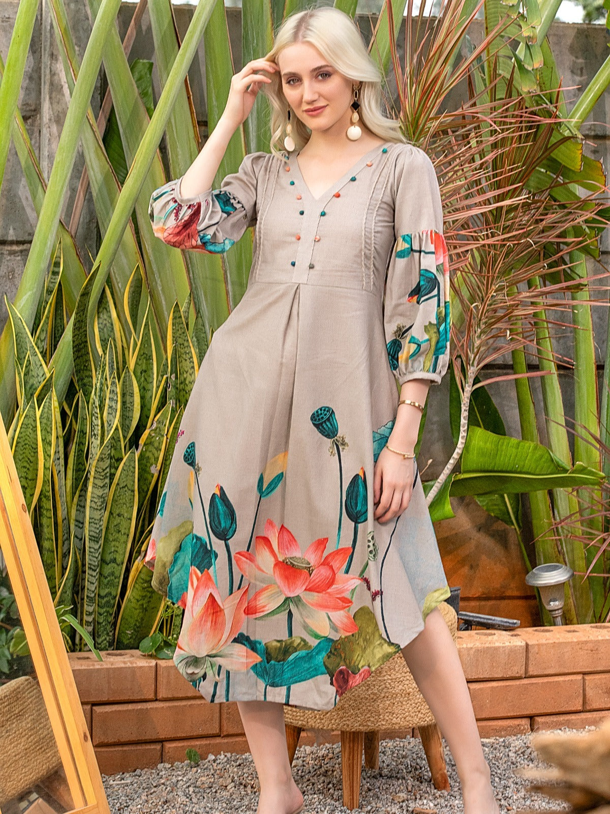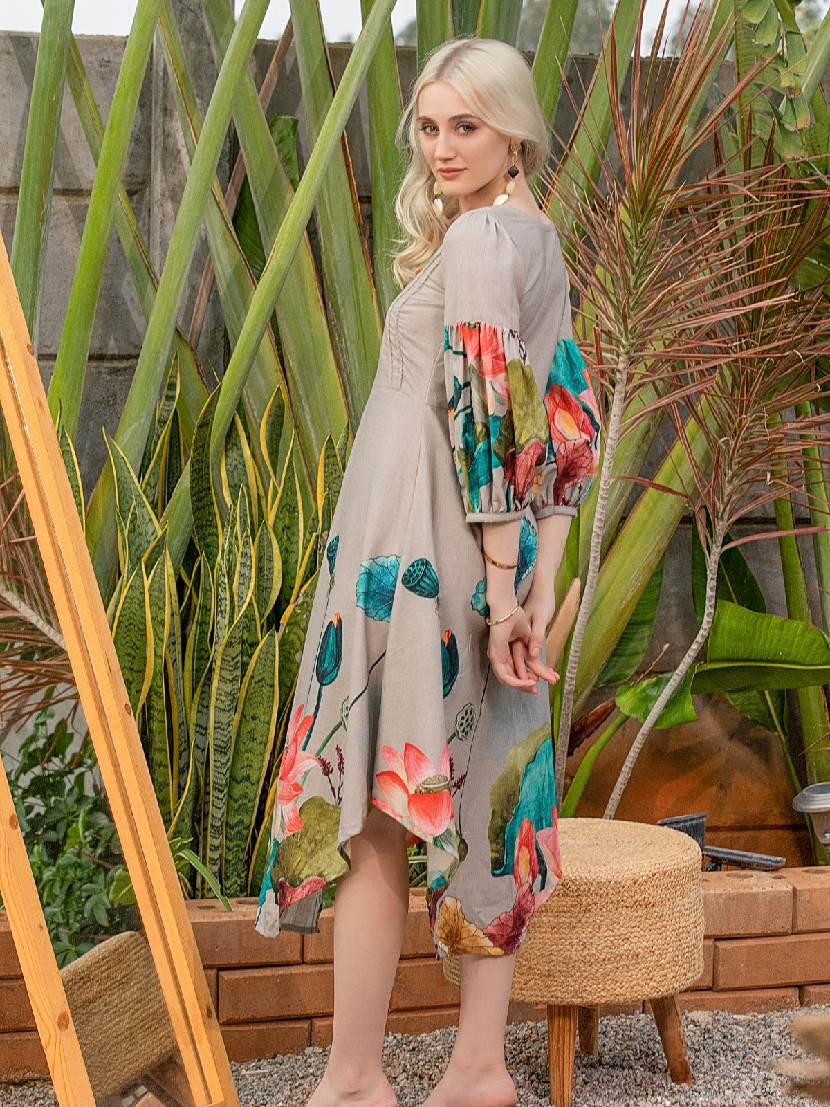 Step into effortless elegance with the House of Abeena Grey Floral Printed V-Neck Marie Sleeves High-Low Hem Pleated A-Line Midi Dress. Crafted from a luxurious blend of cotton and linen, this dress offers a breathable feel for all-day comfort. The exquisite floral print adds a touch of femininity, while the pleated design brings movement to your stride. Featuring three-quarter Marie sleeves and an eye-catching high-low hemline, it strikes the perfect balance between chic and casual.