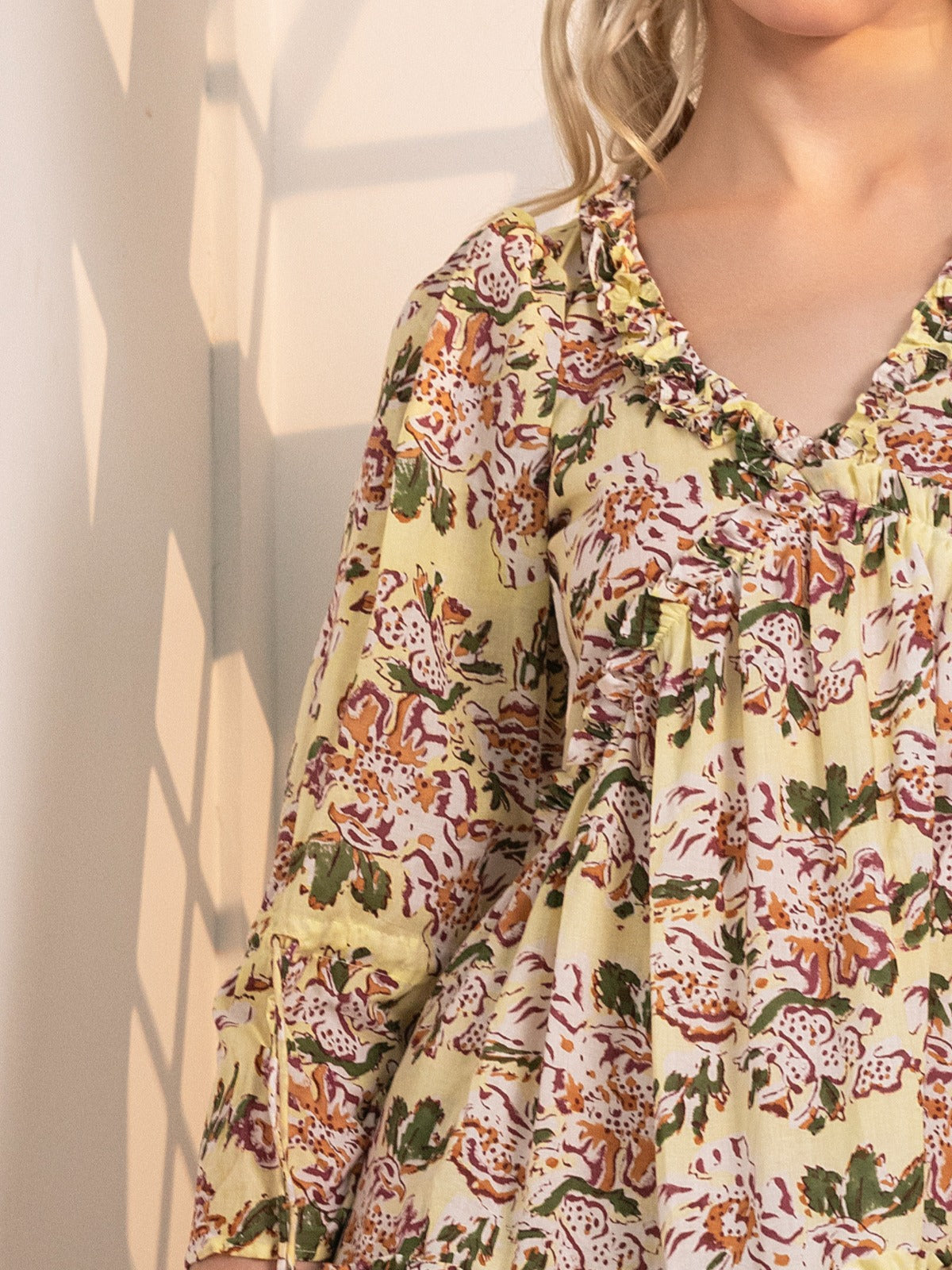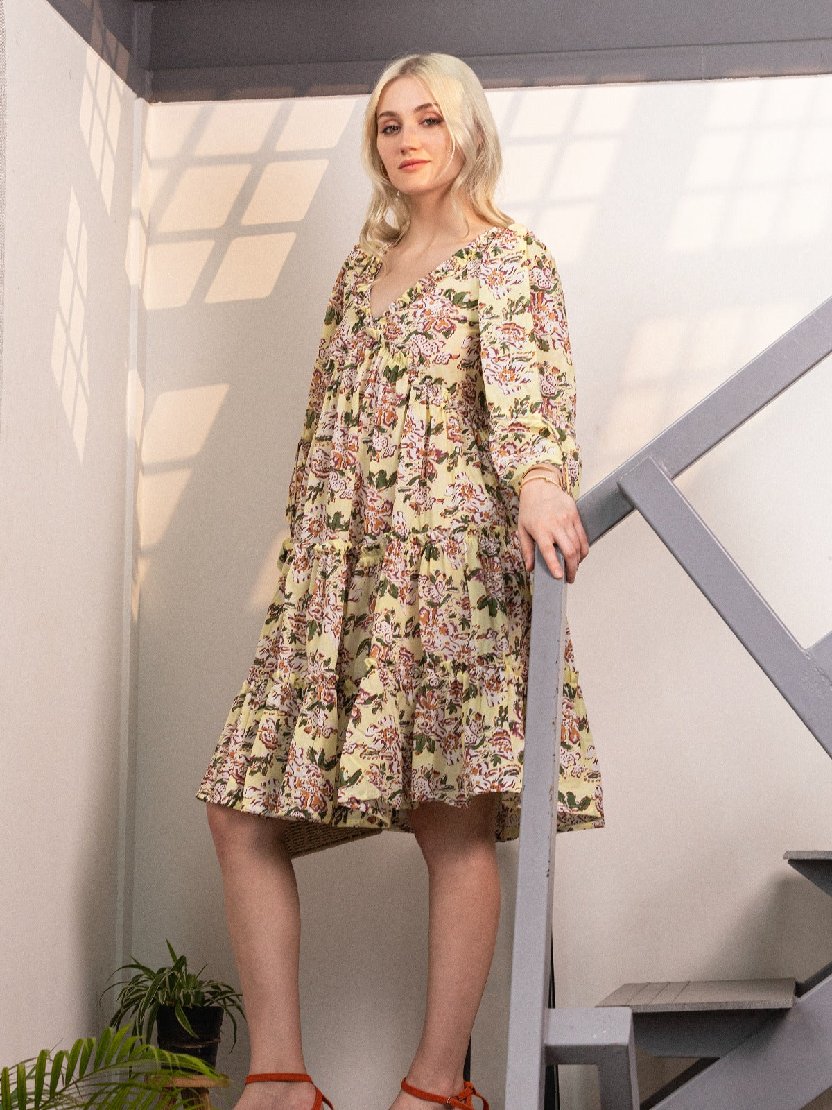 Introducing the Yellow & White Handblock Floral Printed V-Neck Bell Tie-Up Sleeves Slip-On Ruffled A-Line Midi Dress by the amazing collection of House of Abeenayour new go-to for casual outings. Crafted from soft, breathable cotton, this dress guarantees comfort while exuding effortless style. The charming handblock floral print dances across the fabric in vibrant yellows and whites, perfect for brightening up any room.