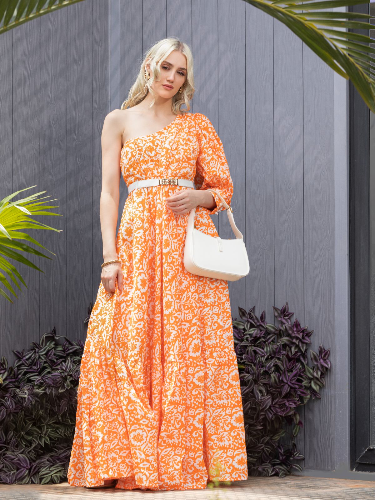 Immerse yourself in the vibrant charm of the House of Abeena's Neon Orange & White Handblock Floral Printed One-Shoulder Neck Fit & Flare Maxi Dress. Expertly crafted from premium cambric cotton, this woven dress promises both comfort and durability, making it perfect for any party or casual gathering. The one-shoulder neckline and long puff sleeves add a touch of contemporary elegance. At the same time, the meticulously pleated bodice flows into a fit-and-flare skirt that flares out gracefully at maxi lengthdesigned to celebrate every movement. The eye-catching neon orange interspersed with crisp white handblock floral prints ensures you stand out with sophistication. This ensemble includes a complimentary white belt to accentuate your waistline elegantly.