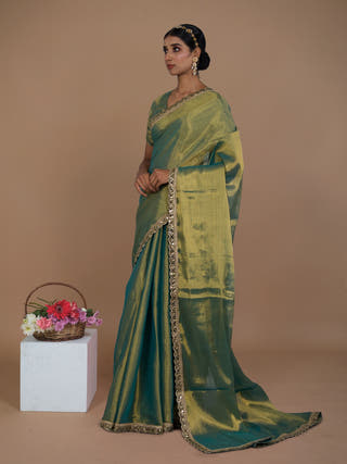 Akshata Neon Green And Neon Yellow Handloom Tissue Kurta Pant Set With Dupatta