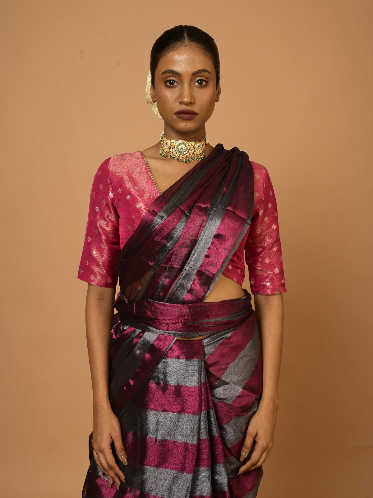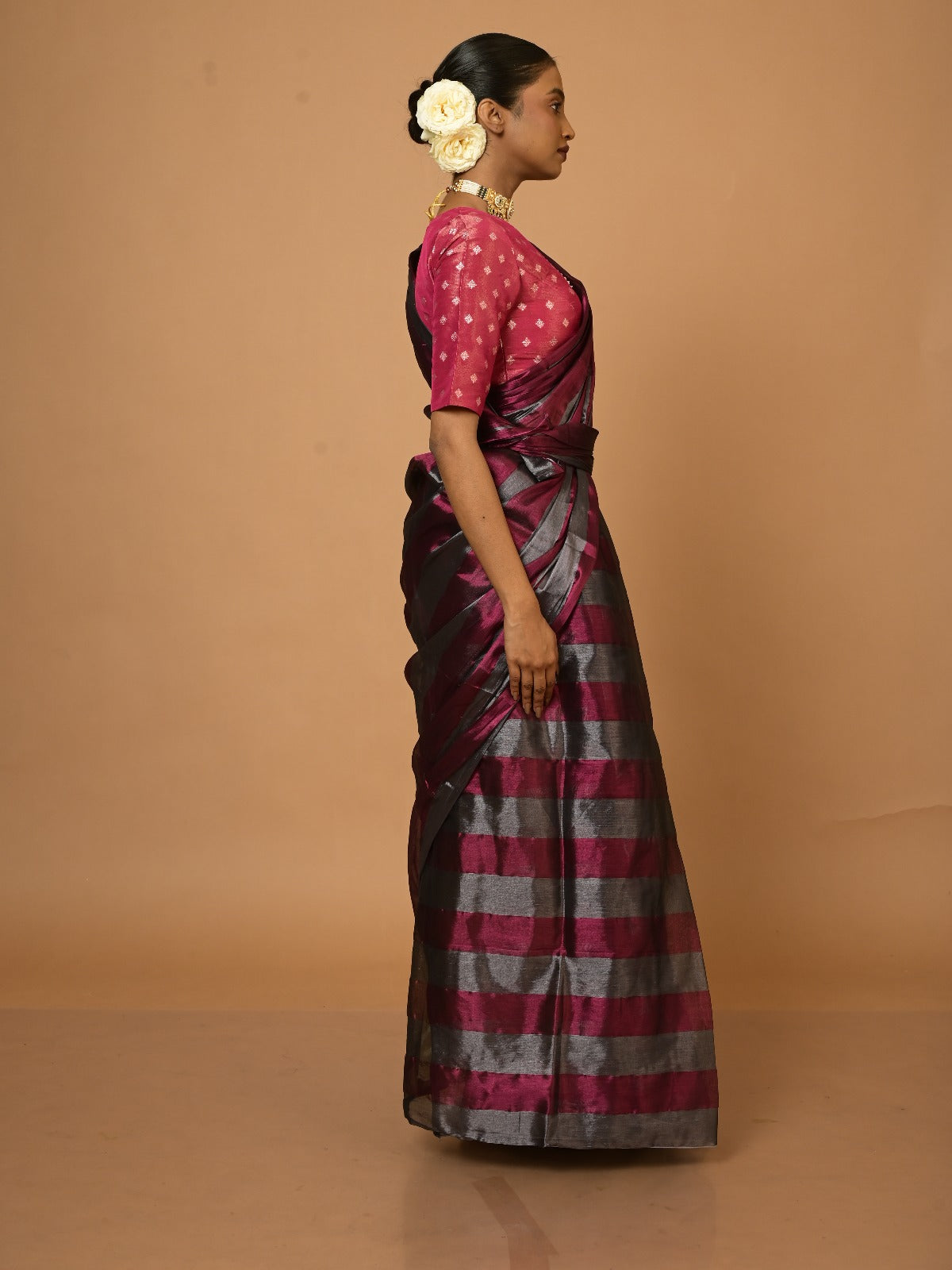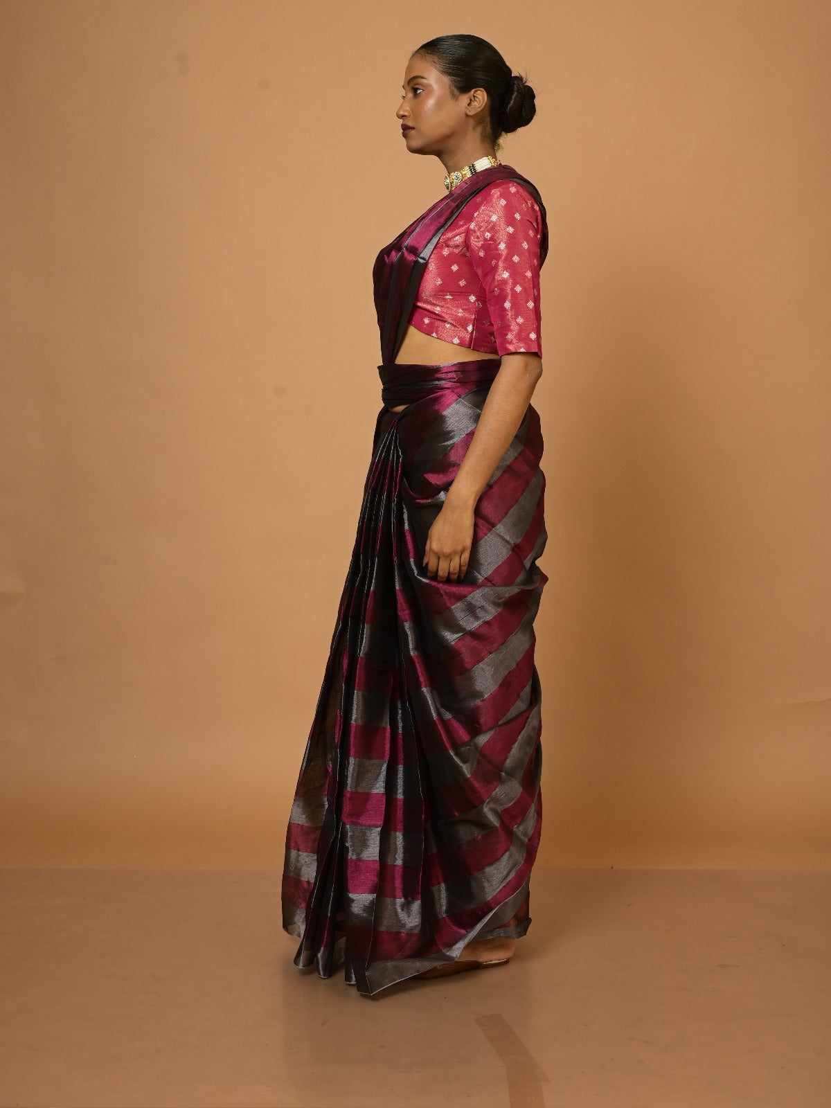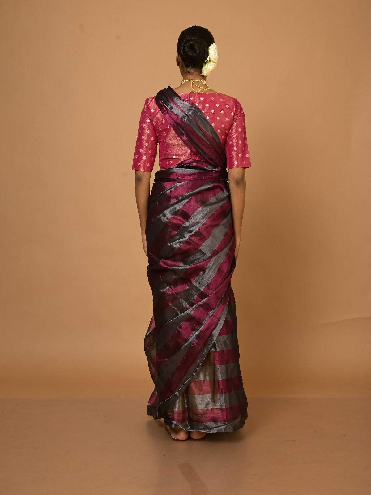 A silver and purple striped tissue saree that mirrors the journey of dreams and aspirations evolving through the changes of womanhood after marriage. This delicate weave blends subtle sheen with bold vibrancy, symbolizing the balance between newfound responsibilities and personal ambitions. Each stripe tells a story of resilience and grace, making it a timeless companion for a woman embracing her ever-changing roles.