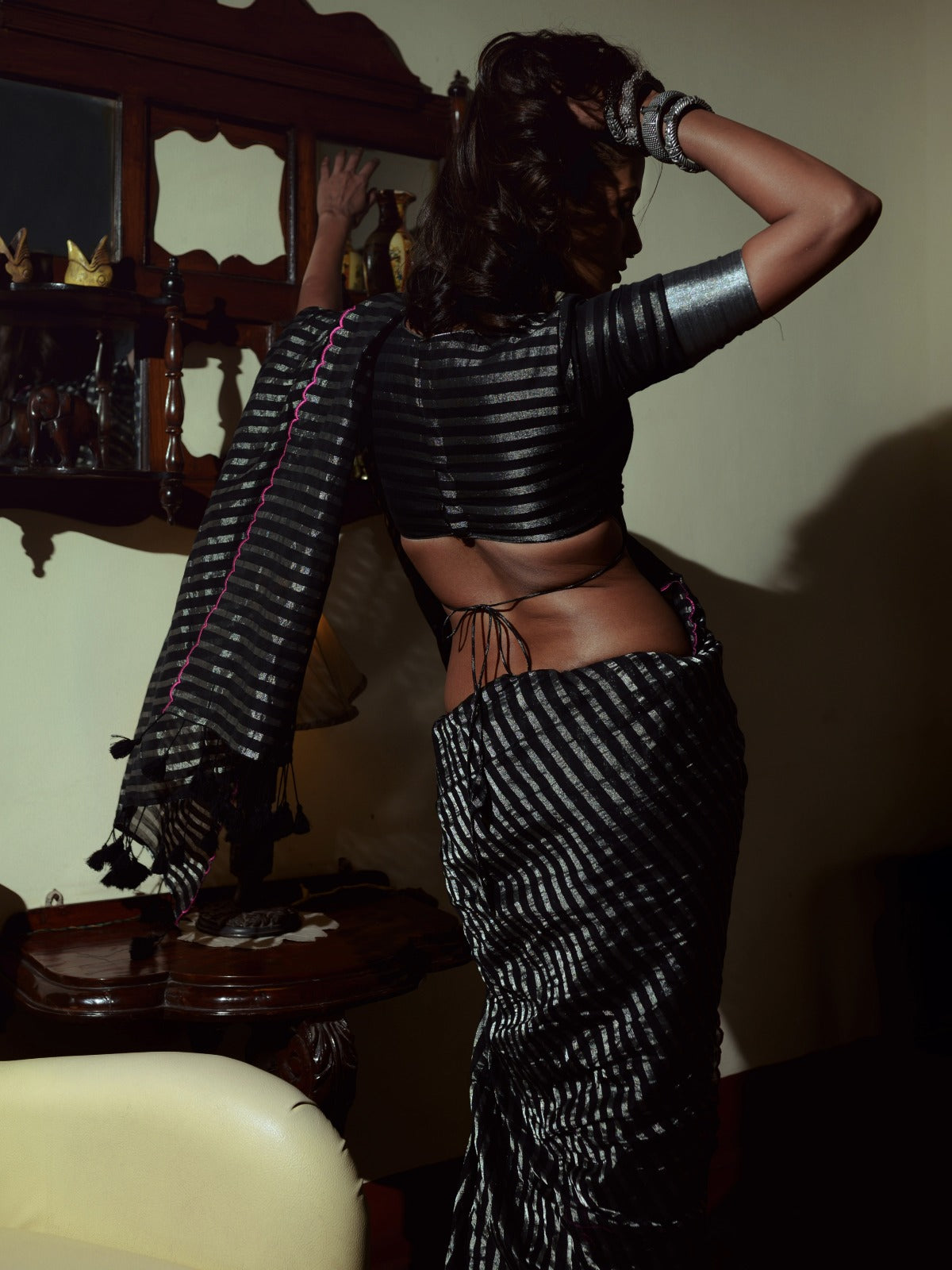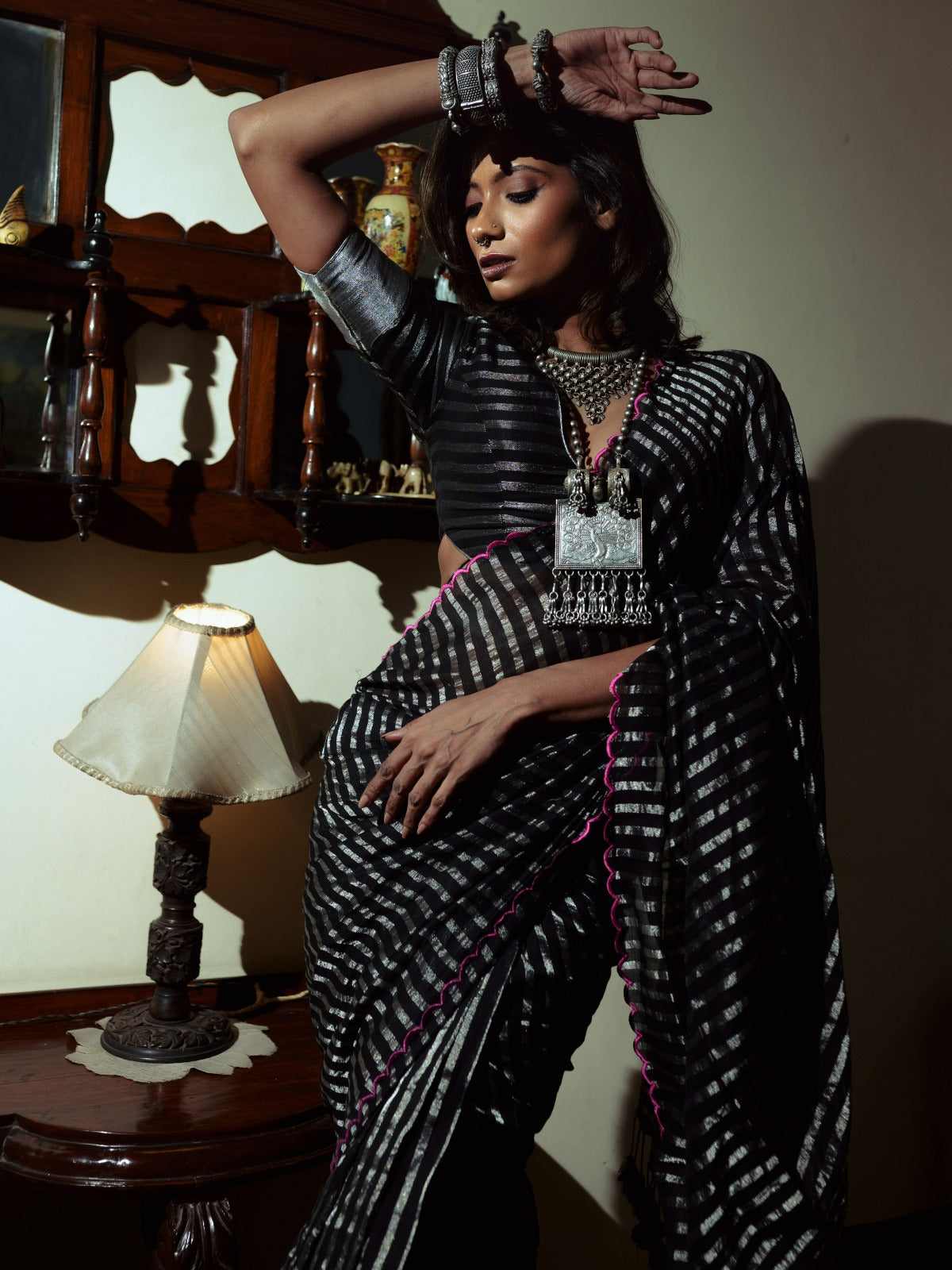 This captivating black mercerized cotton saree embodies a timeless allure. The cool, comfortable cotton drapes beautifully, offering a touch of effortless sophistication. Delicate zari stripes, woven in silver, shimmer against the inky black canvas, adding a touch of understated luxury.
