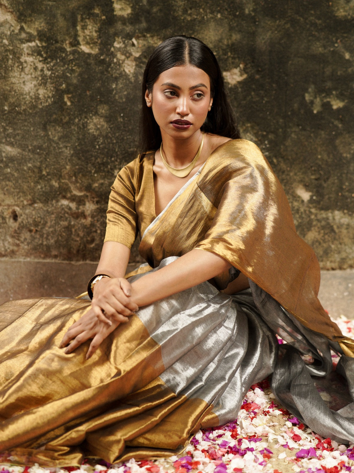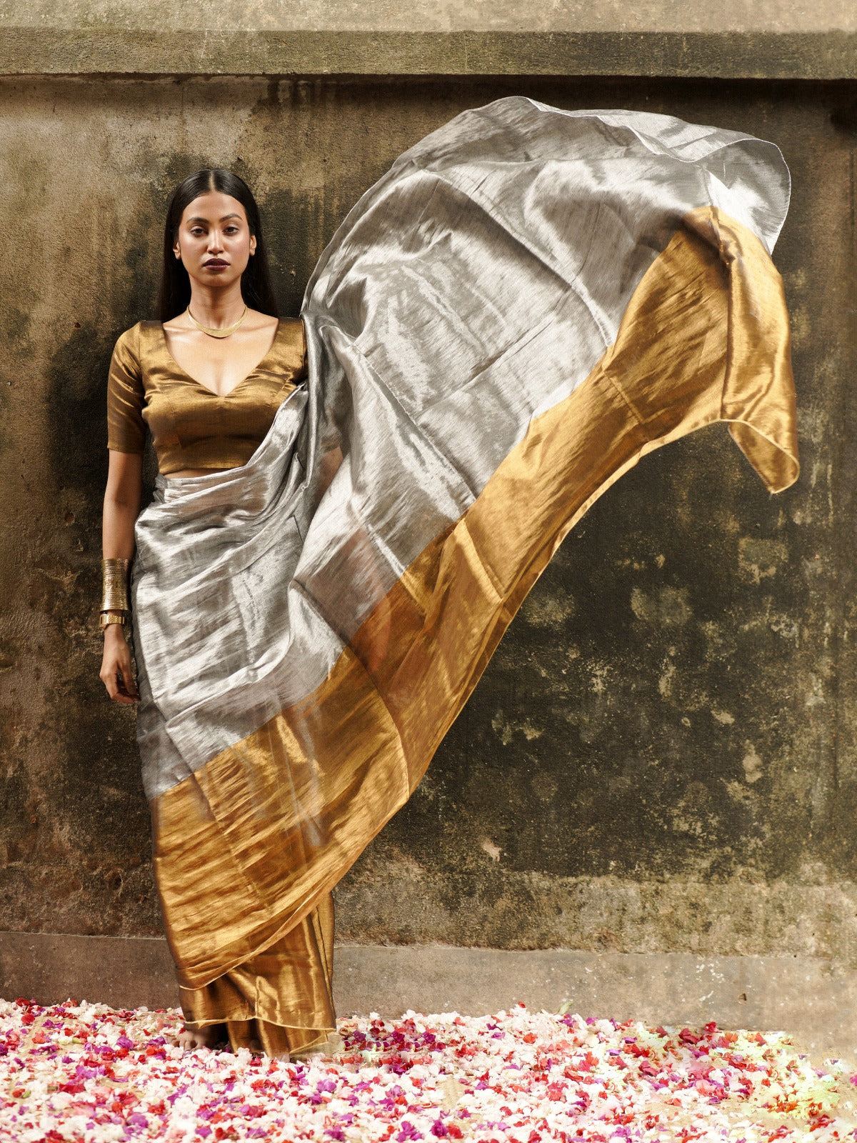 Meticulously crafted over two days, this exquisite handwoven tissue saree is a mesmerizing blend of tradition and modern elegance. It features a stunning interplay of metallic hues—shimmering silver seamlessly complemented by regal gold. This lightweight saree drapes effortlessly. Perfect for any celebrations, festive occasions, this saree is a statement of timeless beauty, effortlessly blending heritage craftsmanship with contemporary allure.