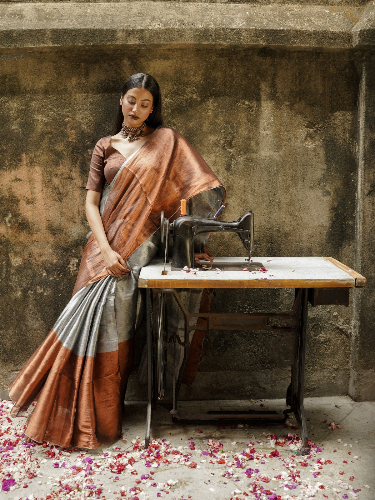 Meticulously crafted over two days , this exquisite handwoven tissue saree is a mesmerizing blend of tradition and modern elegance. It features a stunning interplay of metallic hues—shimmering silver seamlessly complemented by regal copper. This lightweight saree drapes effortlessly. Perfect for any celebrations, festive occasions, this saree is a statement of timeless beauty, effortlessly blending heritage craftsmanship with contemporary allure.