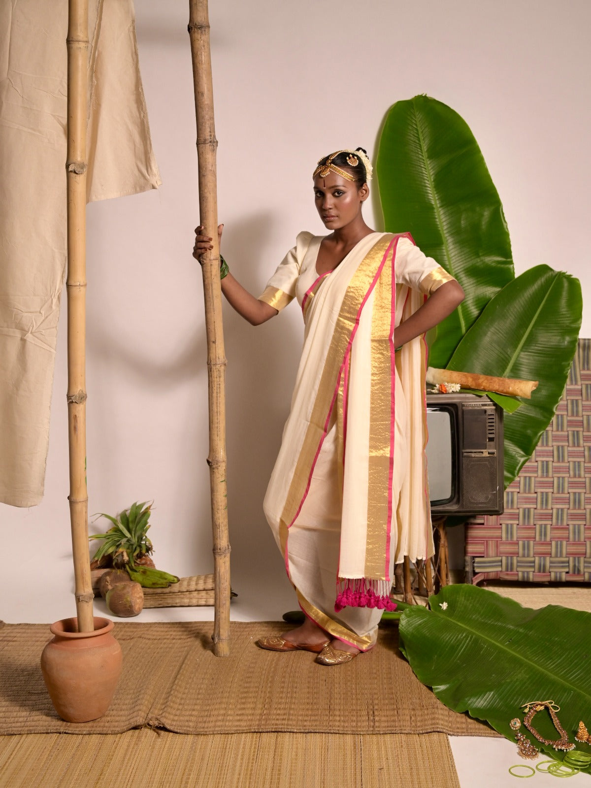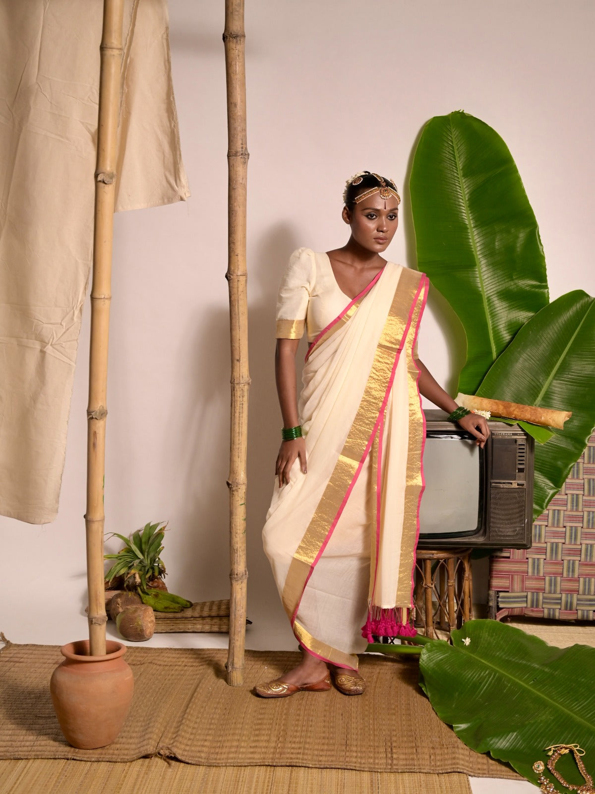 Embrace effortless grace with this off-white mul cotton saree, meticulously woven over five days. The soft, breathable fabric feels light and comfortable against the skin, making it perfect for long hours of wear. Its elegant gold and pink zari border beautifully frames the serene white base, adding a touch of festive warmth to its subtle charm. Ideal for intimate gatherings, rituals, or quiet celebrations, this saree blends timeless simplicity with delicate vibrance.