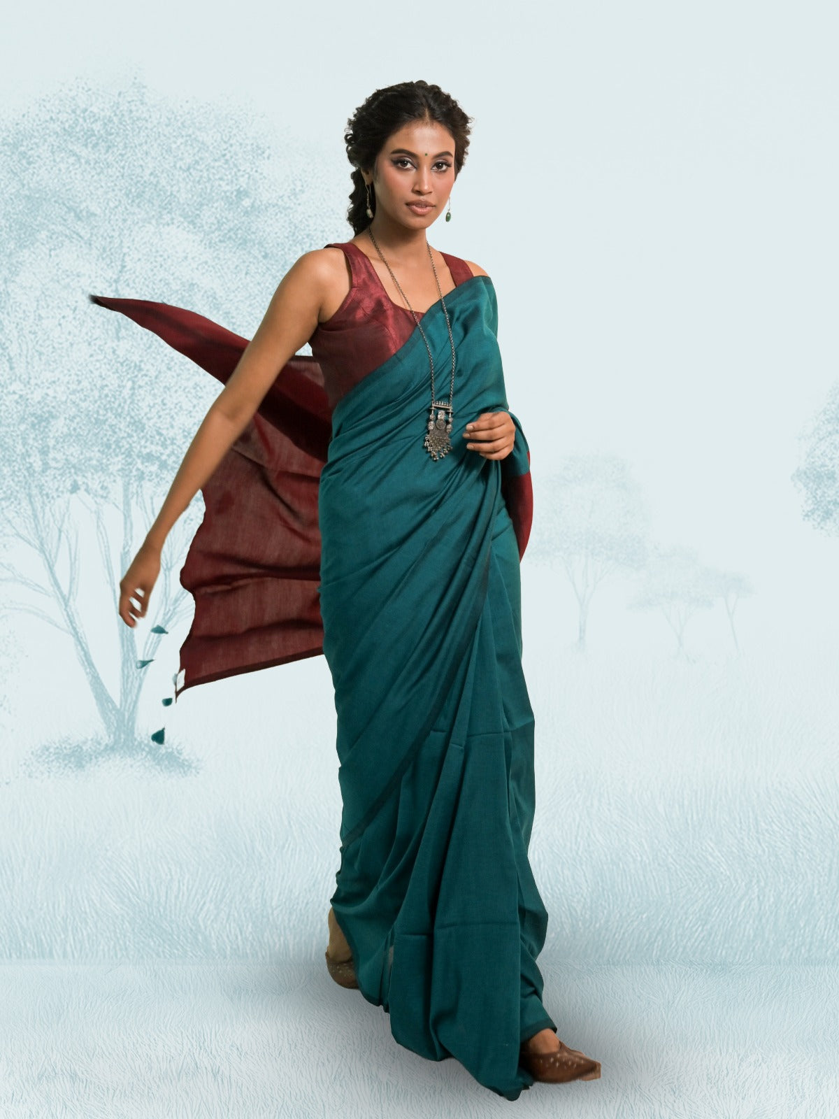 This color-blocked handwoven sea green saree with a contrasting maroon pallu is made from a soft cotton-acrylic blend for comfort and durability. The pallu is finished with matching sea green tassels, adding a refined touch to the design. Handwoven over two days, this saree effortlessly combines rich colors with exceptional craftsmanship. Perfect for those who love bold, elegant style.