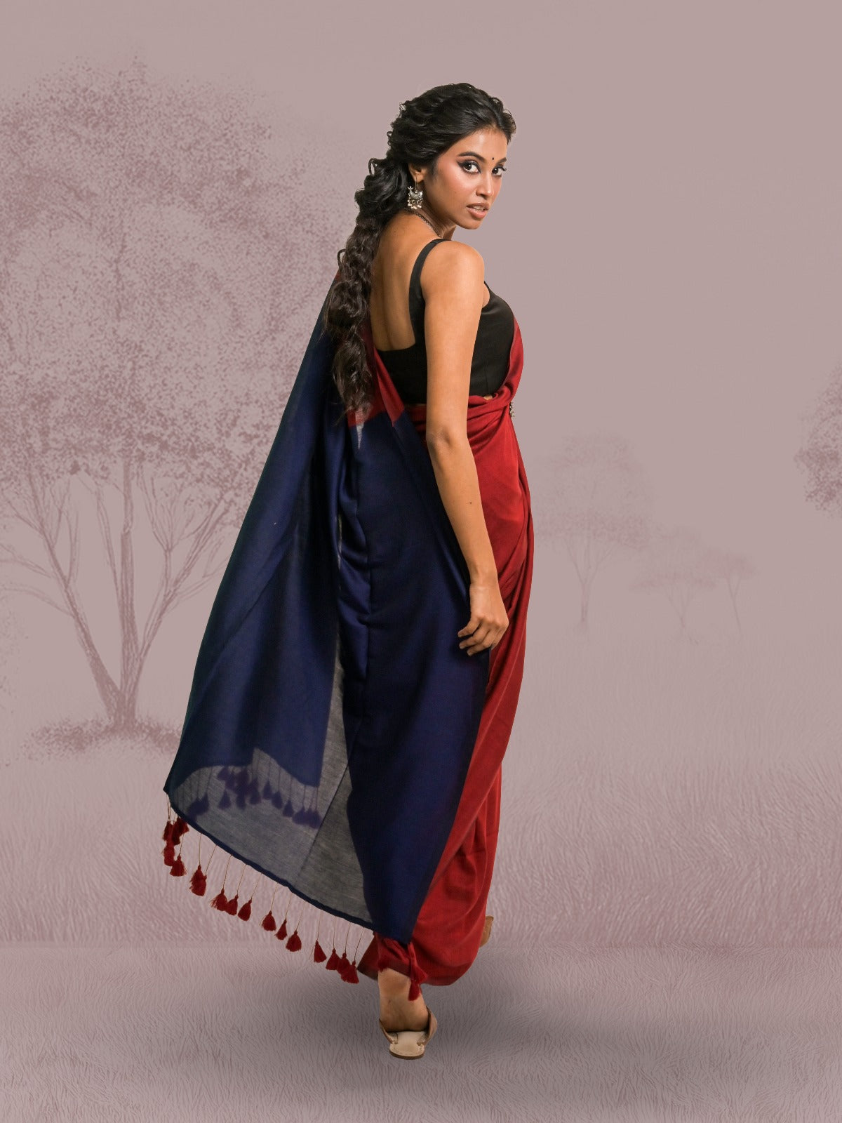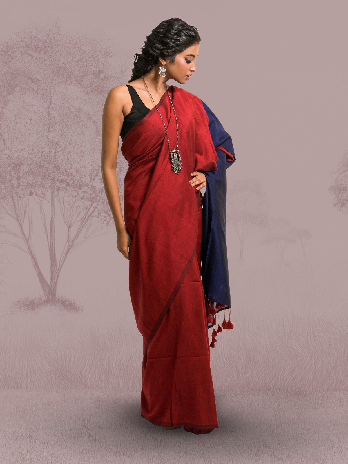 This color-blocked handwoven red saree with a vibrant blue pallu is crafted from a soft cotton-acrylic blend, ensuring both comfort and durability. The pallu is finished with matching red tassels, adding a touch of elegance. Handwoven over two days, this saree combines bold colors with exceptional craftsmanship, making it a perfect choice for those who appreciate striking style and quality.
