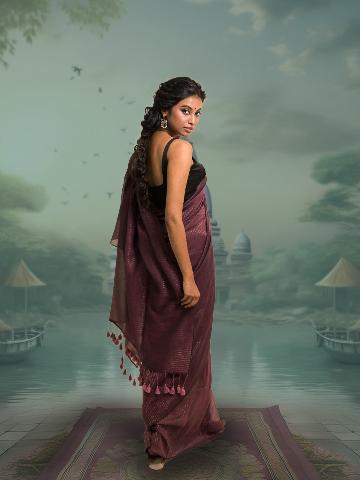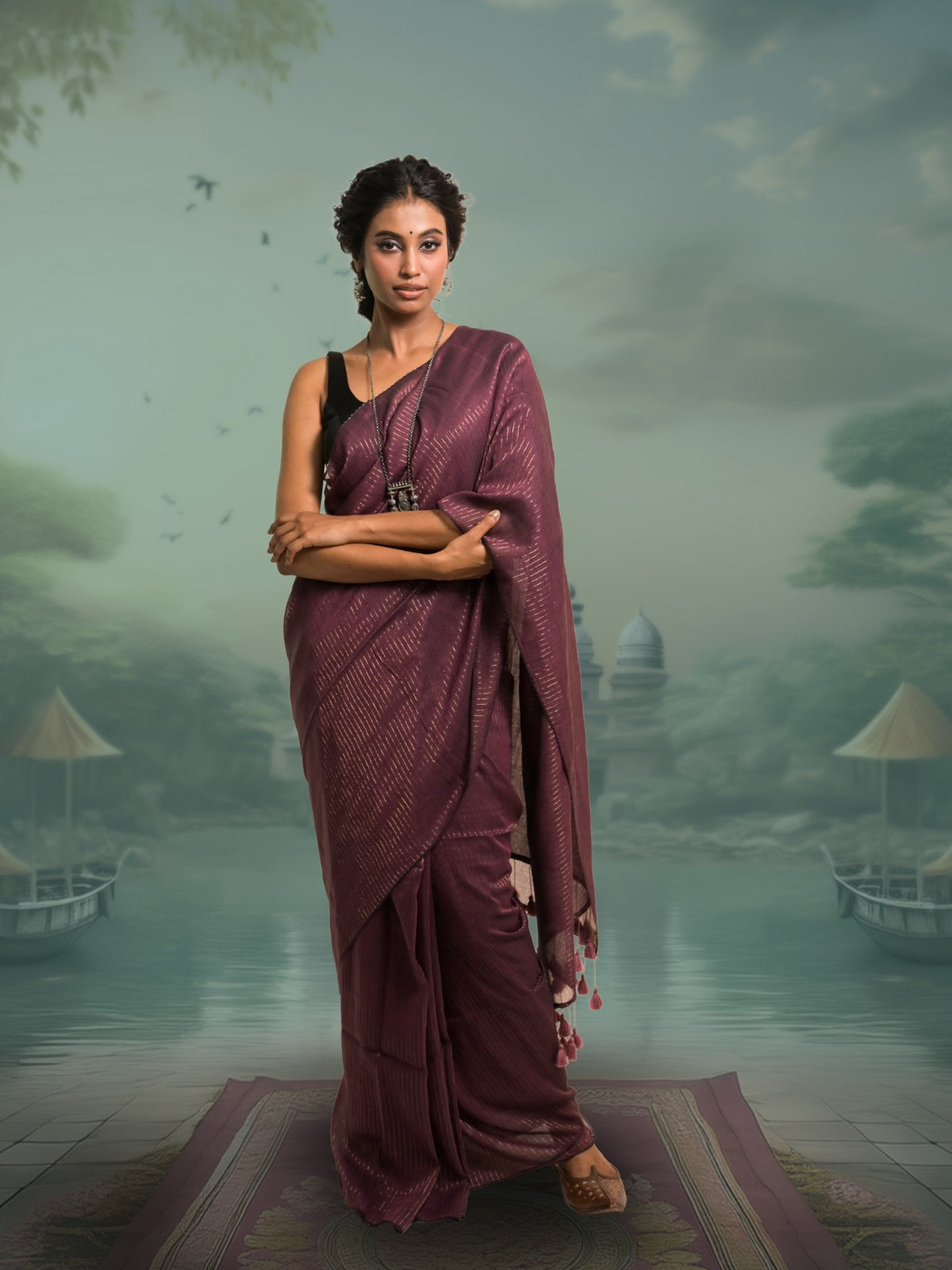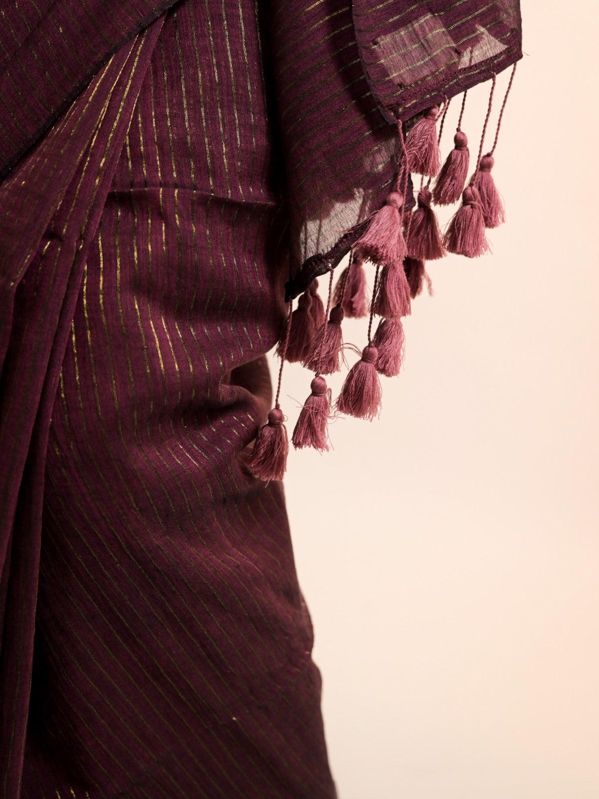 This sumptuous burgundy mul cotton saree is handwoven over two days and adorned with delicate golden pinstripes that add a subtle touch of elegance. The pallu features matching burgundy tassels and fine gold zari detailing, creating a rich, sophisticated contrast. Light, graceful, and timeless, it's perfect for those who cherish classic beauty with a hint of luxury.
