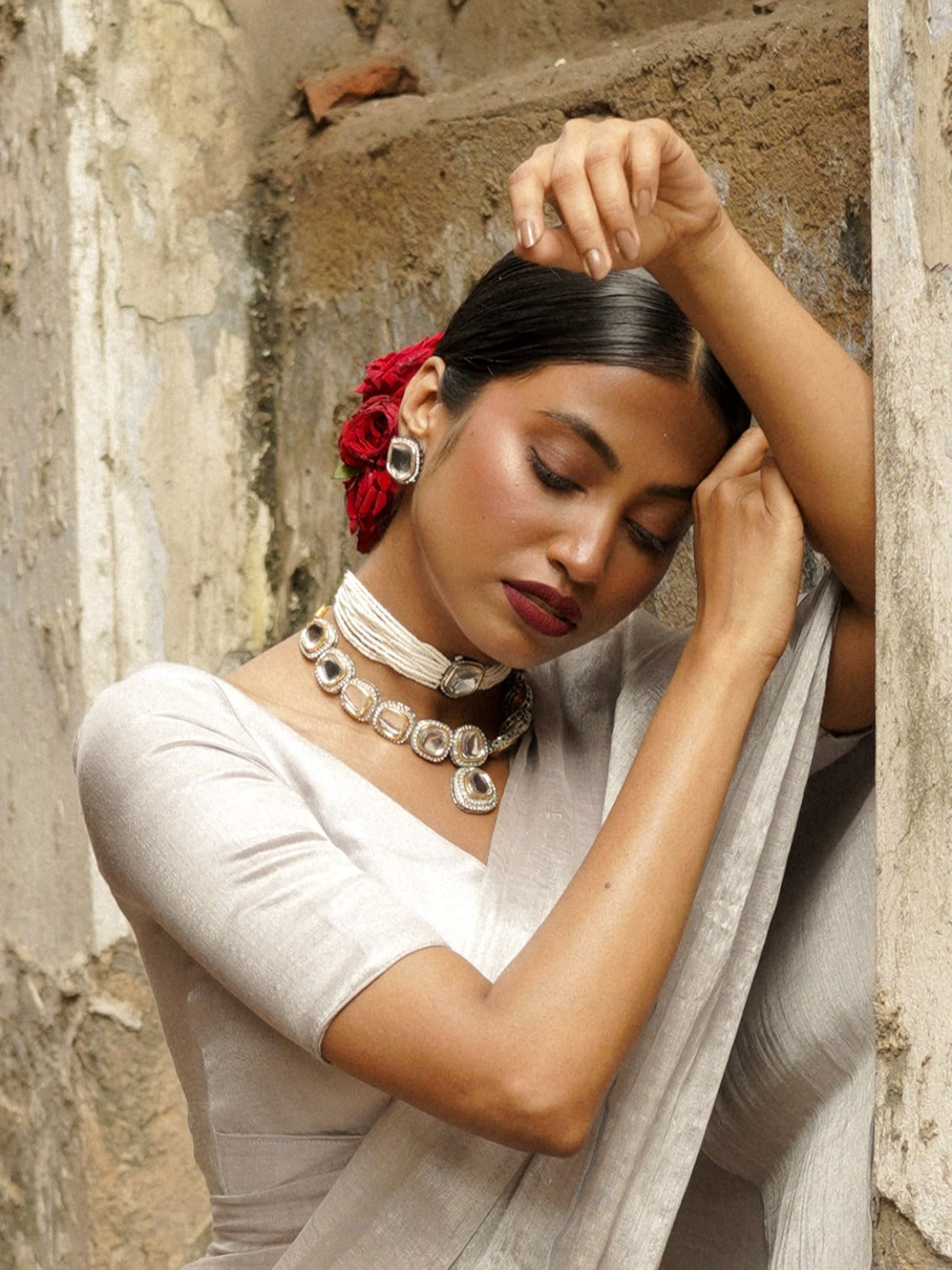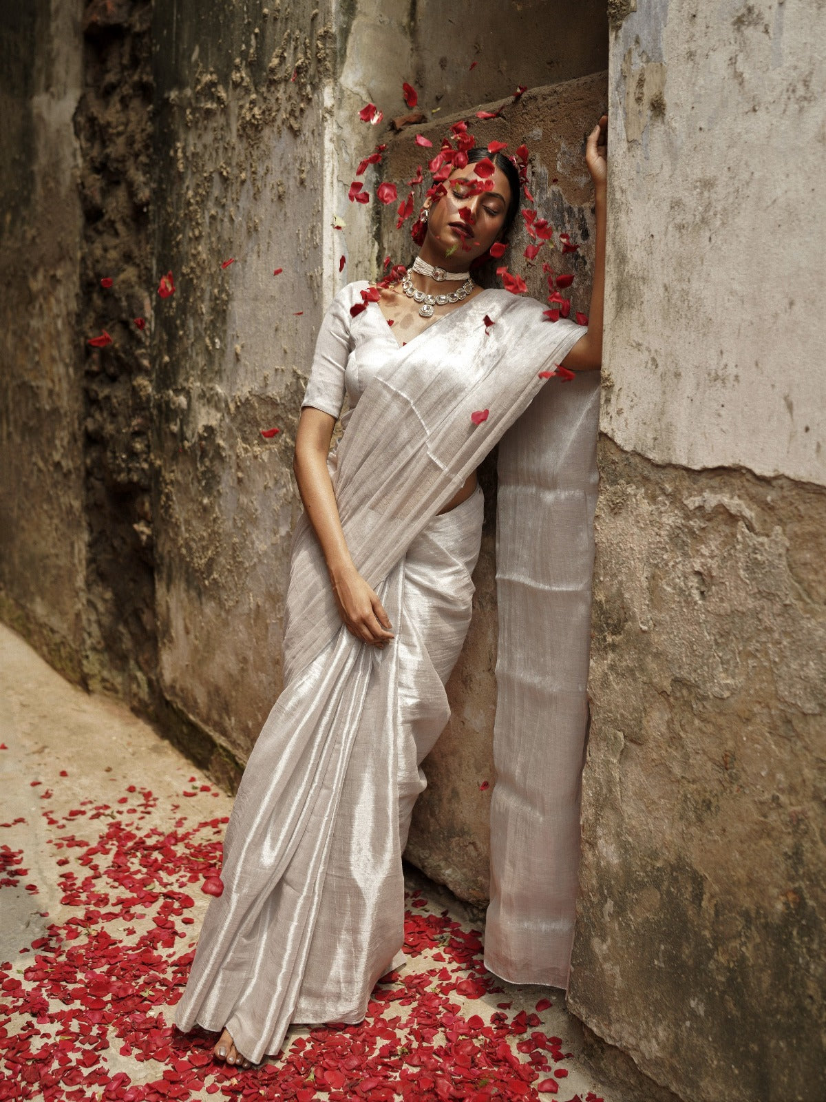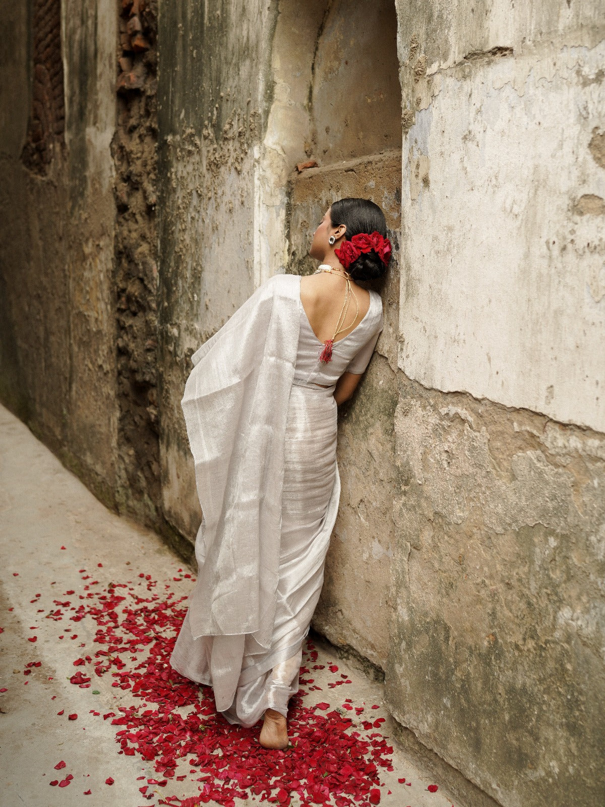 Meticulously crafted over two days, this exquisite handwoven tissue saree is a celebration of grace and timeless elegance. It features a delicate white hue that radiates softness. The lightweight and sheer texture of the saree drapes effortlessly. Perfect for any occasions, this saree blends traditional craftsmanship with contemporary charm.
