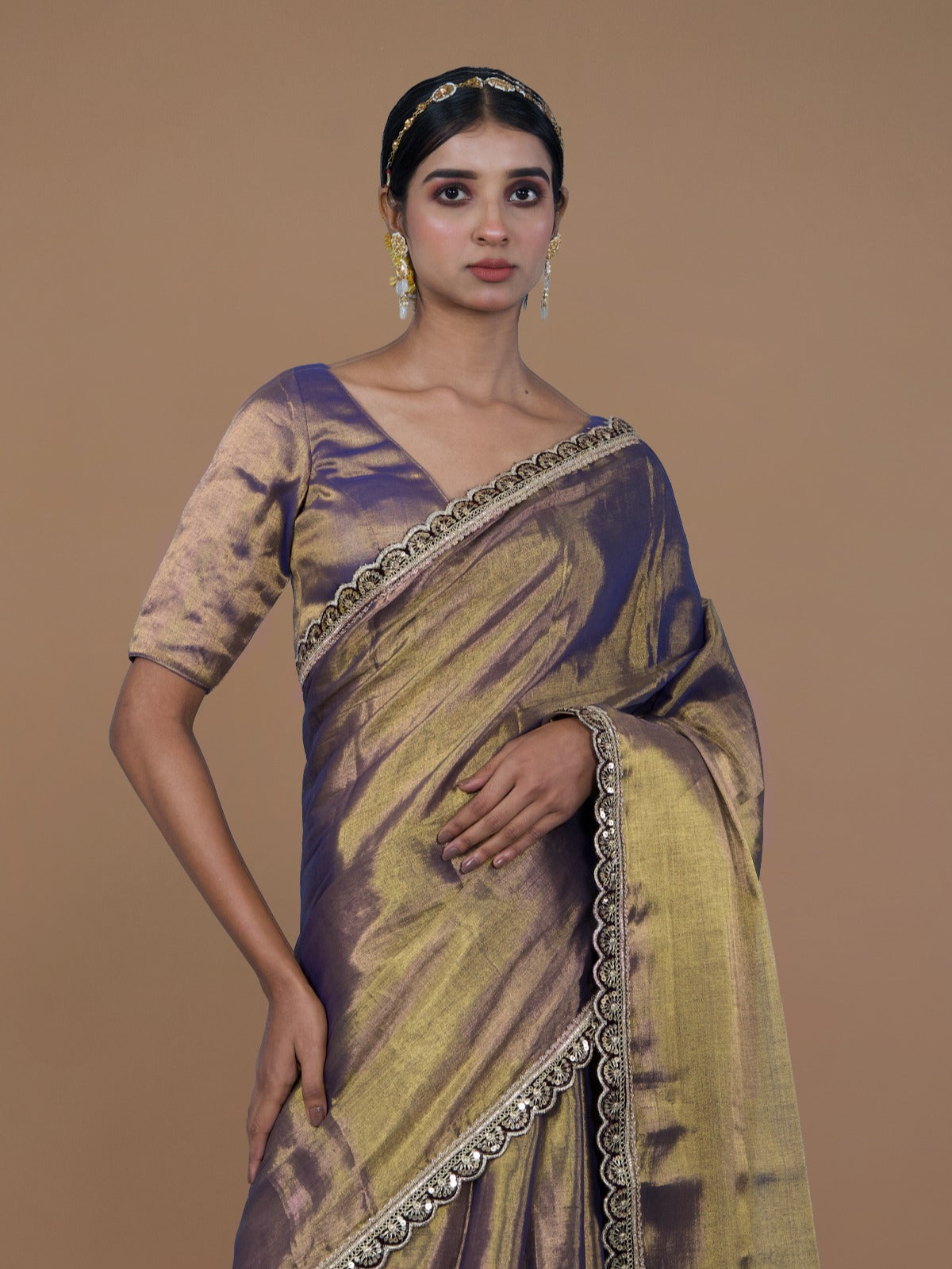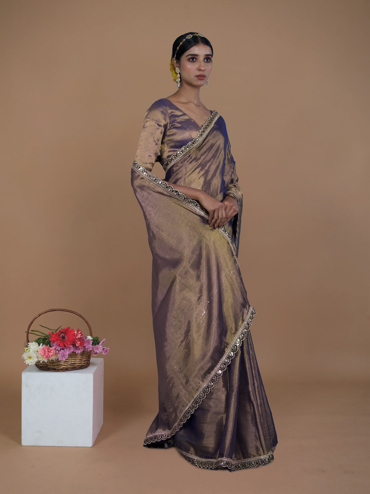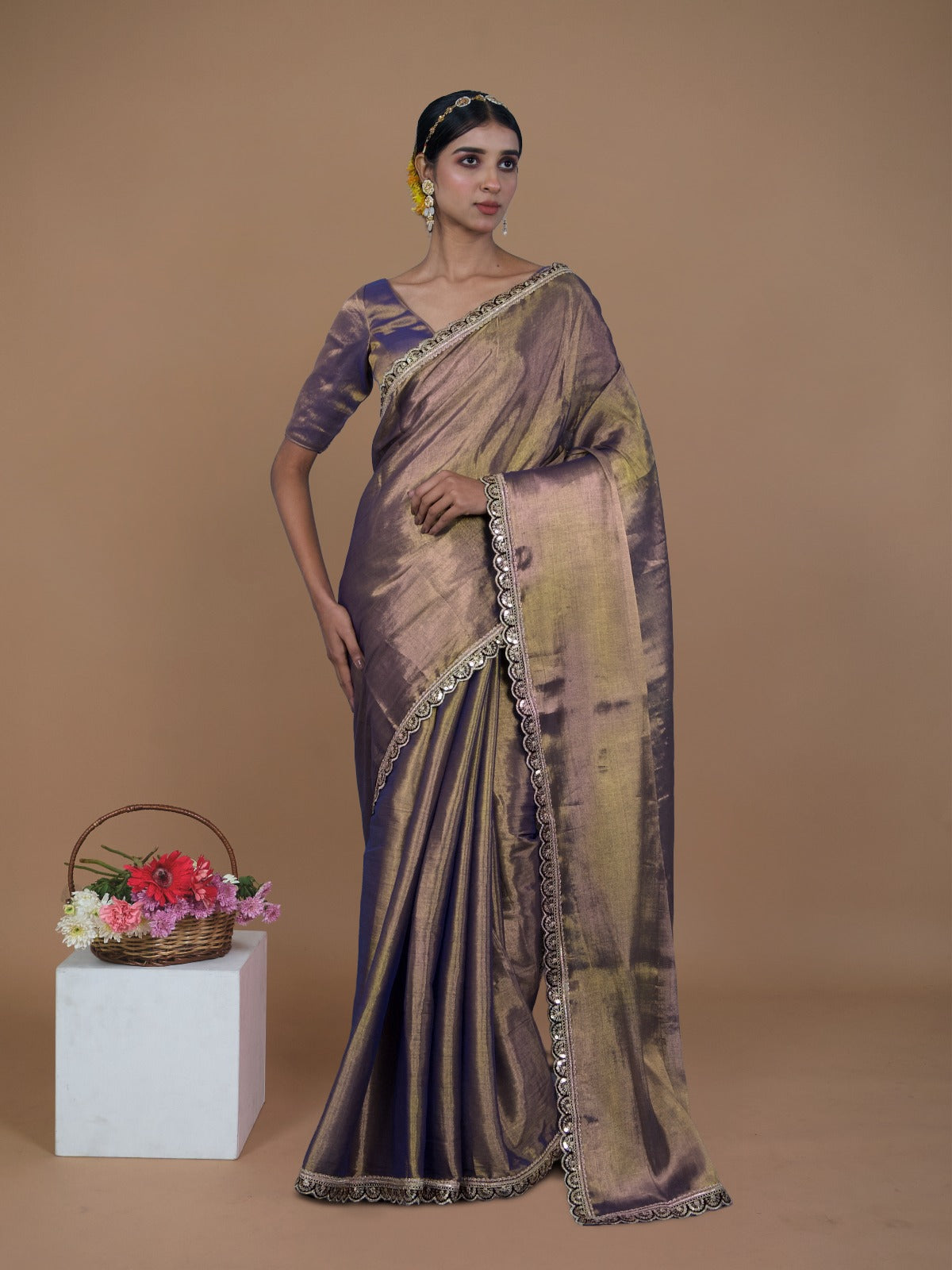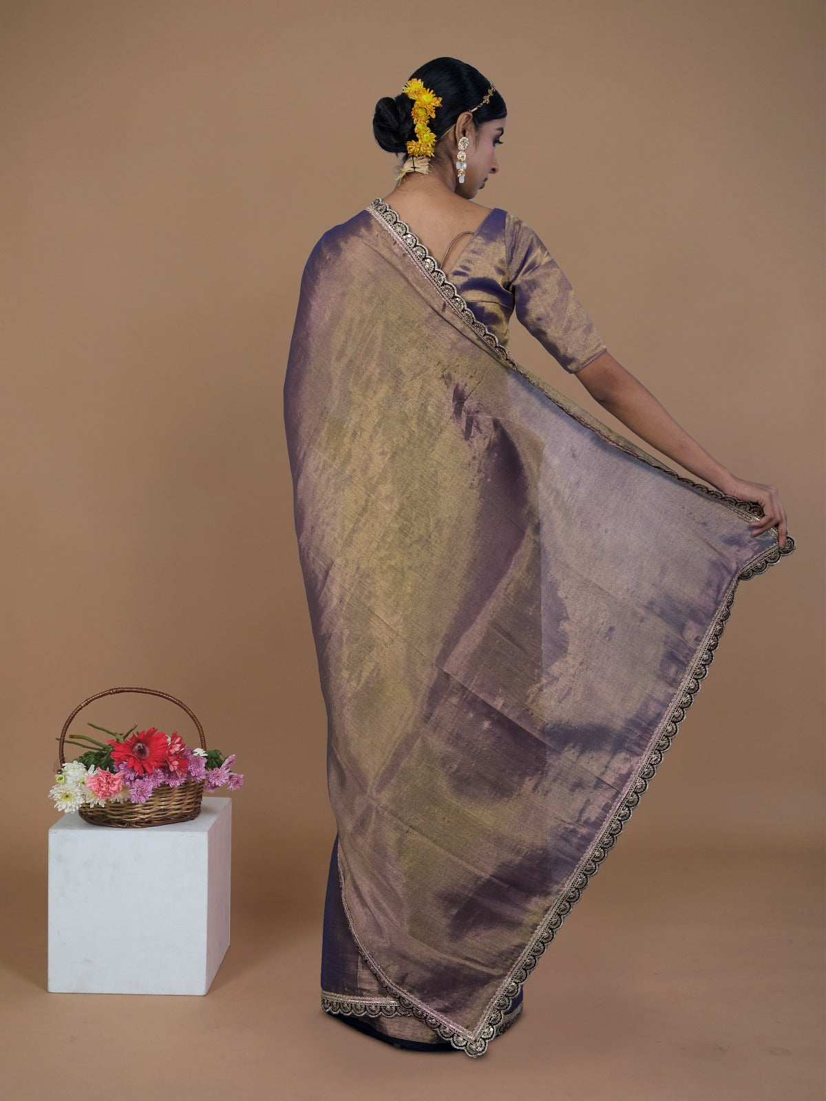 Elevate your festive style with this handwoven dual-tone tissue saree in purple and gold. Crafted over 4 days, it features elegant purple scalloped lace on the pallu and borders, adding a touch of regal charm to its luminous drape. Light, graceful, and beautifully detailed, this saree is perfect for evening gatherings and special celebrations.