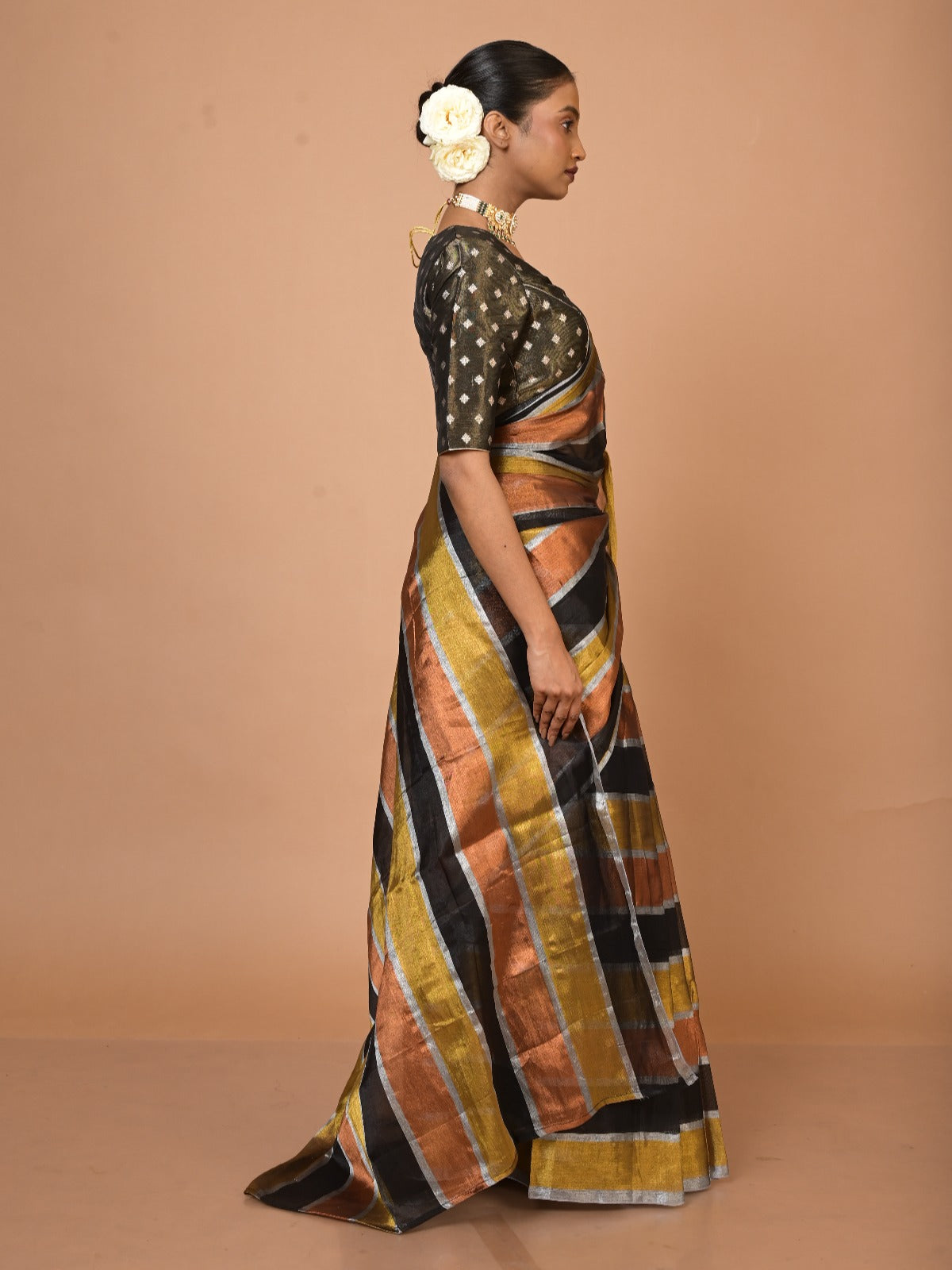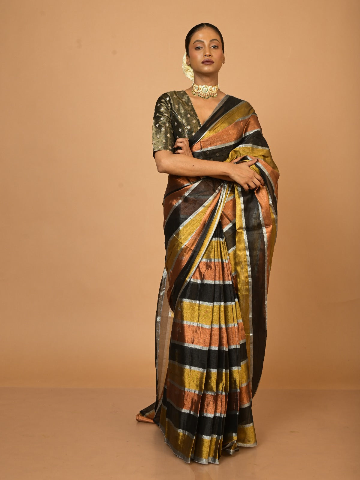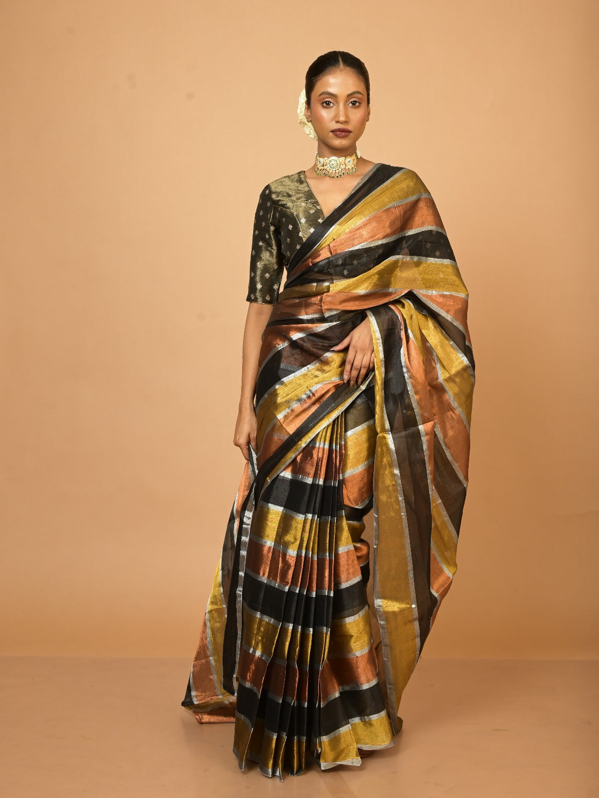 This metallic gold-striped tissue saree reflects the dawn of a new journey, echoing the radiant transformations a woman experiences after marriage. Its shimmering texture embodies resilience and grace, while the understated elegance of gold stripes symbolizes the balance between tradition and modernity—a perfect ode to evolving identities and timeless beauty.
