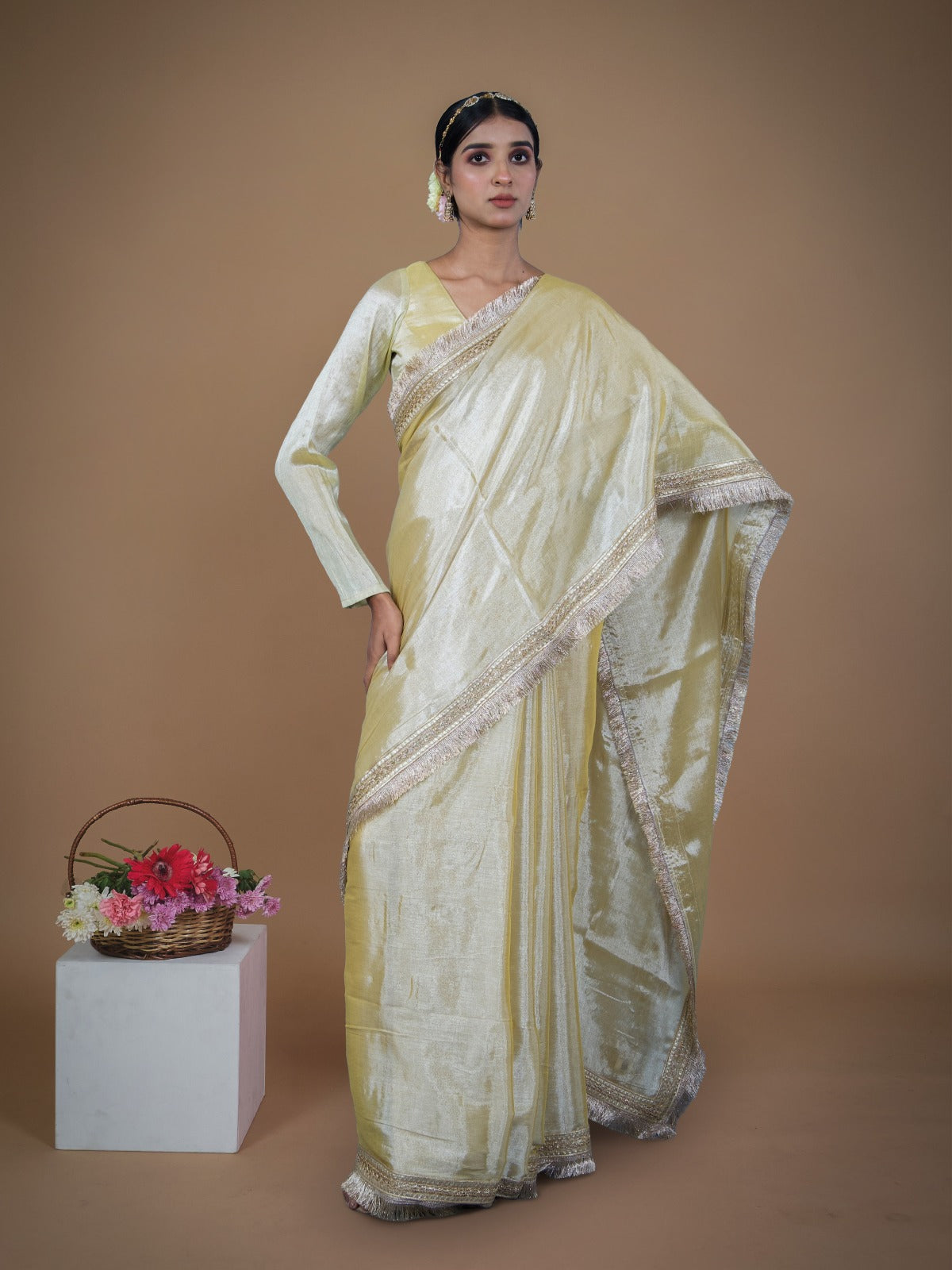 Illuminate your festive style with this handwoven neon yellow tissue saree. Crafted over 4 days, it features matte gold kiran lace on the pallu and borders, adding a touch of classic elegance to its vibrant yellow glow. Light, airy, and radiant, this saree drapes beautifully, making it perfect for daytime celebrations and joyful gatherings.
