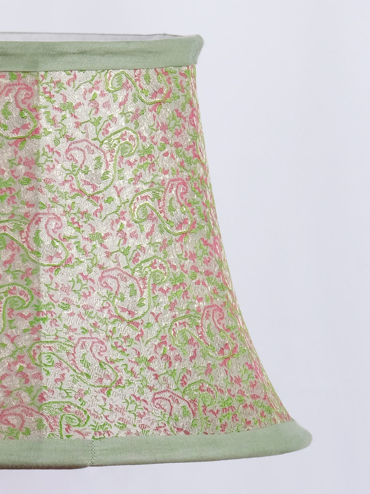 Made from rich Banarasi brocade with intricate metallic patterns, this Bell Lampshade exudes opulence and timeless elegance. Its subtle shimmer creates a regal, warm glow, perfect for luxury-inspired interiors.