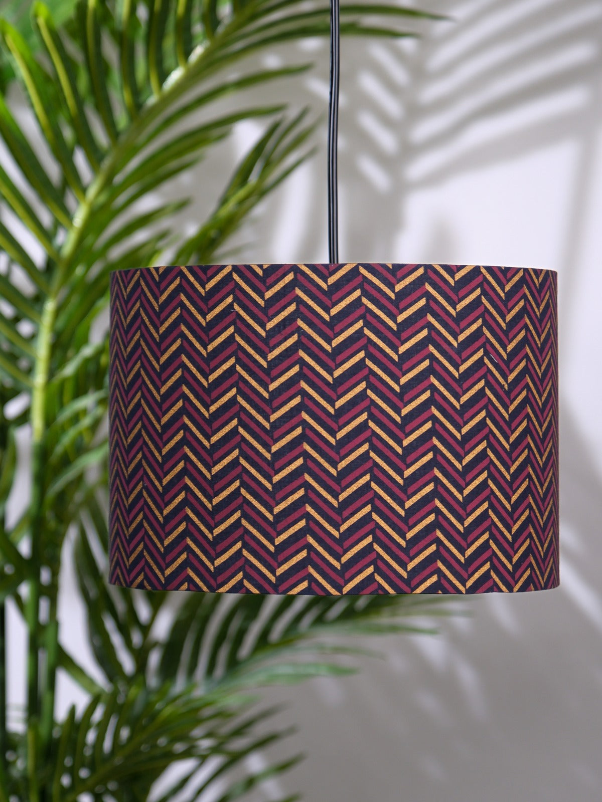 A modern classic, this Chevron Block Print Drum Lampshade features sleek black and gold patterns for a contemporary yet warm look. Perfect for stylish and minimalist homes.