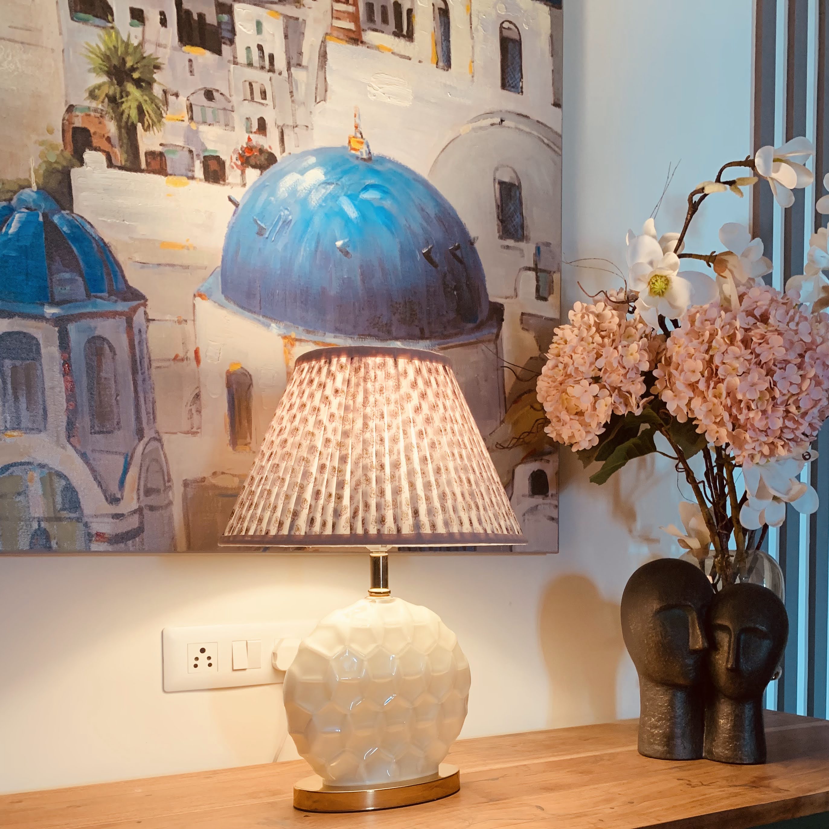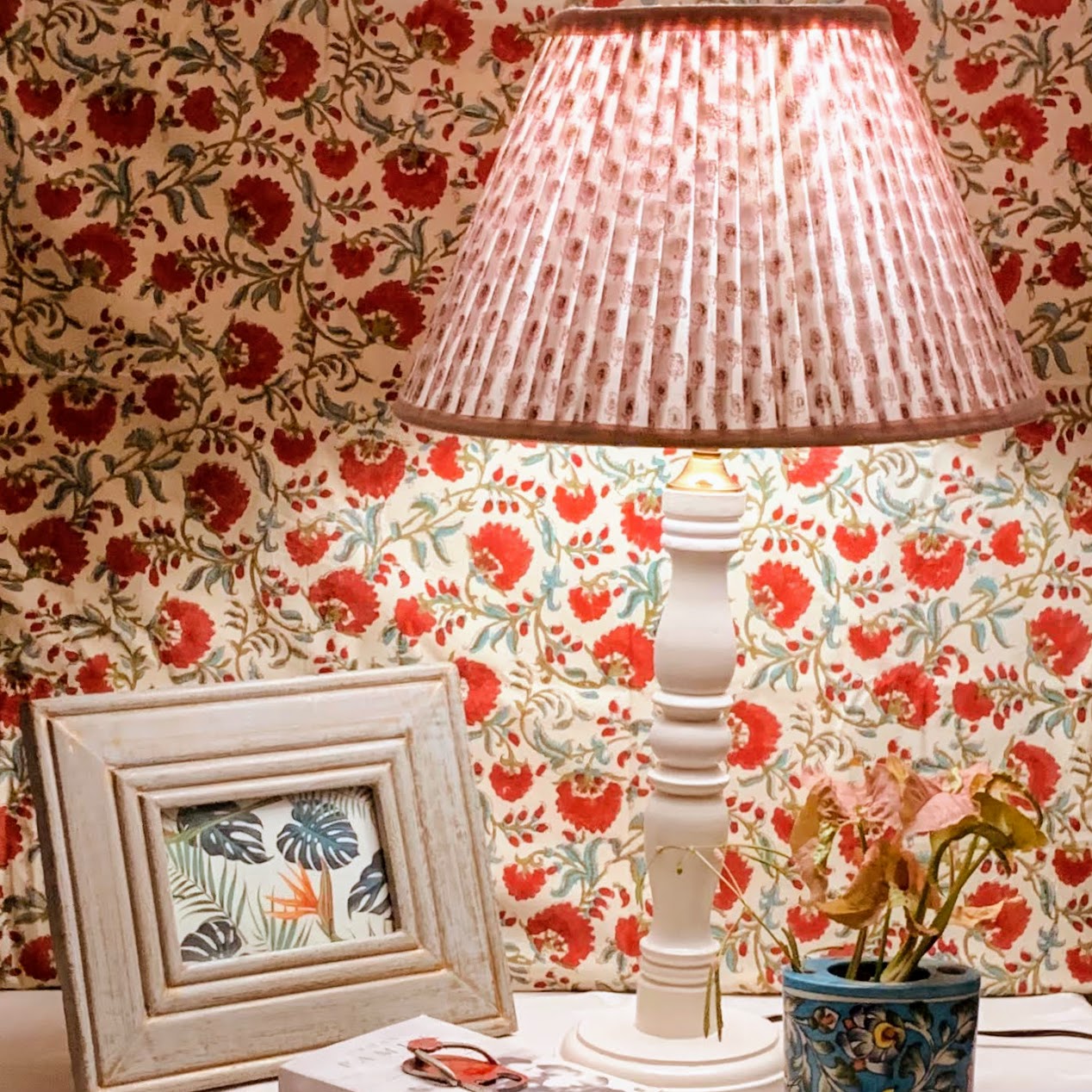 Soft pink paisley prints, hand block printed in Sanganer, lend romantic charm to this Empire Lampshade. Delicate and graceful, it creates a warm, soothing ambiance, perfect for bedrooms or lounges.