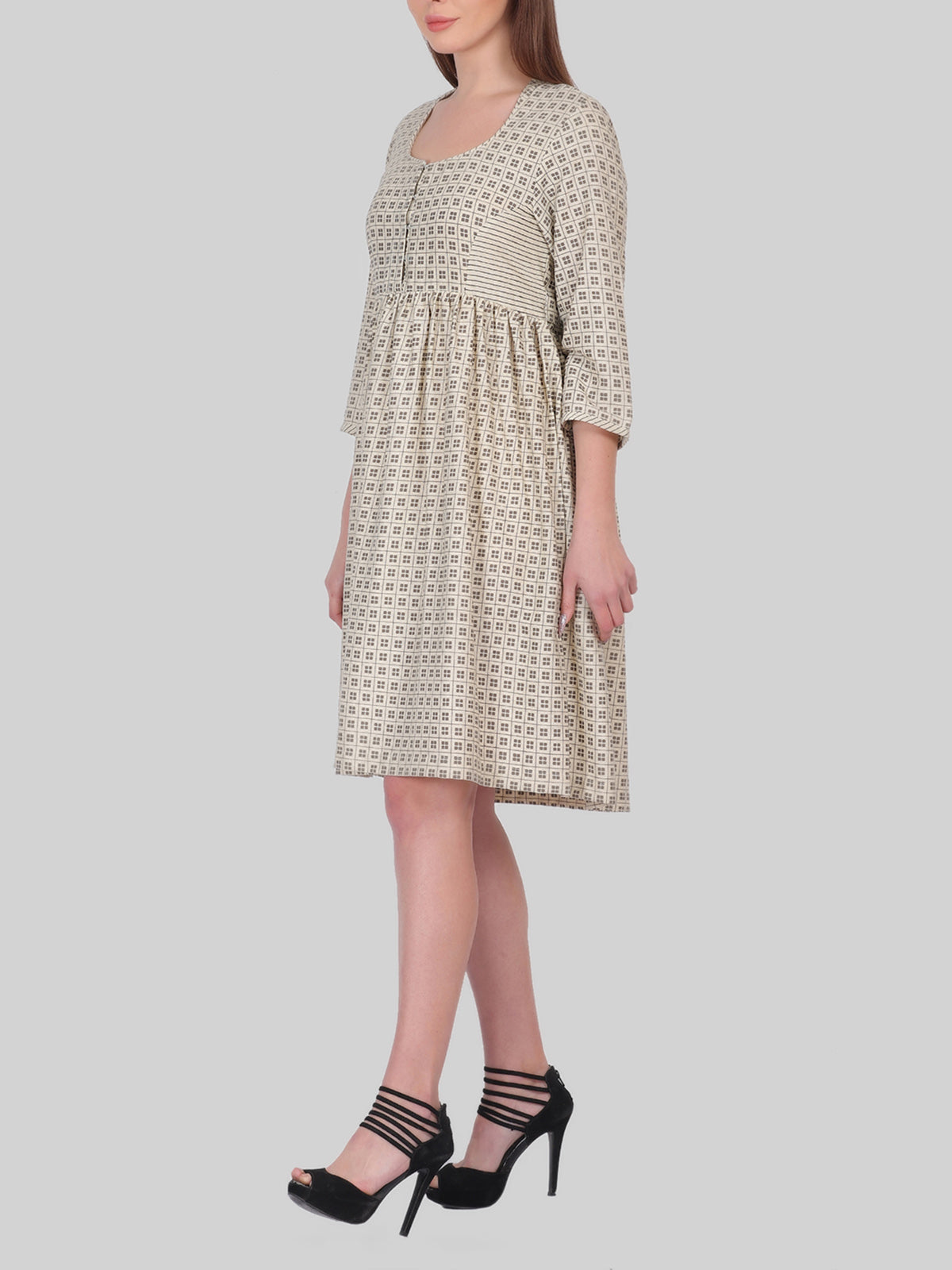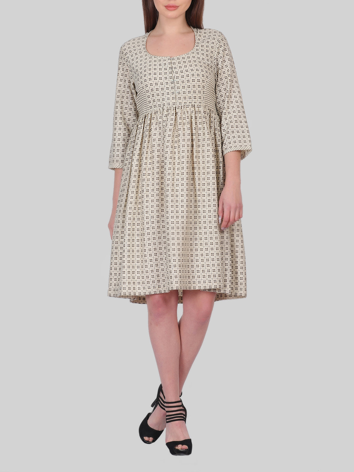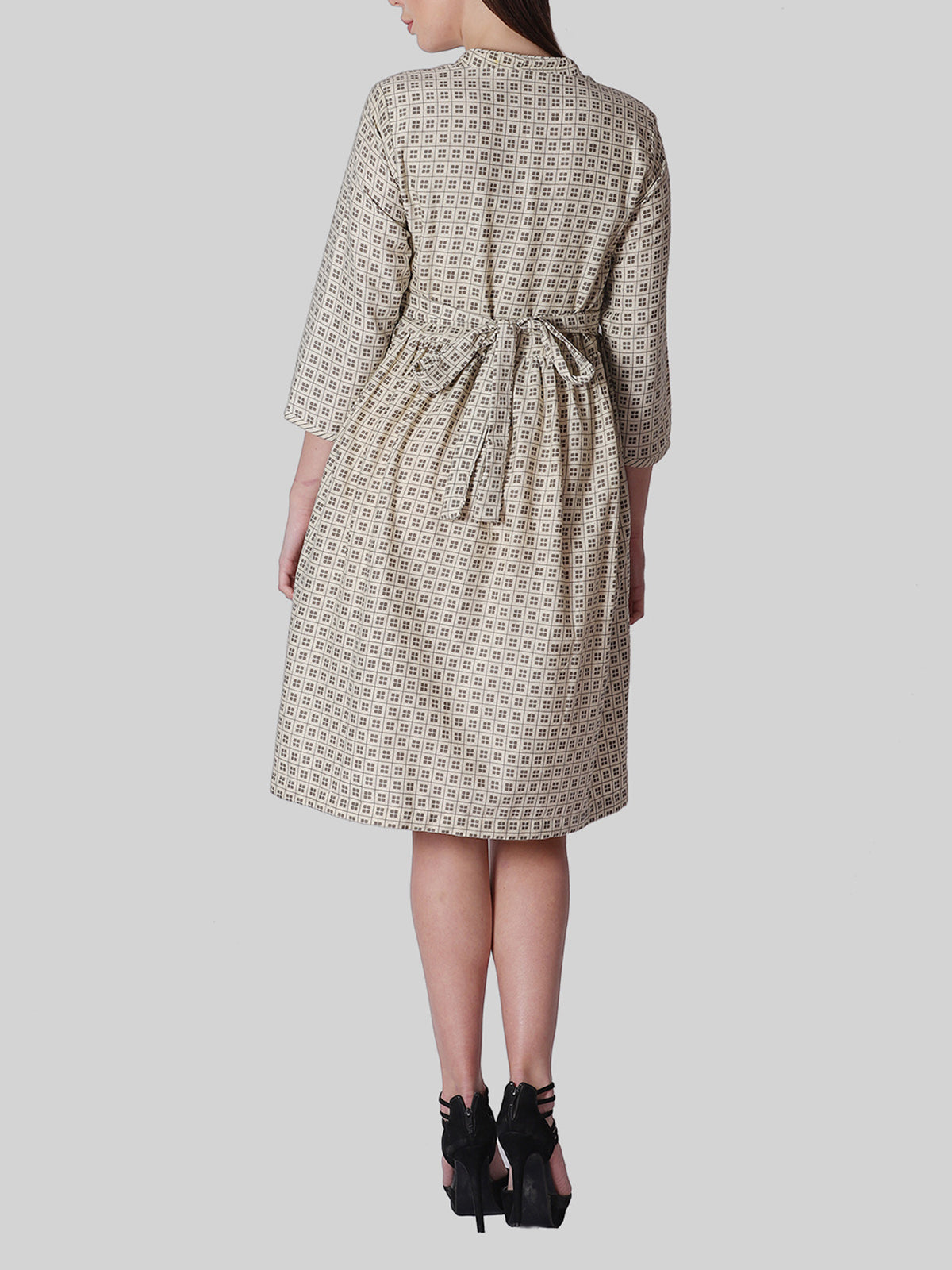This dress is made of light weight khadi with a classy combination of beige and black. Natural black dye from fermented iron and Myrobalan (Harda) are used for screen print in miniature geometric print.