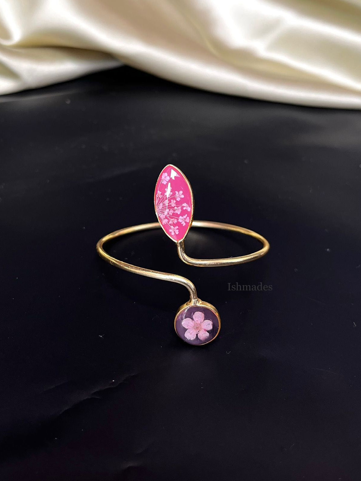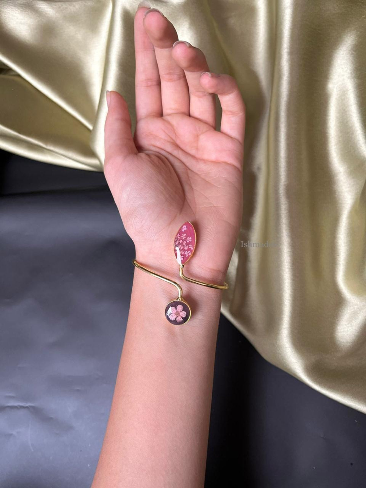 Introducing the Ramya Kadha, a stunning statement piece exclusively crafted with delicate baby pink plum blossoms and baby pink Queen Anne's lace flowers. This charming accessory is set in a luxurious gold setting, offering a stylish shape and structure that beautifully complements any outfit, whether formal or traditional. The adjustable design ensures a perfect fit, making it an ideal choice for pairing with your favorite ethnic wear. Ramya, meaning "charming" in Sanskrit, perfectly encapsulates the elegance and allure of this kadha. Please note, the model showcasing the Ramya Kadha in the picture has slender wrists; the piece may appear larger on her, but rest assured, its adjustable nature guarantees it will suit a variety of wrist sizes comfortably. Embrace the charm and sophistication of the Ramya Kadha, a timeless accessory designed to elevate your style.