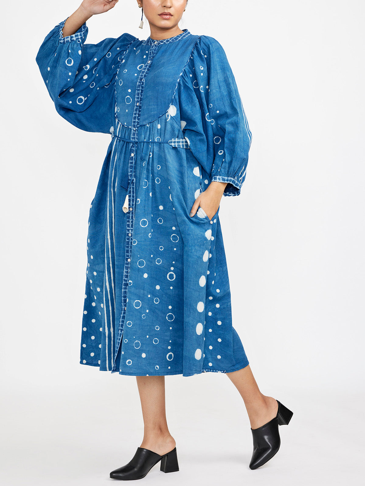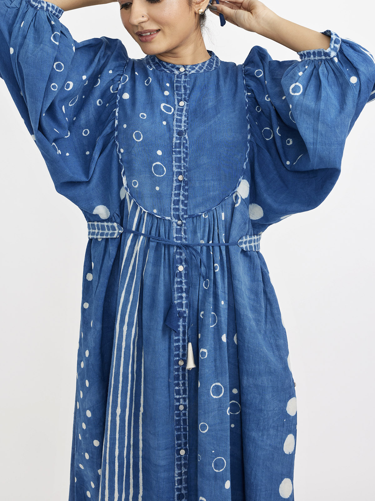 This midi dress features a mandarin collar neck and voluminous sleeves with gathered detailing at the waistline. It offers a button-down opening with solid accents and a block printed checked flared hem, adding a touch of contemporary style. Complete with attached lining, JG signature button knot details, and a waist-contouring belt, this dress is both elegant and versatile for various occasions.