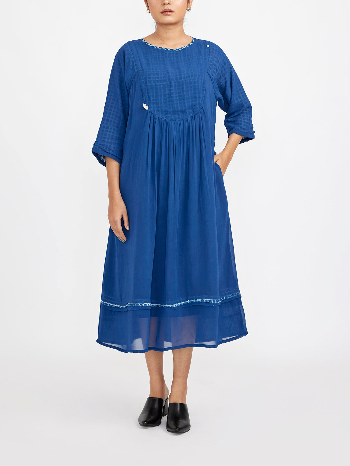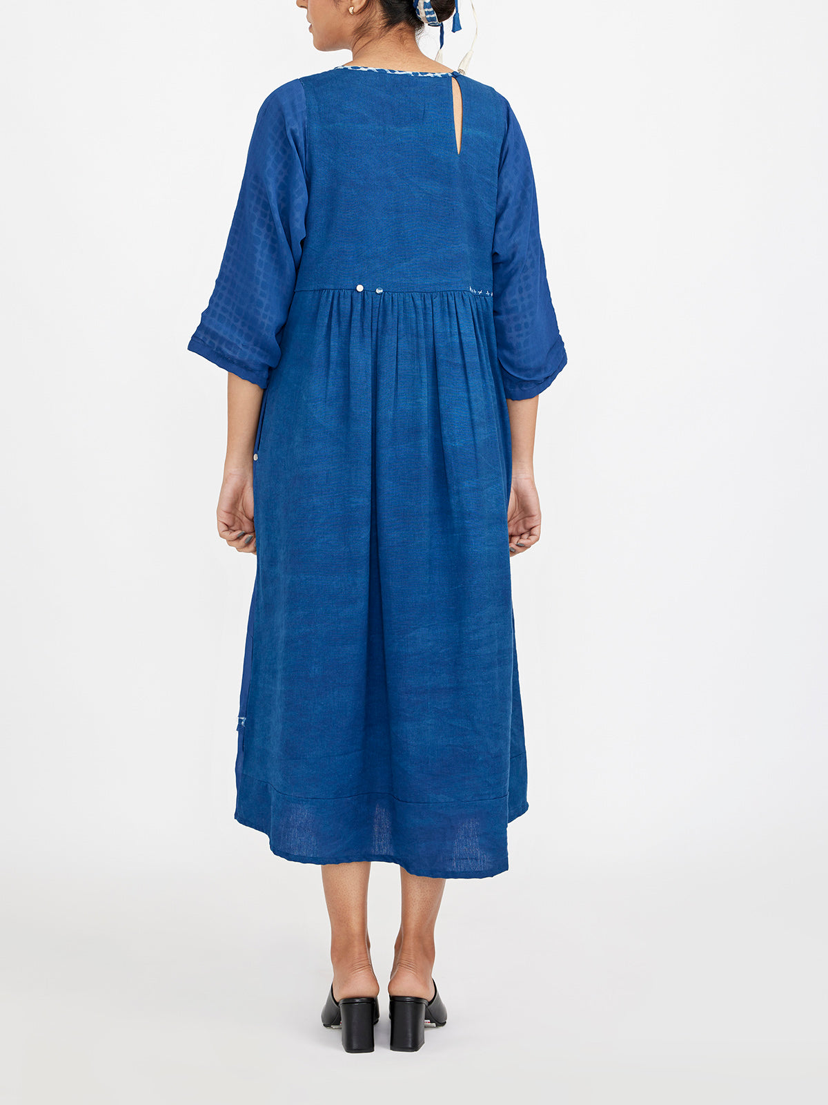 This handcrafted midi dress combines natural dyed indigo chiffon at the front with linen at the back, creating a unique fit-and-flare silhouette. It features a raw edge hem for a modern touch and comes with attached lining for comfort. Complete with JG's signature button knot details, this dress is both stylish and versatile, perfect for enhancing your wardrobe with a blend of elegance and contemporary design.