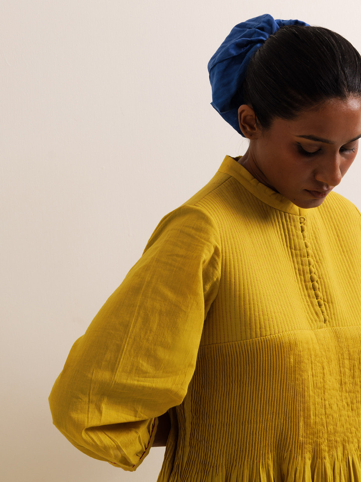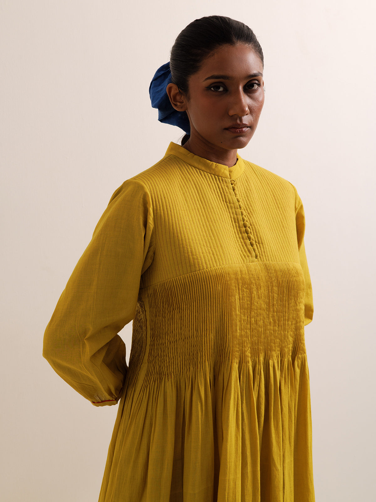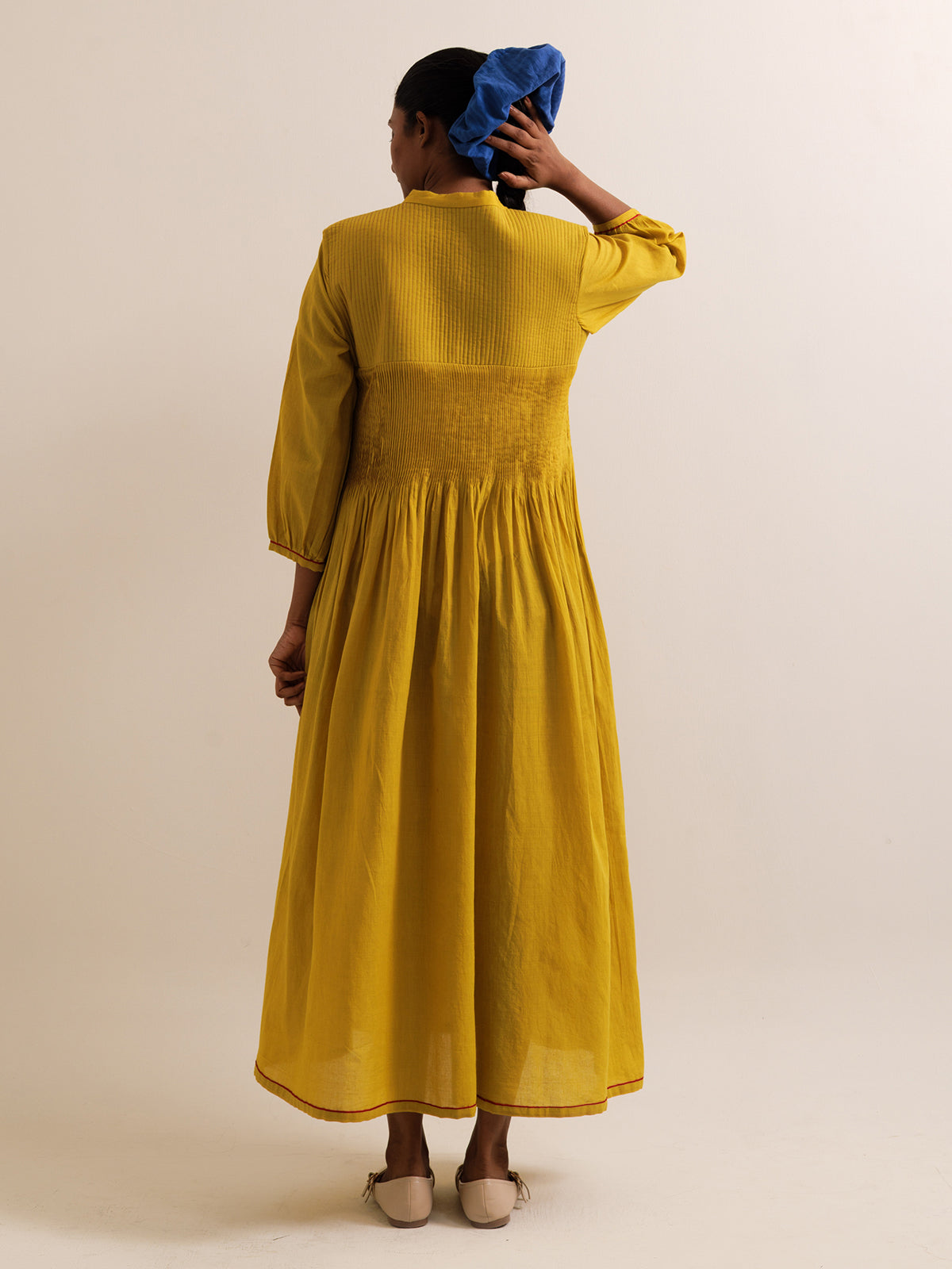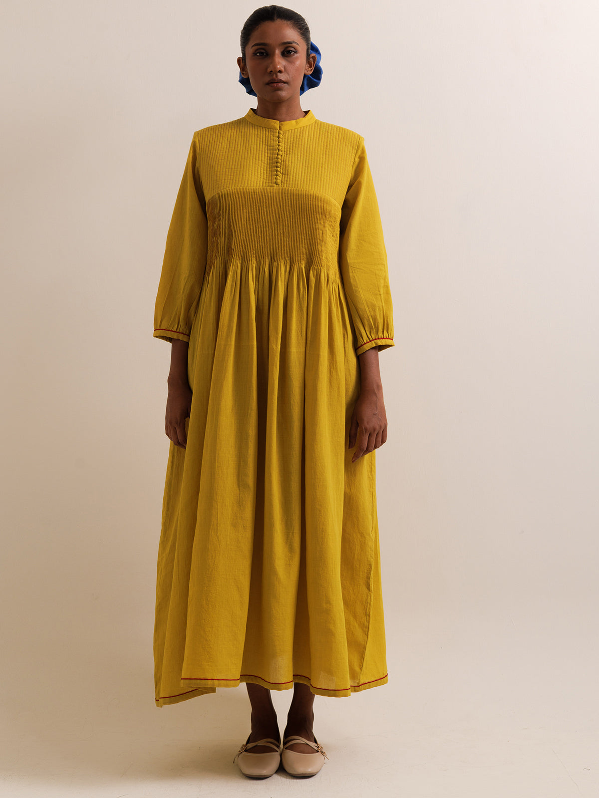 Kshitija dress made in handwoven bengal cotton, featuring a quilted yoke with button opening and collar details with pintucks. The dress has pockets and is finished with a contrast red flat piping on the hemlines of garment.