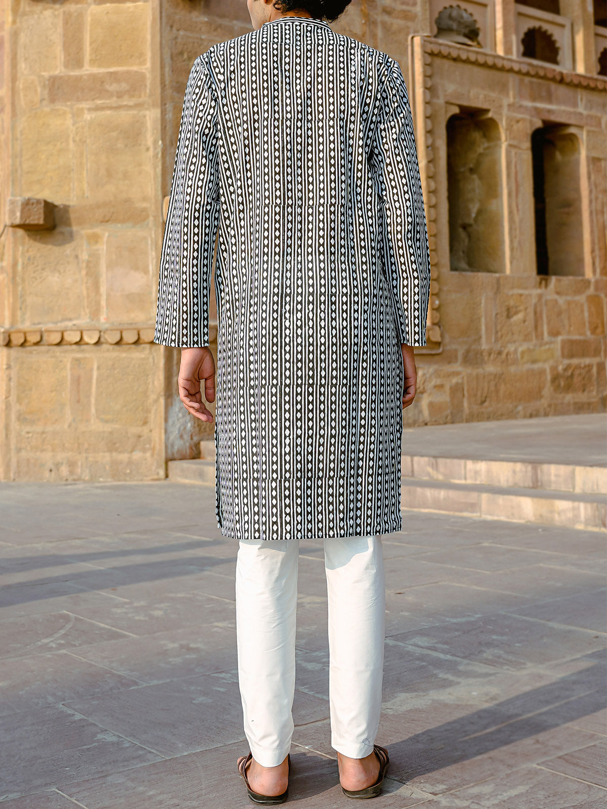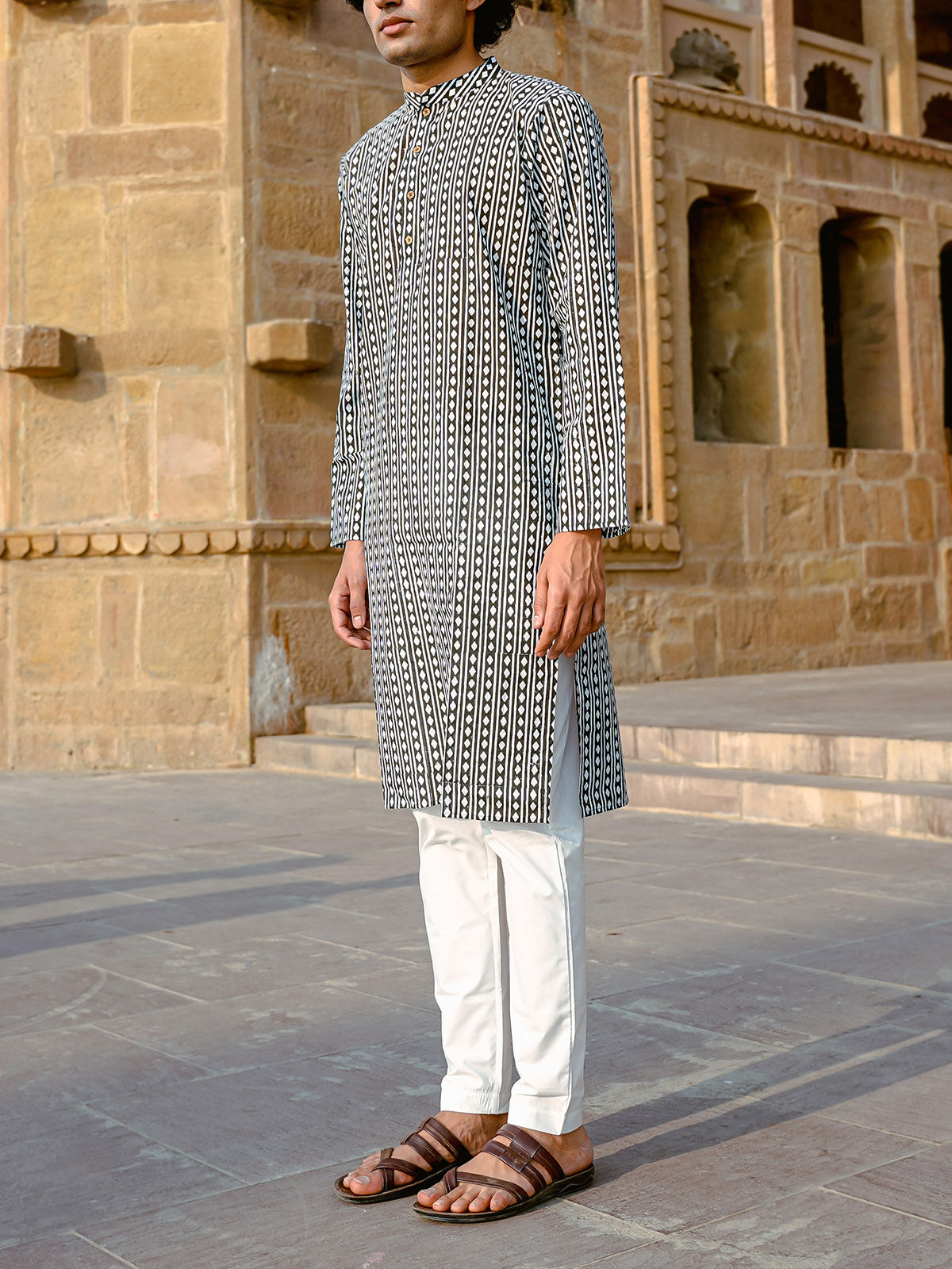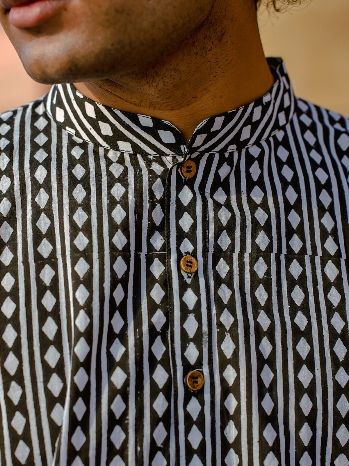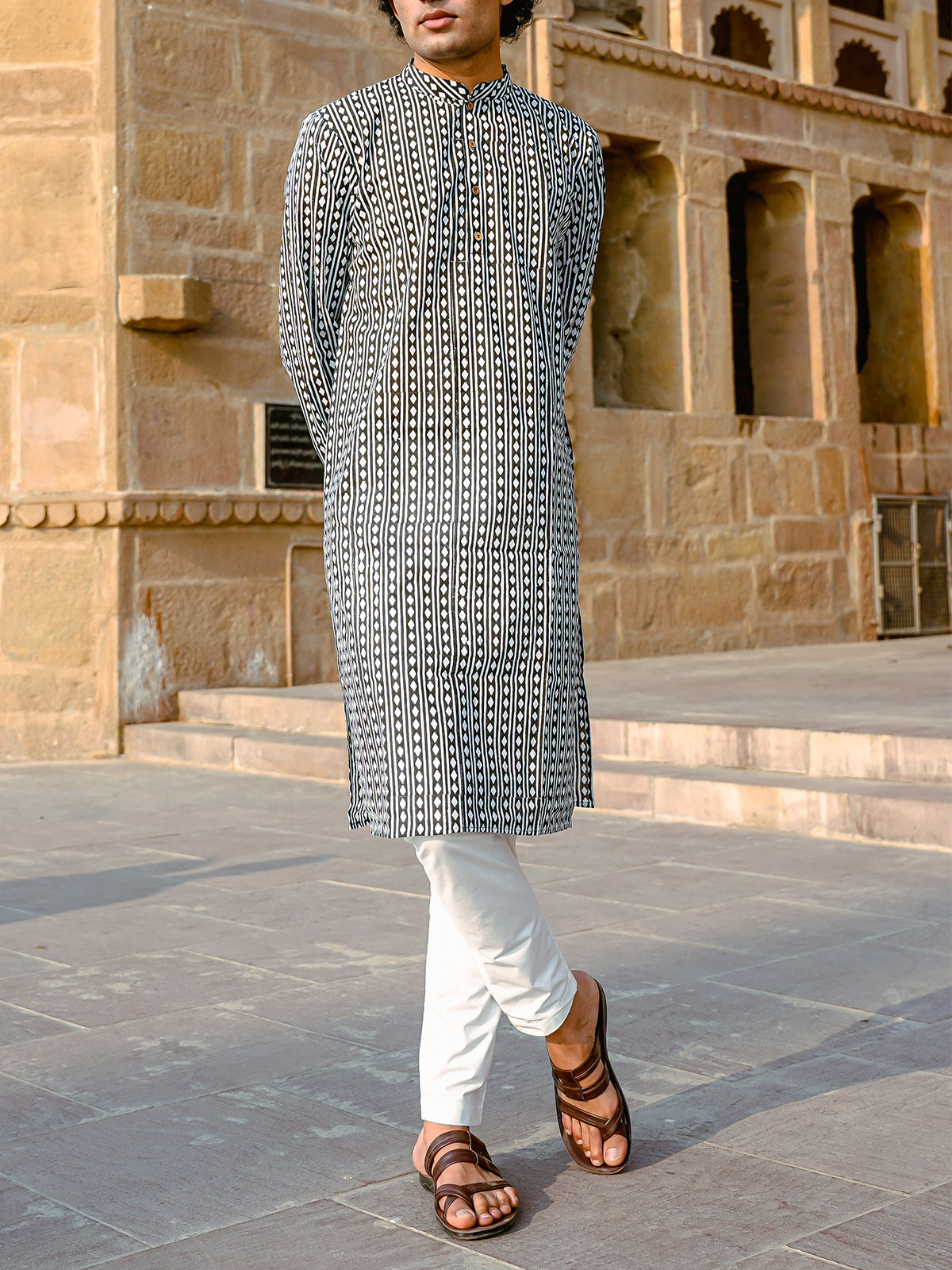 With full sleeves and regular fit, this long sleeve kurta features a Nehru collar with a zade black geomatric hand block pattern. Crafted in a light, premium breathable hand block printed cotton fabric.