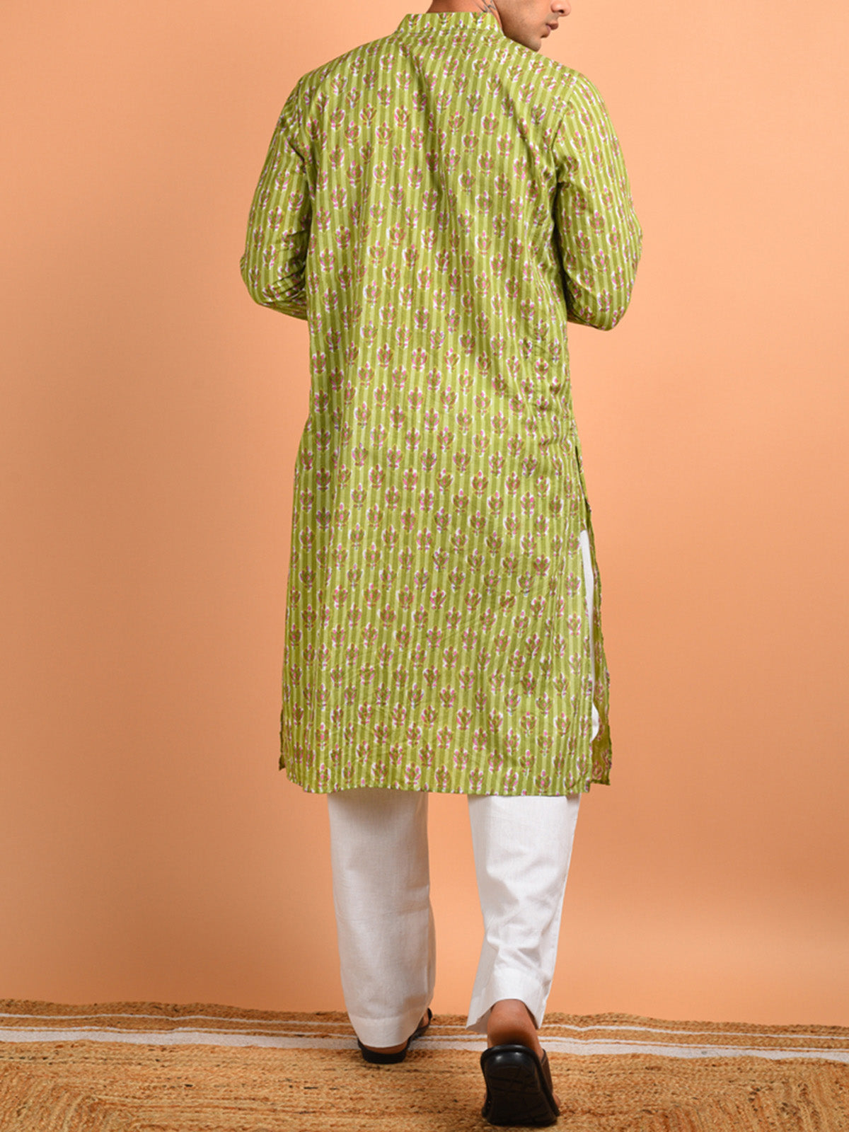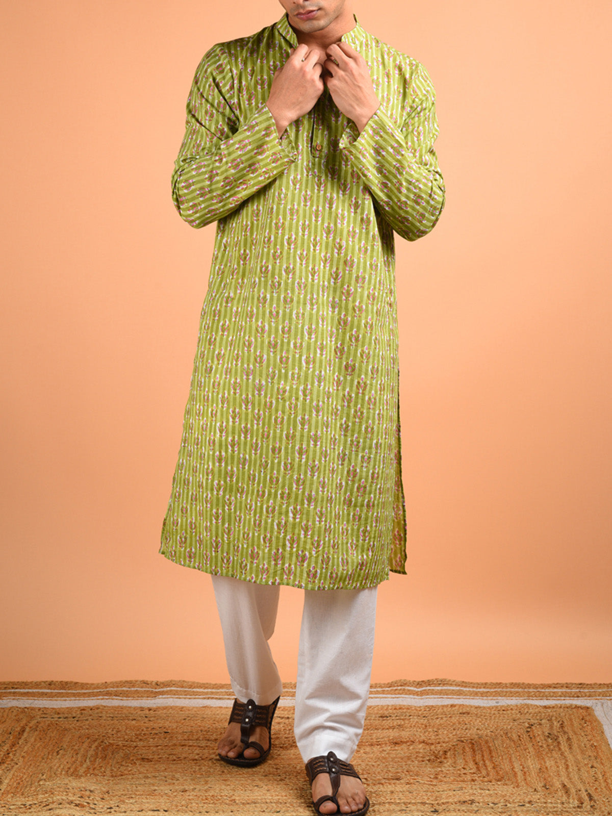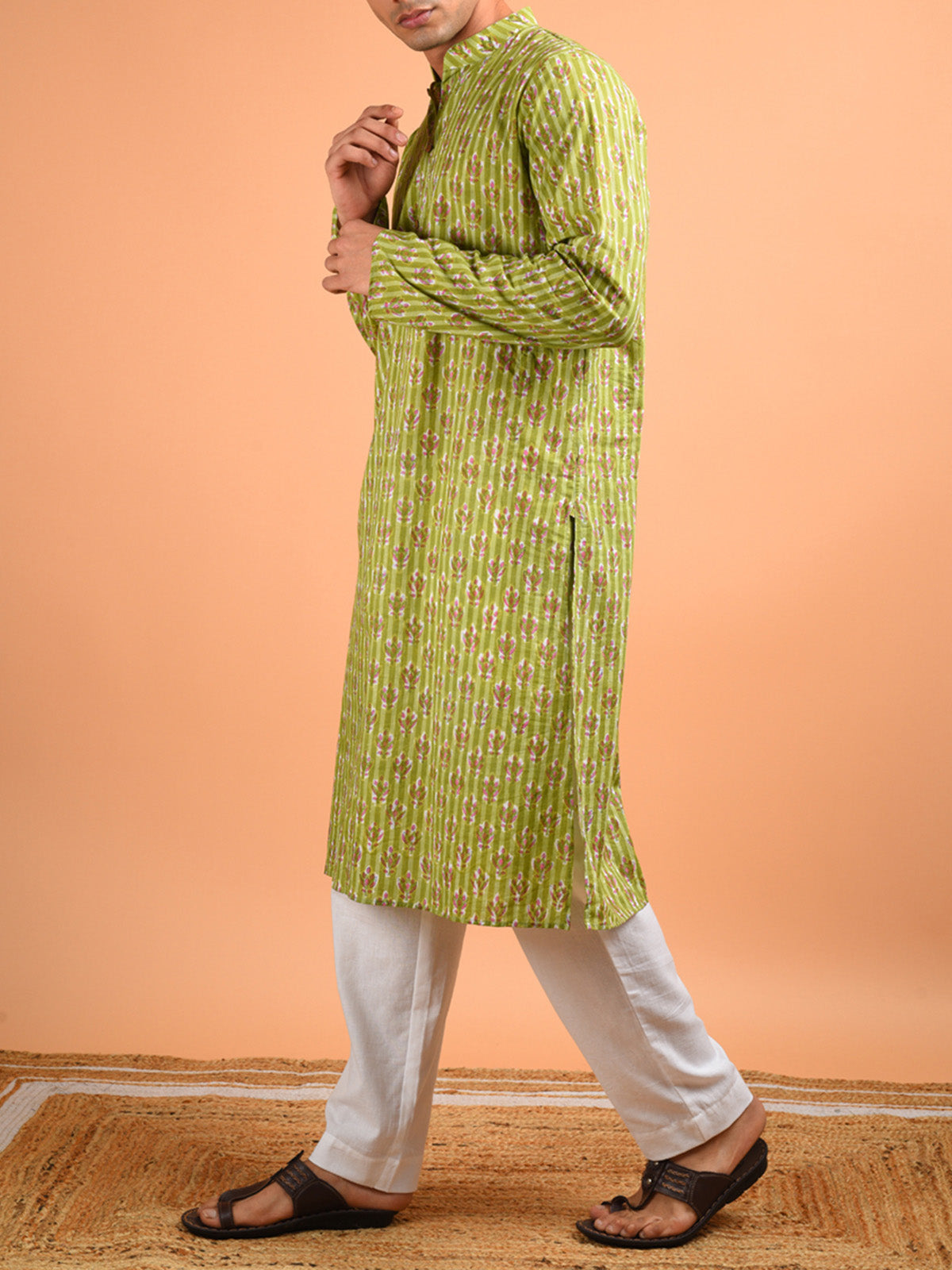 Present a suave, charming ethnic look with this hand block printed kurta. The style elements include a mandarin collared neck with a half front placket and full sleeves. Crafted in a light, premium breathable hand block printed cotton fabric.