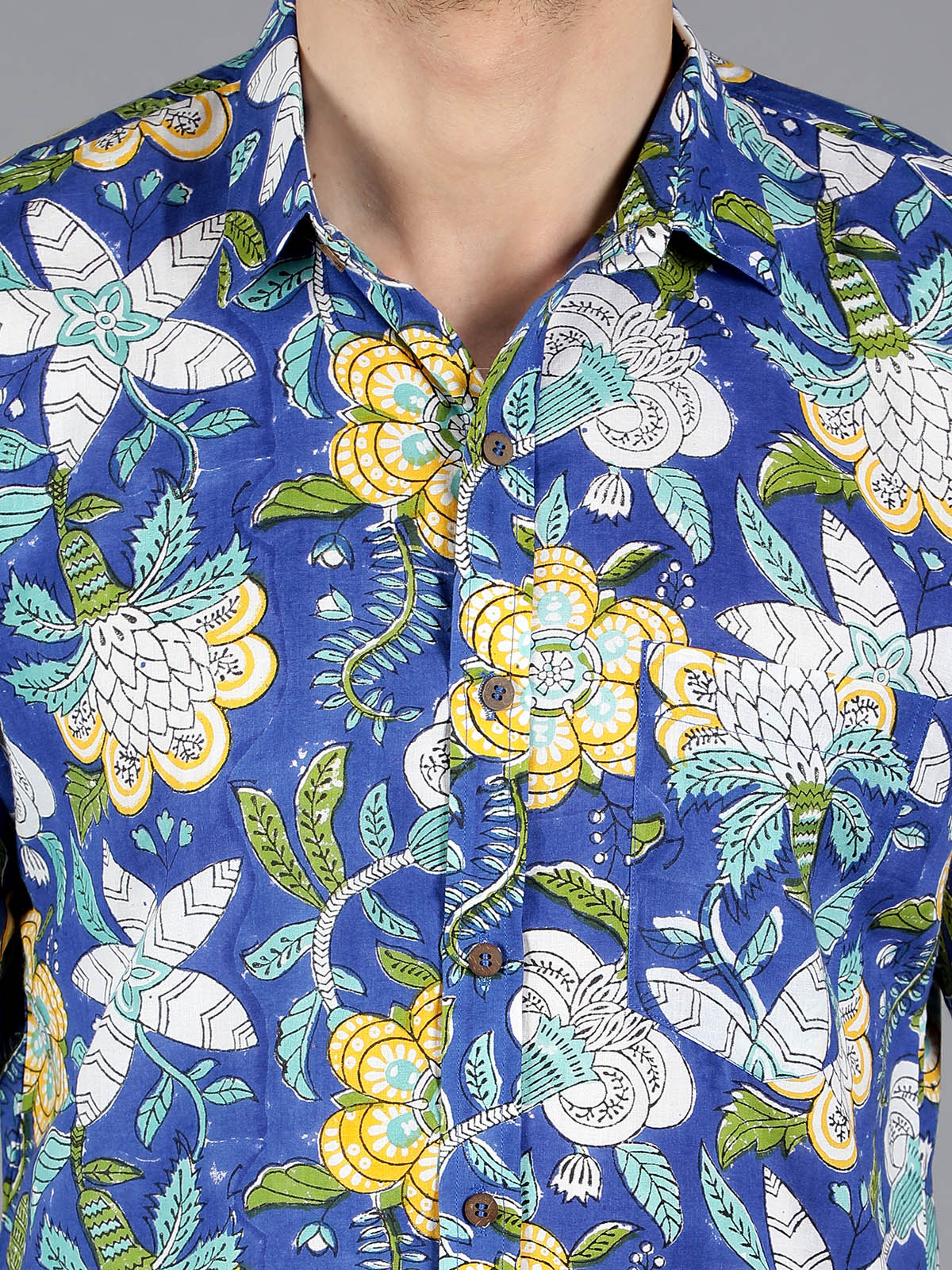 The Milkyway Handblock Printed Shirt in blue adds a celestial touch to your summer wardrobe. Crafted from pure cotton and featuring delicate floral motifs, this shirt combines charm with sustainability. Complete with coconut shell buttons, it embodies ethical fashion and is proudly made in India with eco-friendly materials.