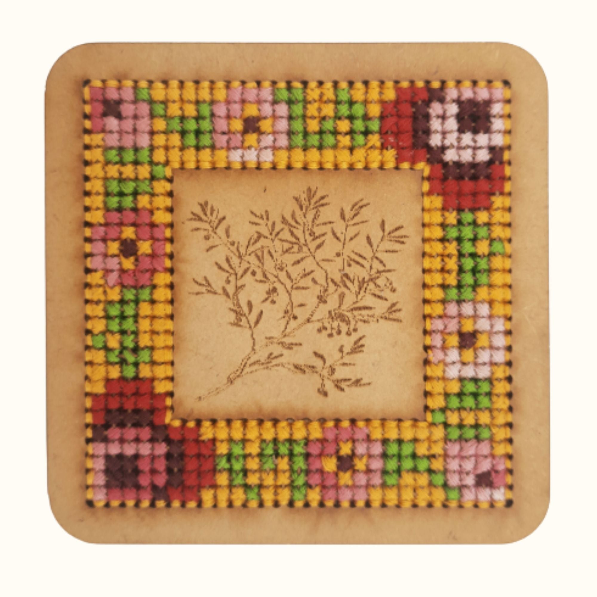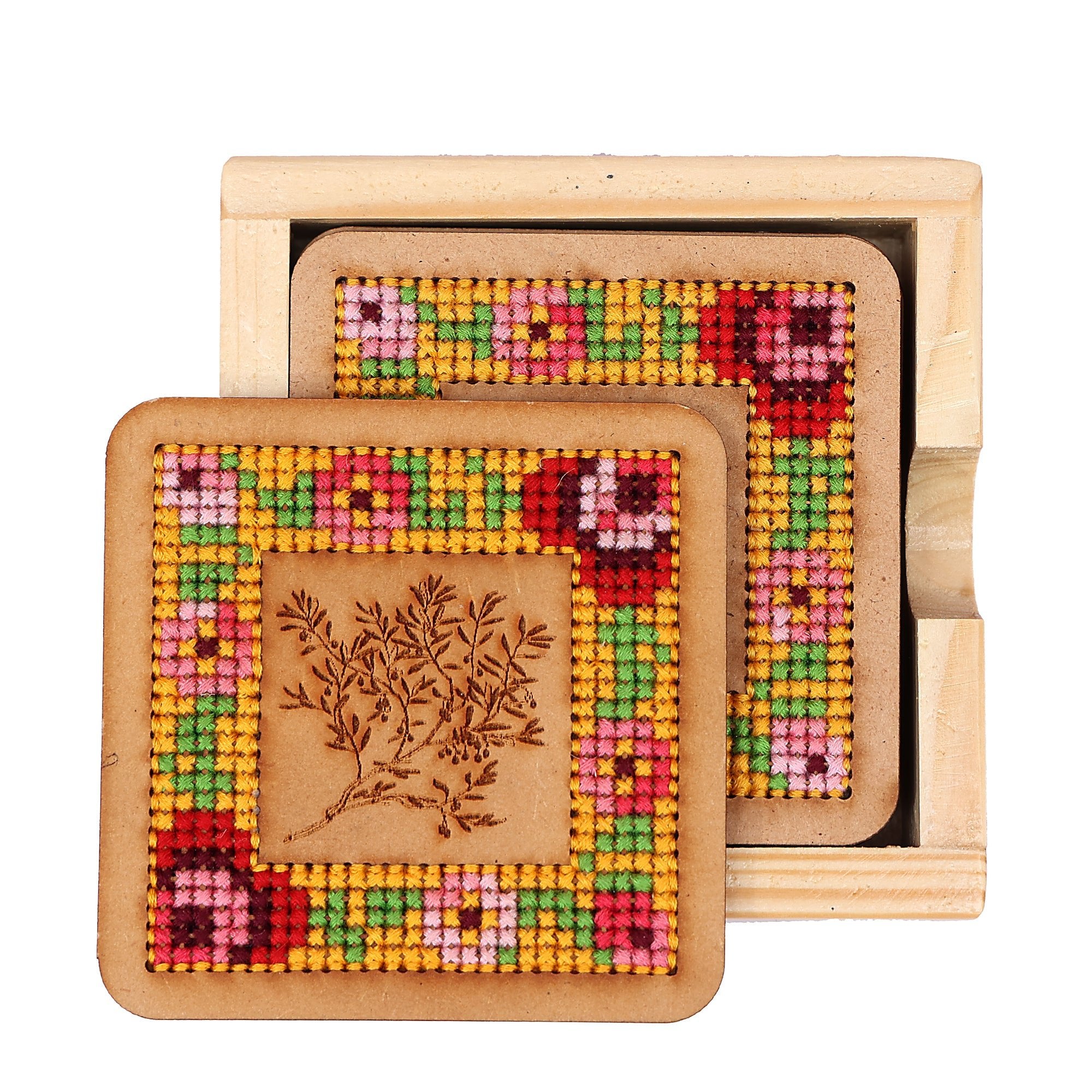 The Wooden Coaster is a stylish and practical addition to any table or surface. Crafted from high quality wood. It combines natural beauty with Cross stitch. The coaster Provides a stable base for drinks, Protecting your furniture from stains and marks. Its minimalist design and earthy tones bring a touch of elegance to your home decor.